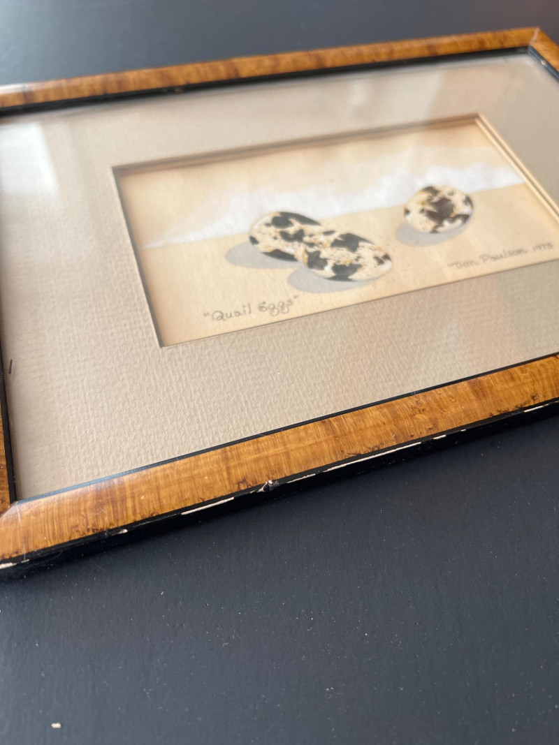 "Quail Eggs" by Don Paulsen (1939-2006). Collection of papers held at the University of Washington libraries. Don was an artist and author in the Seattle area. He attended Auburn High School, served in the U.S. Army for two years, lived in New York and Los Angeles and returned to Seattle in 1966. He then devoted himself to painting. Paulson was a contributor to "Seattle Gay News" and formed a friendship with Skippy LaRue. The Paulson papers are comprised of textual materials, sound recordings, videocassettes, programs, handbills and sheet music relating to Paulson's life as an artist. This particular artwork, created in 1973, showcases Paulson’s skill in capturing natural elements with soft, fluid brushstrokes. The gentle hues and intricate shading bring out the texture of the quail eggs, making them appear almost tangible. His ability to evoke warmth and depth in his compositions is a hallmark of his artistic style. Signed in pencil by Don Paulson, 1973.