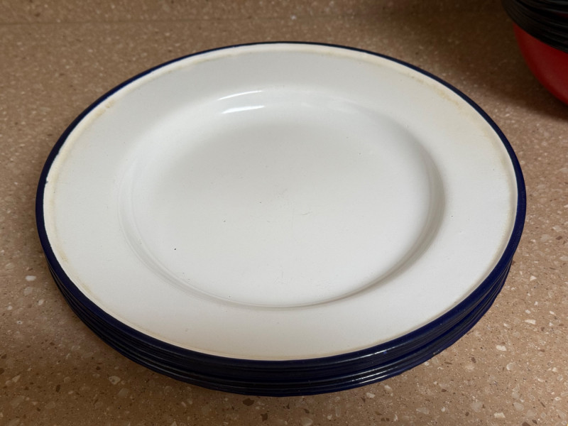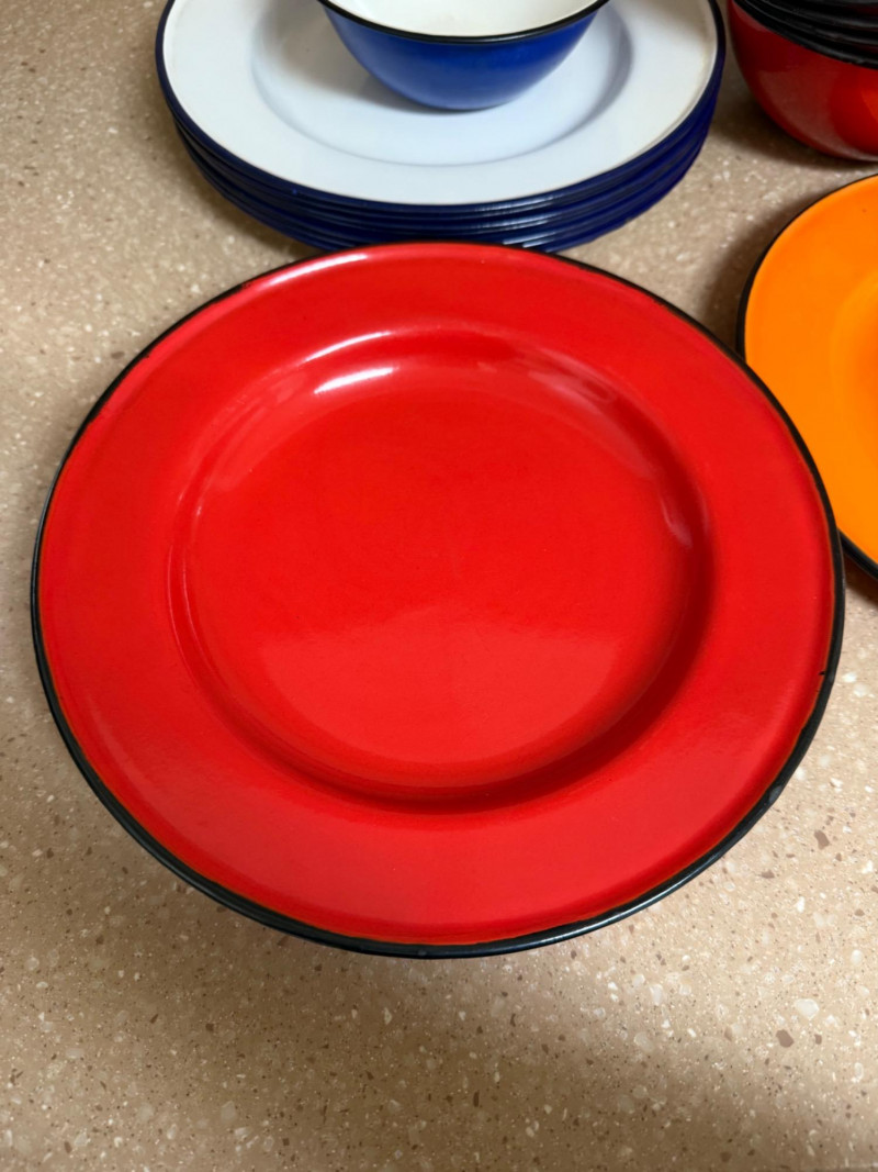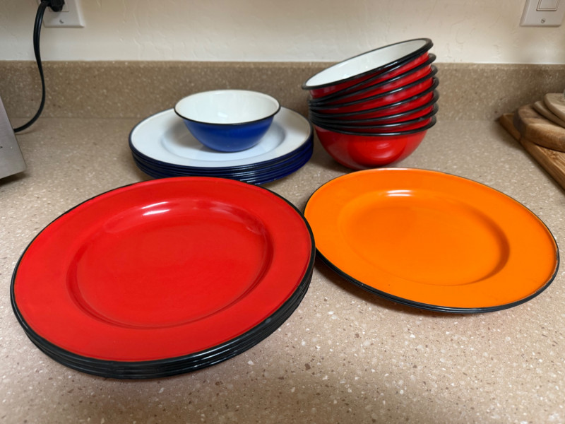 two orange plates, six red plates, eight blue and white plates, one small blue bowl and eight red bowls