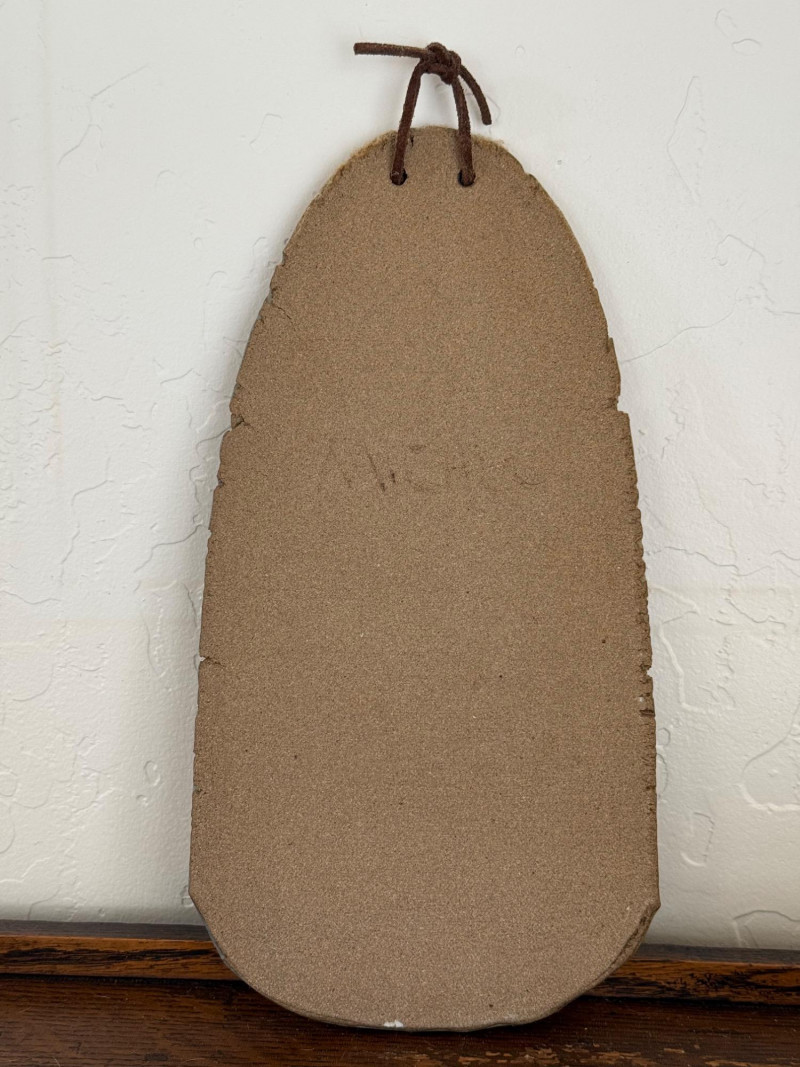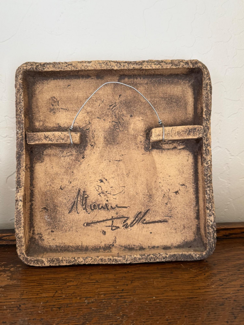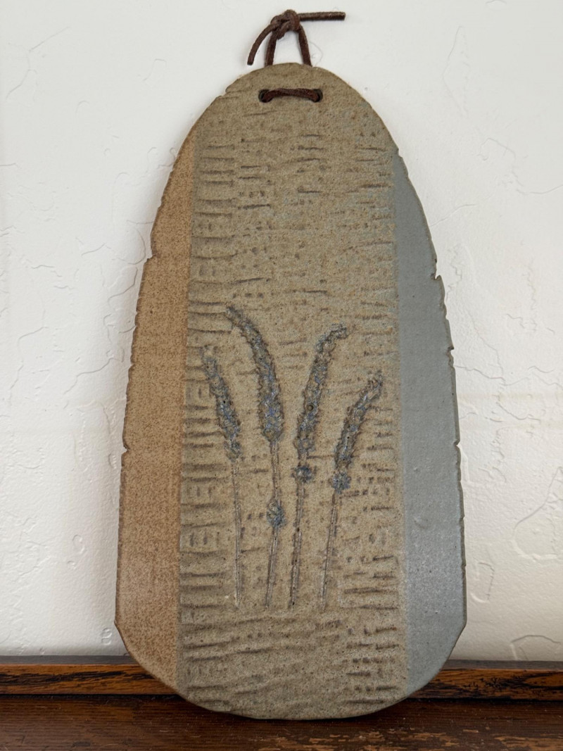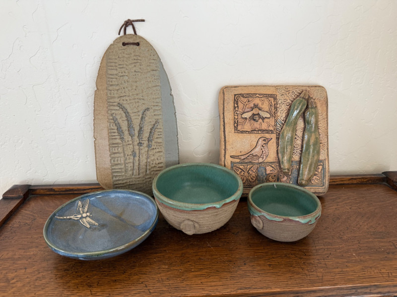 Lavender plaque is 11 inches tall. Bowls measure 2 to 2 1/4 inches tall.