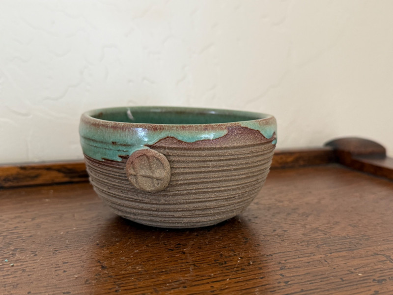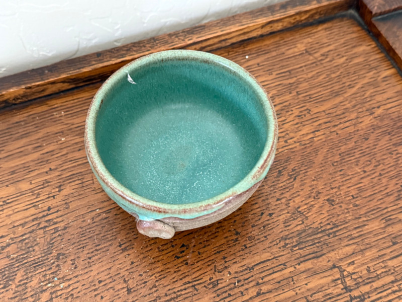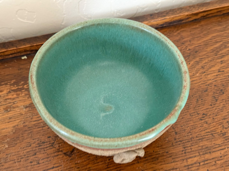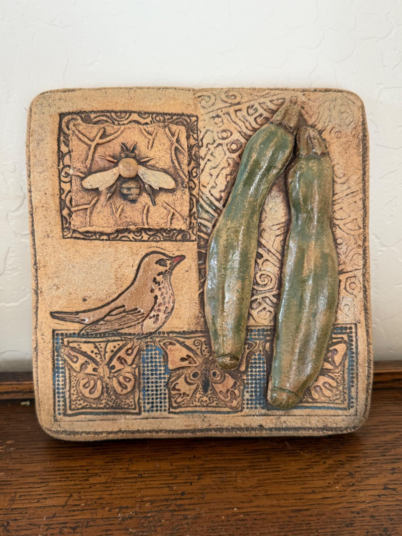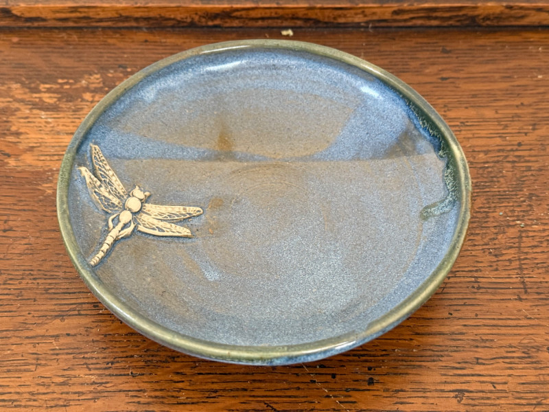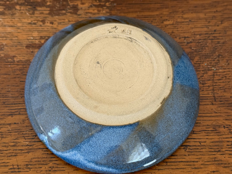 Lavender plaque is 11 inches tall. Bowls measure 2 to 2 1/4 inches tall.