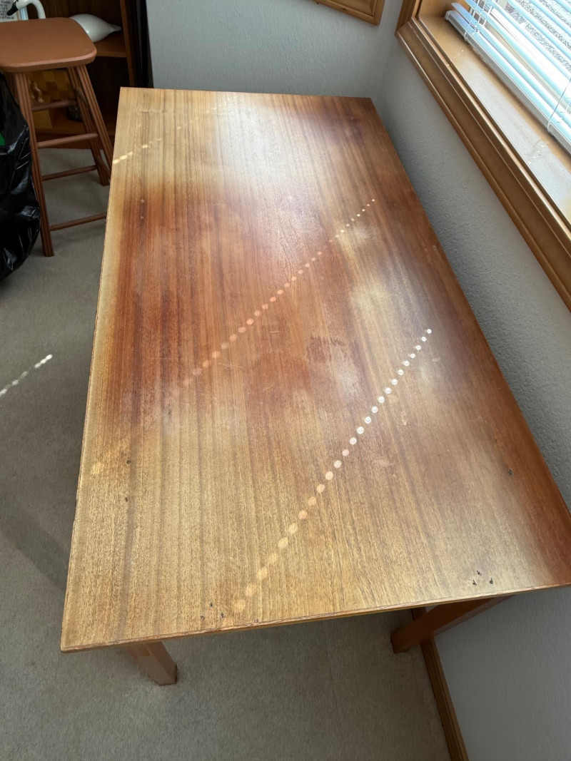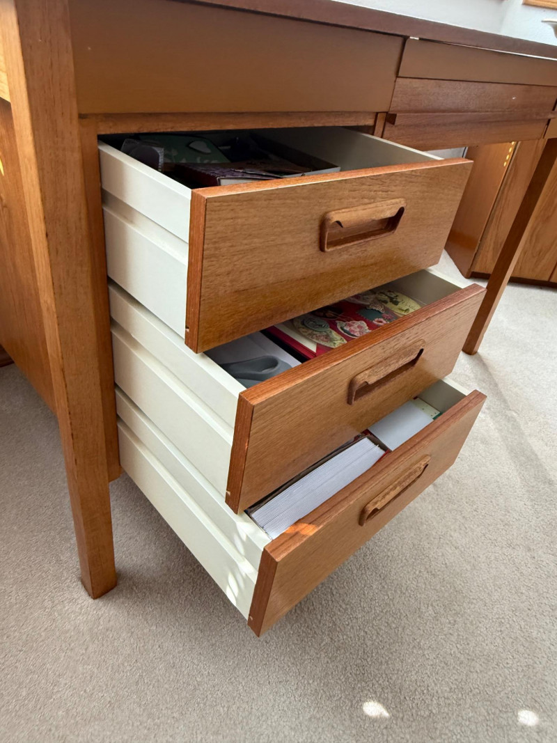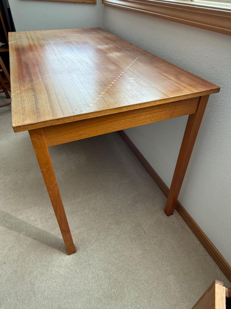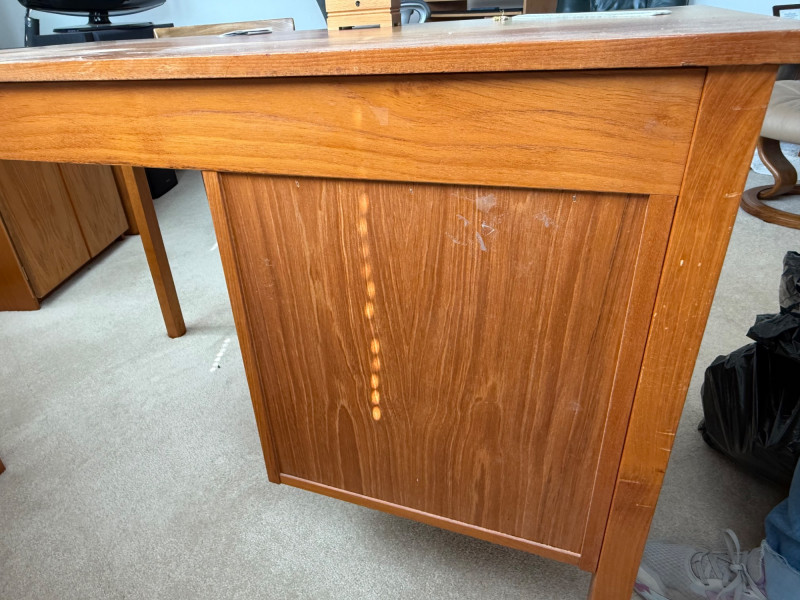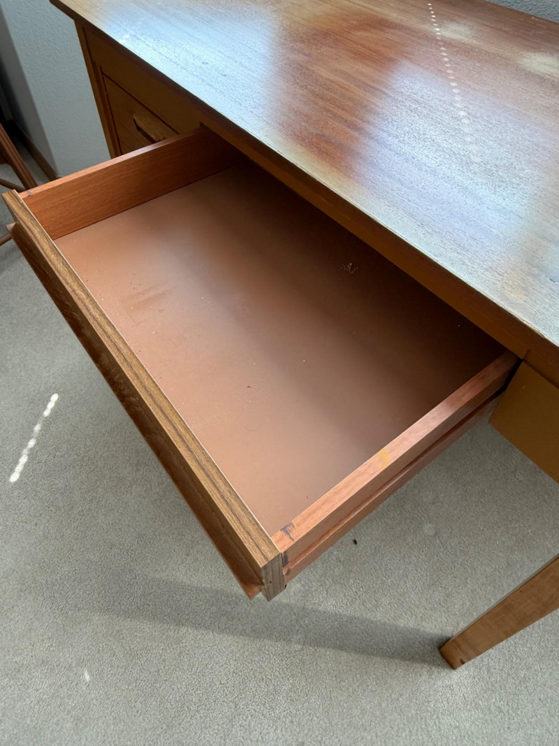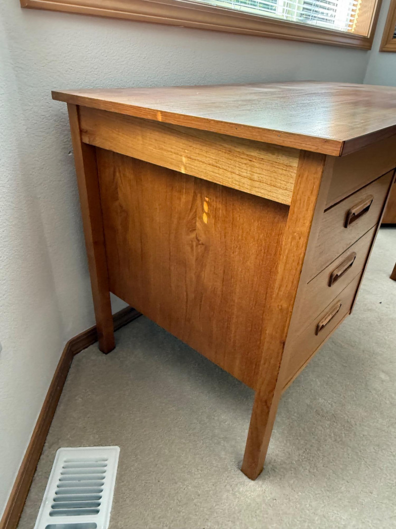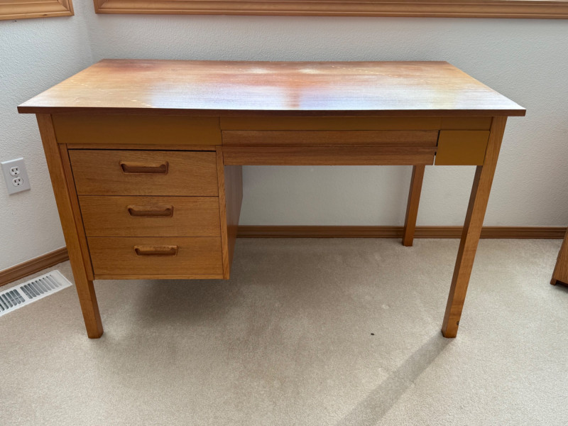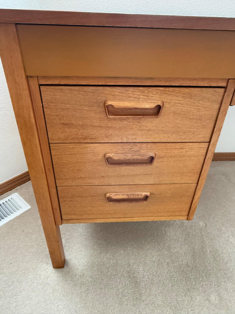 Classic Mid-Century Modern desk featuring clean lines, warm wood tones, and practical functionality. This vintage piece includes three drawers with sculpted wood handles on the left and a wide center drawer for additional storage. The compact size makes it ideal for home offices, studios, or small workspaces. A slight patina on the desktop adds character without compromising usability. Dimensions: 45.5” W x 27.5” H x 23.5” D Solid and stylish, this desk blends seamlessly into retro, modern, or Scandinavian-inspired interiors. Bidding on this lot is an agreement that: (1.) You will have at least 2 capable, able-bodied persons to lift and load at a minimum. (2.) You will bring a hand truck and/or any other tools needed to remove this item. If these steps are not followed your item will be forfeited and no refund given.