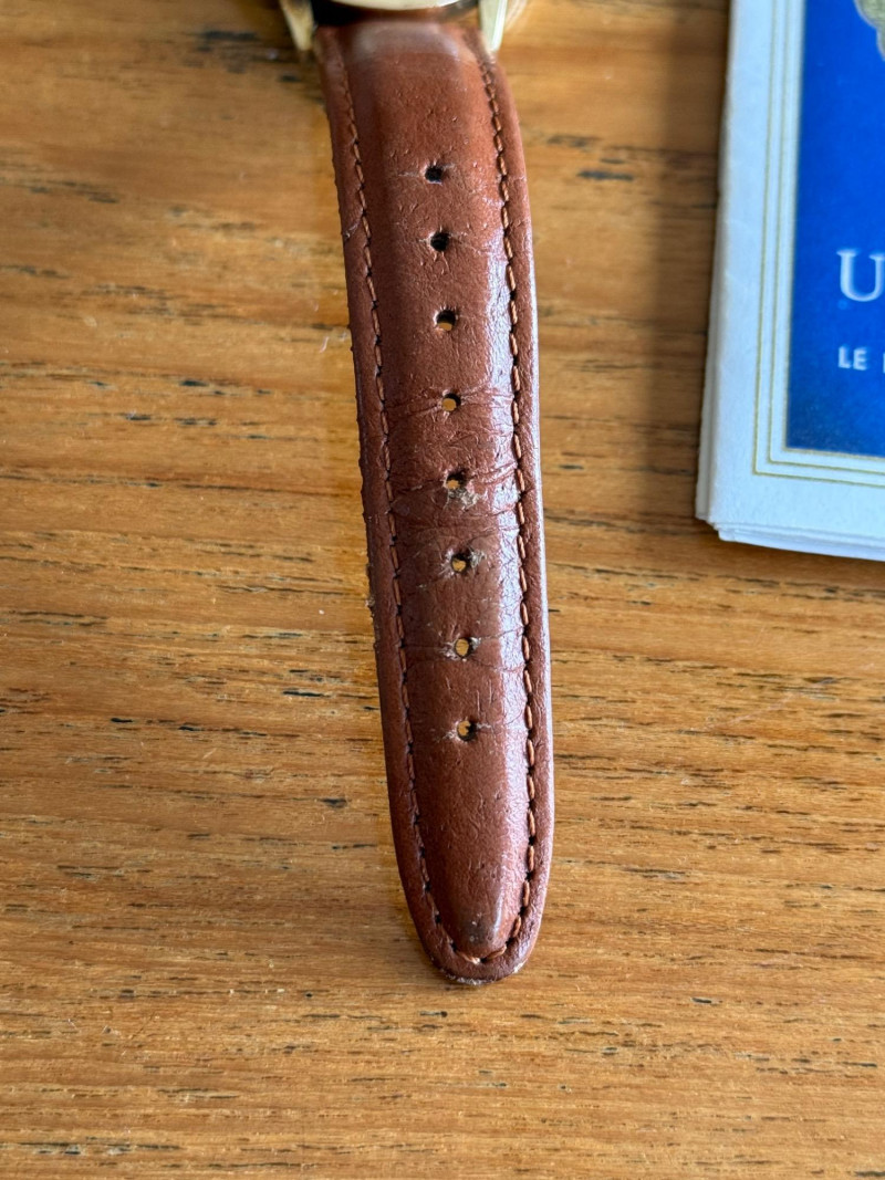 Ulysse Nardin Men’s Sea-Hawk Watch – 10K Gold-Filled, Wind-Up, Runs Classic Ulysse Nardin Sea-Hawk men’s wristwatch with a timeless design and Swiss craftsmanship. The case is 10K gold-filled—a thick layer of 10K gold bonded over base metal—paired with a brown leather strap. Included is the original Ulysse Nardin booklet, highlighting the brand’s prestigious history in marine chronometers and fine Swiss watchmaking.