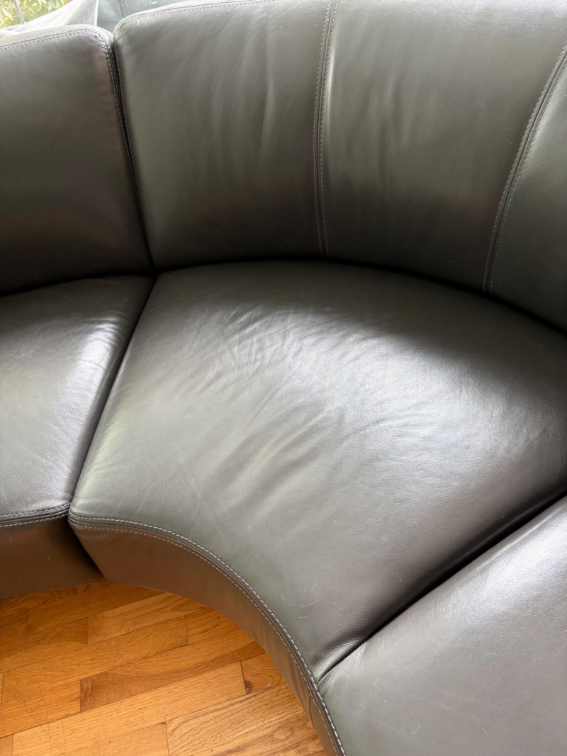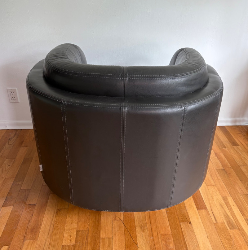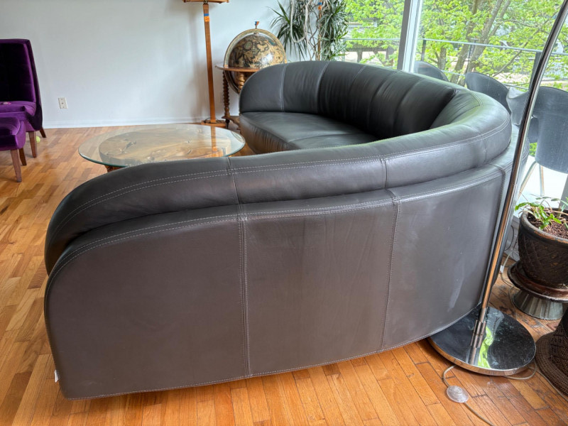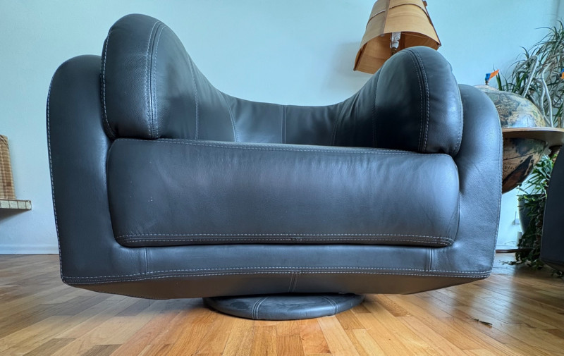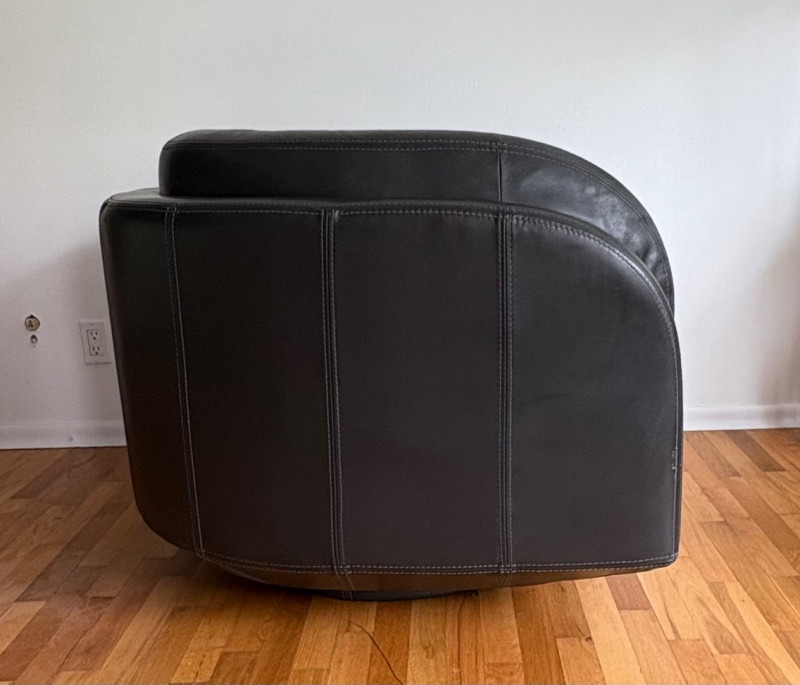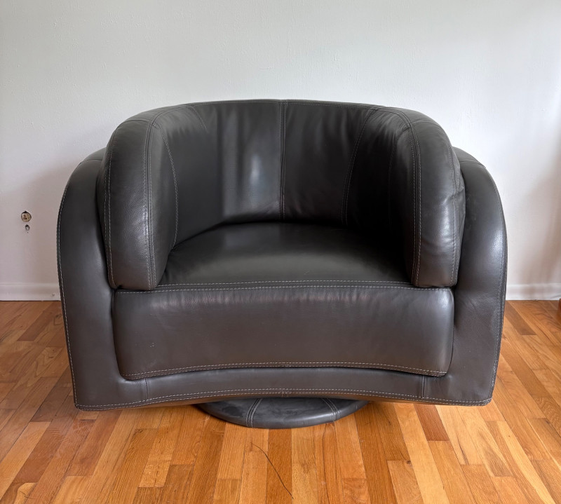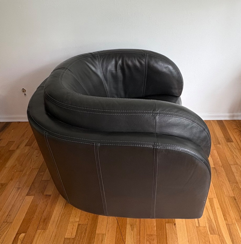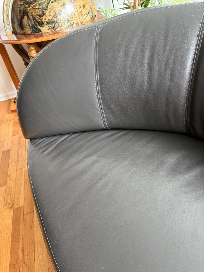 Wonderful large modern sofa & matching chair in quality leather from German manufacturer Willi Schillig. Curved backwards "L" shaped sofa has attached tight-back cushions and white top-stitching on gray-black leather. In very good condition with only a few minor flaws/scratches noted - no holes or anything egregious - see last 3 photos. The L shape measures approximately 80" on the short leg by 116" on the long leg. Height of the back covered frame is 28" with the back cushion extending up further another 4". Seat deck is 16" and total sofa depth is approx. 36". Sofa breaks apart into two sections for ease of moving. Matching leather swivel chair is also tight-back with attached cushion in a horseshoe-shaped frame. In excellent condition with no leather flaws noted. Height of the back covered frame is 28" with the back cushion extending up further another 4". Seat deck is 16" and total chair depth is approx. 36" with the width approx. 38". Ready for a new home - would work well in an MCM home as well as a contemporary home. Local Pickup Only. Bidding on this lot is an agreement that: (1.) You will have 2 capable, able-bodied persons to lift and load at a minimum. (2.) You will bring a hand truck and/or any other tools needed to remove this item. If these steps are not followed your item will be forfeited and no refund given.