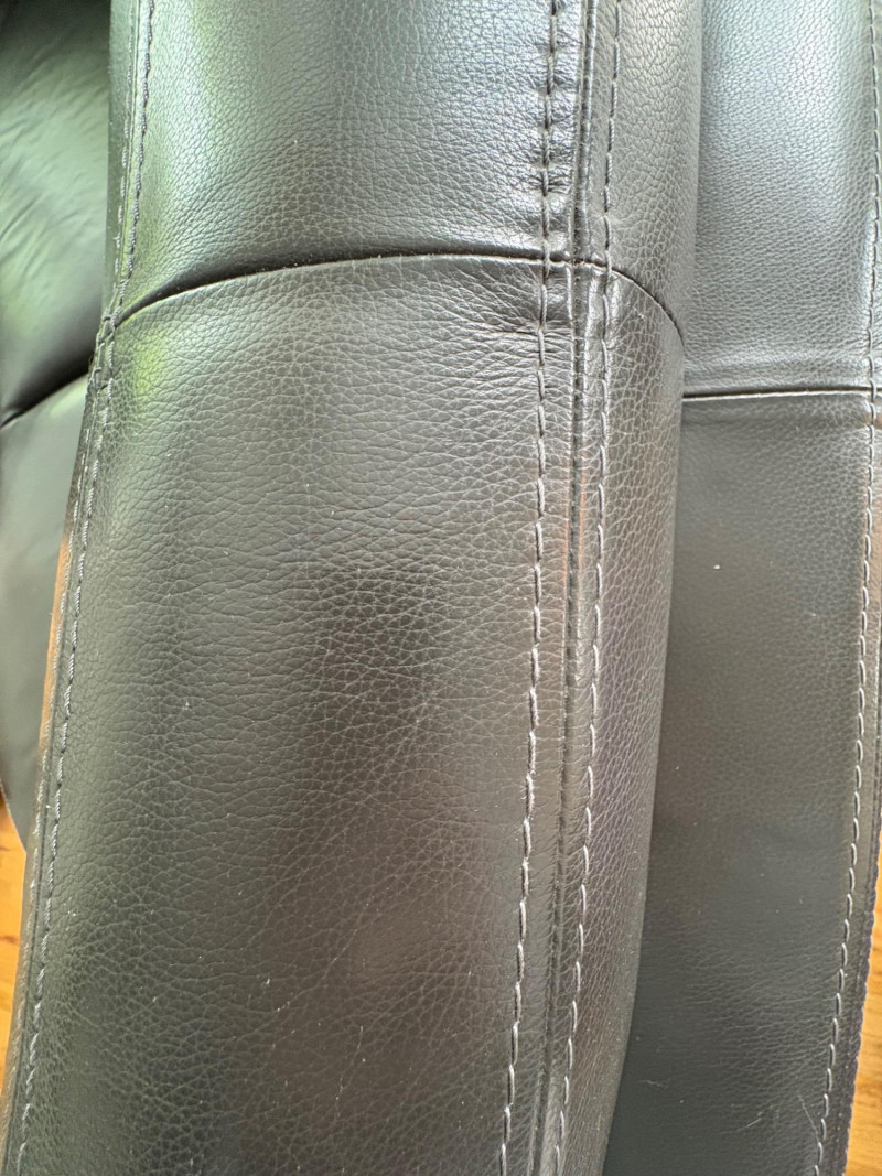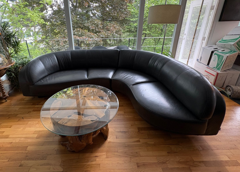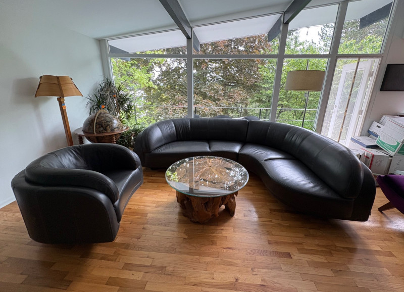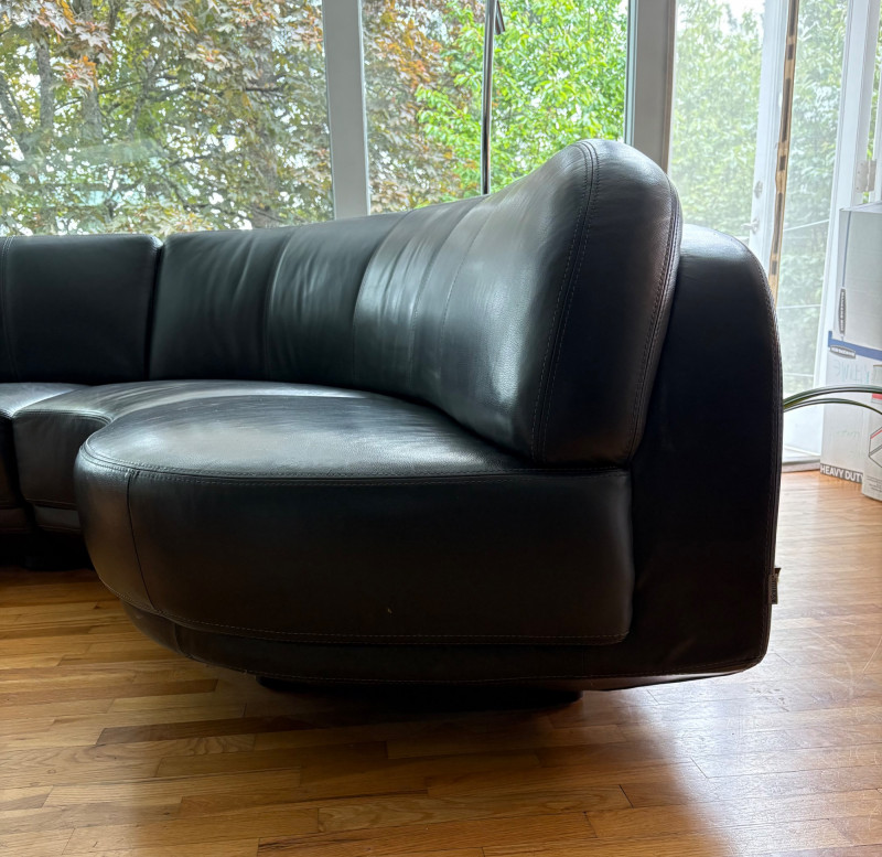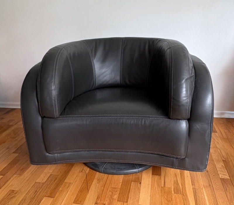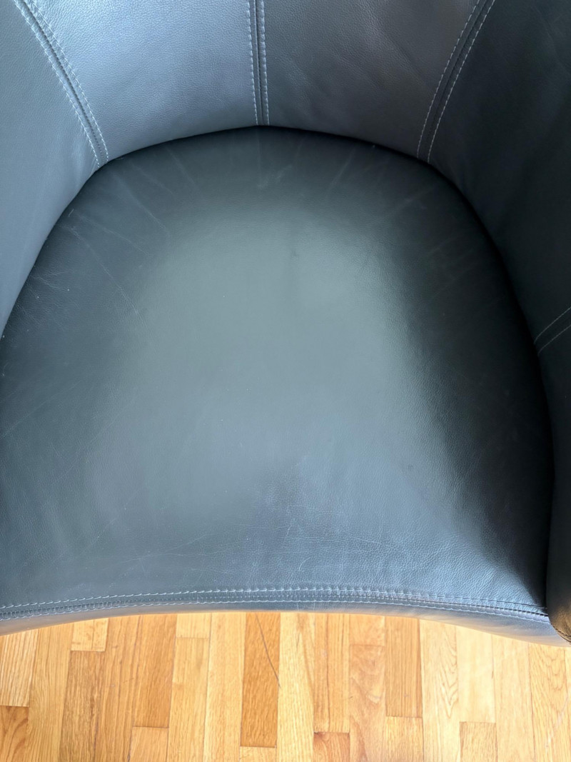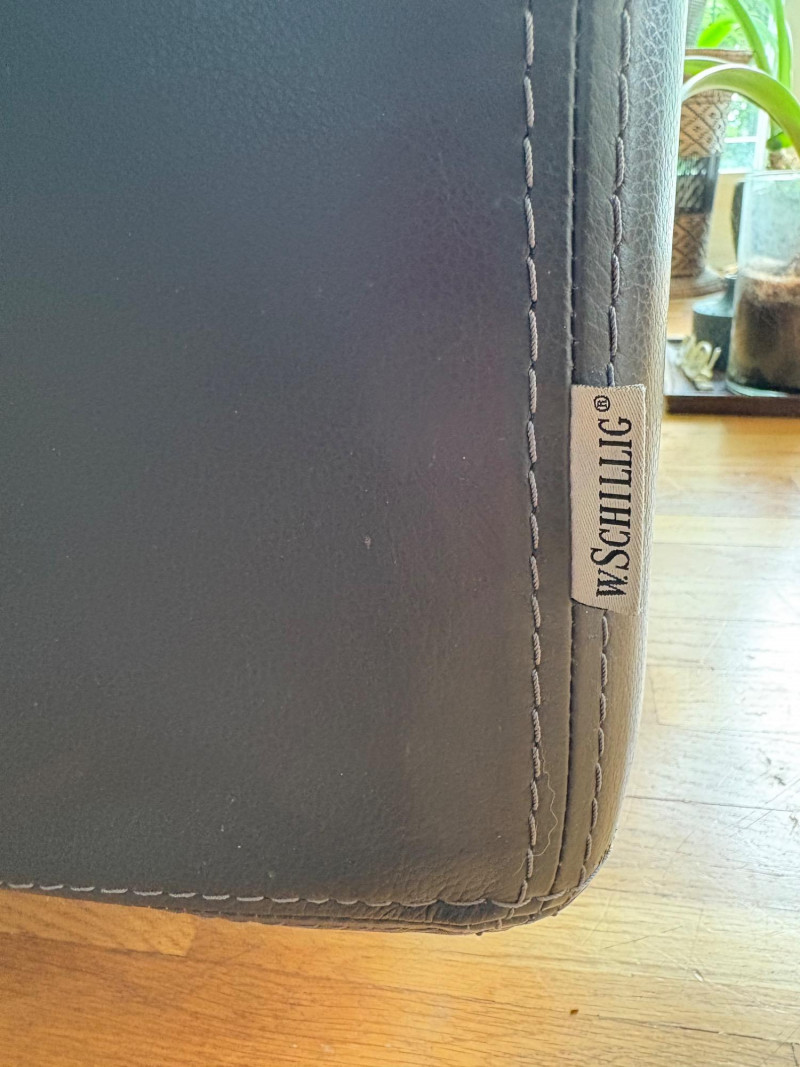 Wonderful large modern sofa & matching chair in quality leather from German manufacturer Willi Schillig. Curved backwards "L" shaped sofa has attached tight-back cushions and white top-stitching on gray-black leather. In very good condition with only a few minor flaws/scratches noted - no holes or anything egregious - see last 3 photos. The L shape measures approximately 80" on the short leg by 116" on the long leg. Height of the back covered frame is 28" with the back cushion extending up further another 4". Seat deck is 16" and total sofa depth is approx. 36". Sofa breaks apart into two sections for ease of moving. Matching leather swivel chair is also tight-back with attached cushion in a horseshoe-shaped frame. In excellent condition with no leather flaws noted. Height of the back covered frame is 28" with the back cushion extending up further another 4". Seat deck is 16" and total chair depth is approx. 36" with the width approx. 38". Ready for a new home - would work well in an MCM home as well as a contemporary home. Local Pickup Only. Bidding on this lot is an agreement that: (1.) You will have 2 capable, able-bodied persons to lift and load at a minimum. (2.) You will bring a hand truck and/or any other tools needed to remove this item. If these steps are not followed your item will be forfeited and no refund given.