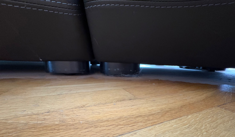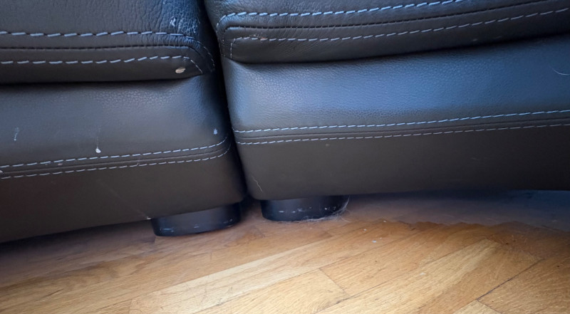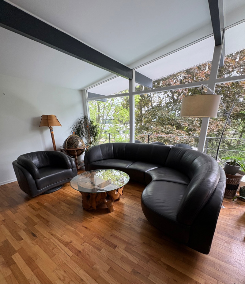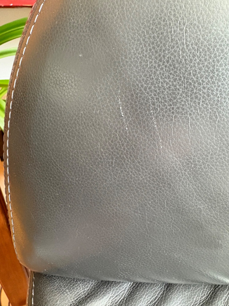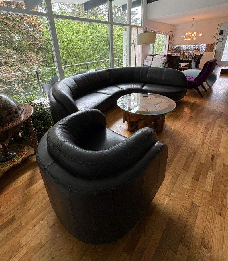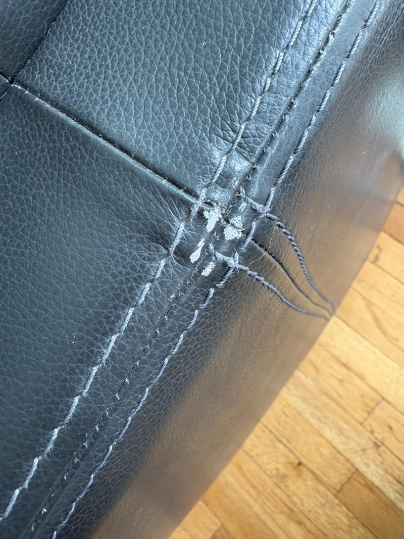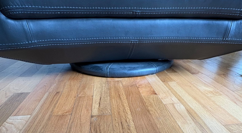 Wonderful large modern sofa & matching chair in quality leather from German manufacturer Willi Schillig. Curved backwards "L" shaped sofa has attached tight-back cushions and white top-stitching on gray-black leather. In very good condition with only a few minor flaws/scratches noted - no holes or anything egregious - see last 3 photos. The L shape measures approximately 80" on the short leg by 116" on the long leg. Height of the back covered frame is 28" with the back cushion extending up further another 4". Seat deck is 16" and total sofa depth is approx. 36". Sofa breaks apart into two sections for ease of moving. Matching leather swivel chair is also tight-back with attached cushion in a horseshoe-shaped frame. In excellent condition with no leather flaws noted. Height of the back covered frame is 28" with the back cushion extending up further another 4". Seat deck is 16" and total chair depth is approx. 36" with the width approx. 38". Ready for a new home - would work well in an MCM home as well as a contemporary home. Local Pickup Only. Bidding on this lot is an agreement that: (1.) You will have 2 capable, able-bodied persons to lift and load at a minimum. (2.) You will bring a hand truck and/or any other tools needed to remove this item. If these steps are not followed your item will be forfeited and no refund given.