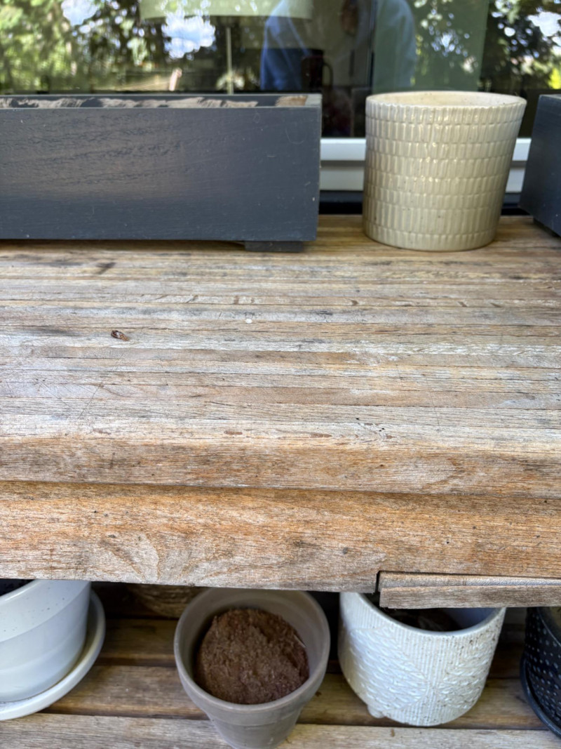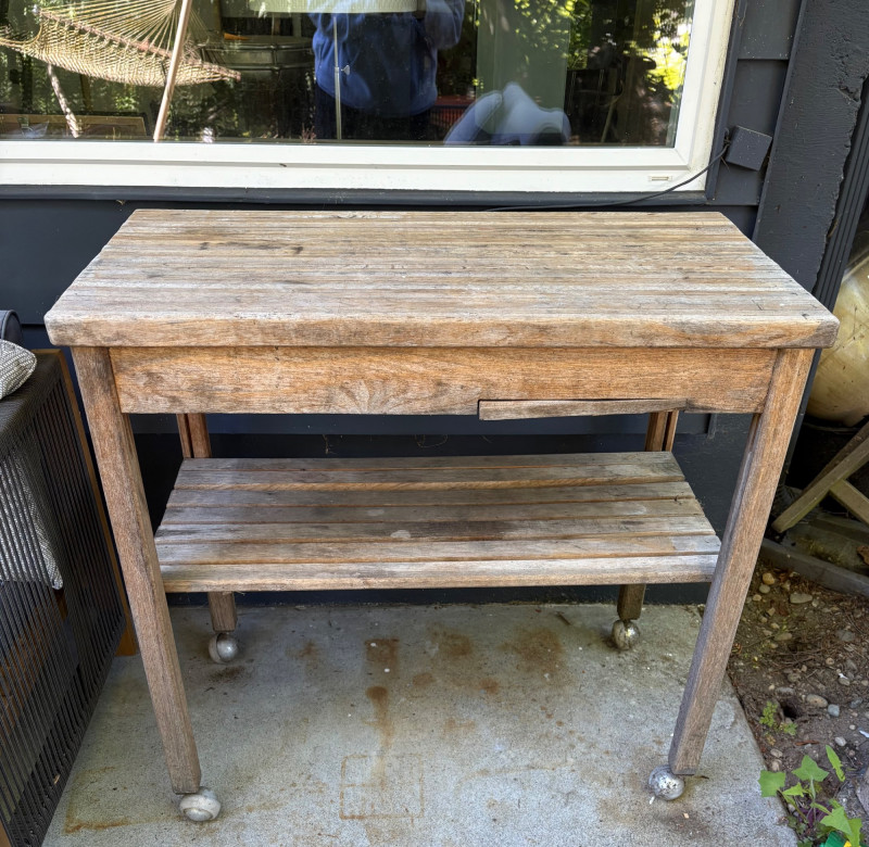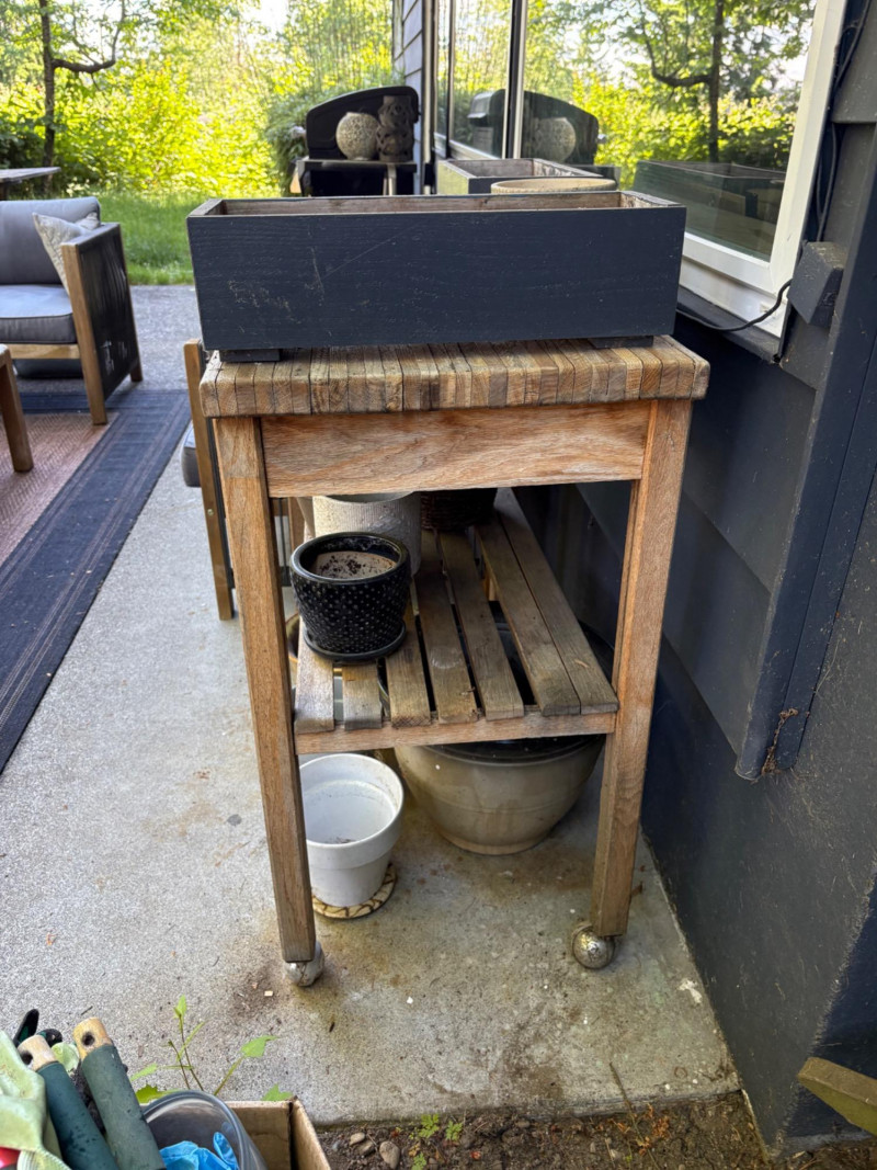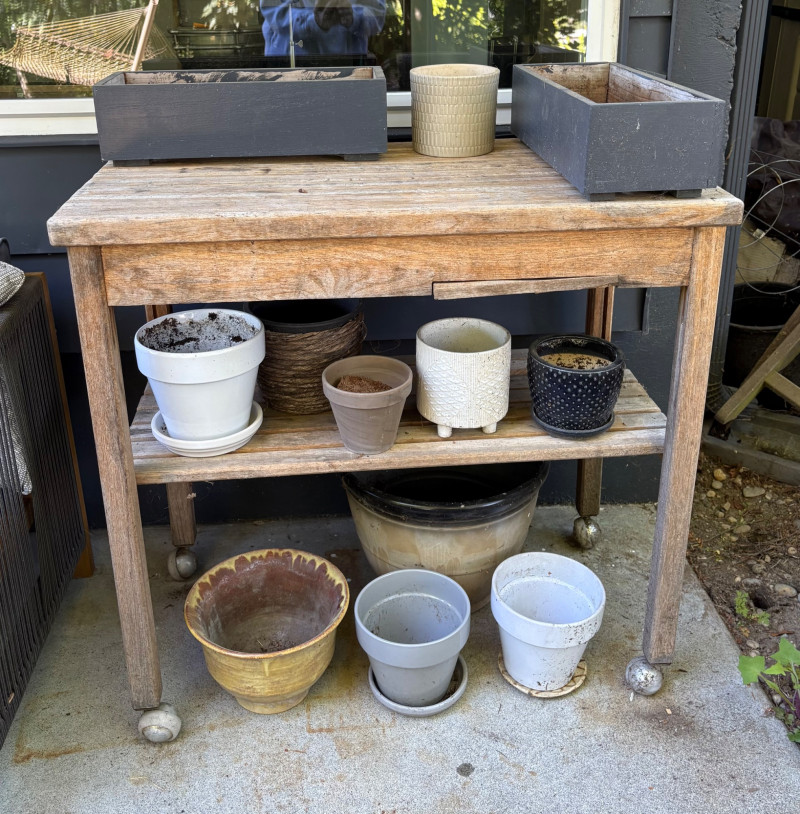 Weathered wooden potting table on casters with butcher block-type top and slatted second shelf. Small pull-out shelf below table top in front for single pot is in bad condition and we wouldn't consider it functional, but the rest of the table is in good condition. Lot includes all the pots seen here - most in ceramic with the rectangular ones in wood. Table measures 33.5" H x 35.5" W x 16.5" D. Please note: there are actually several more pots than pictured as we added more after photos were complete.