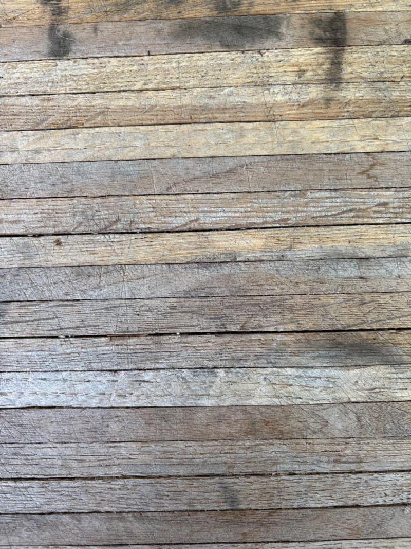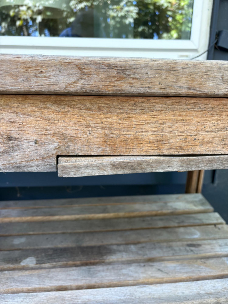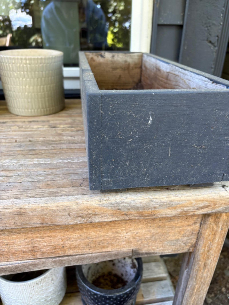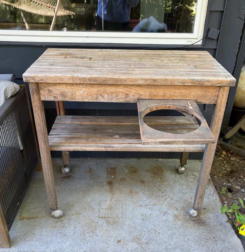 Weathered wooden potting table on casters with butcher block-type top and slatted second shelf. Small pull-out shelf below table top in front for single pot is in bad condition and we wouldn't consider it functional, but the rest of the table is in good condition. Lot includes all the pots seen here - most in ceramic with the rectangular ones in wood. Table measures 33.5" H x 35.5" W x 16.5" D. Please note: there are actually several more pots than pictured as we added more after photos were complete.