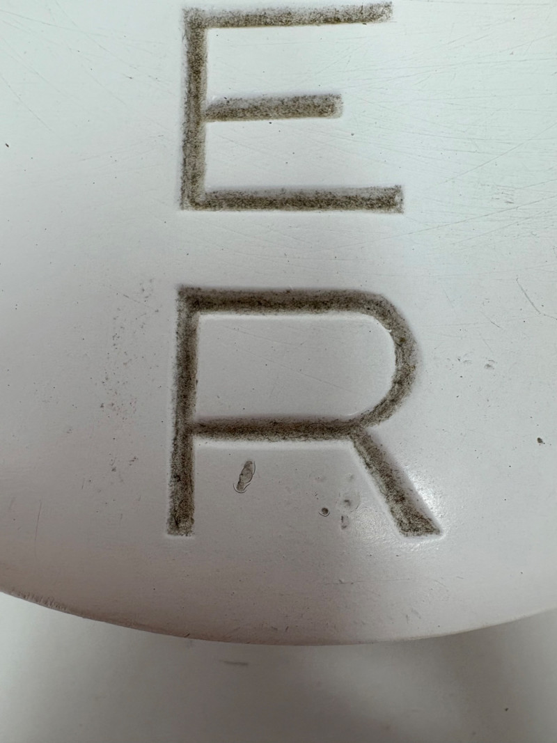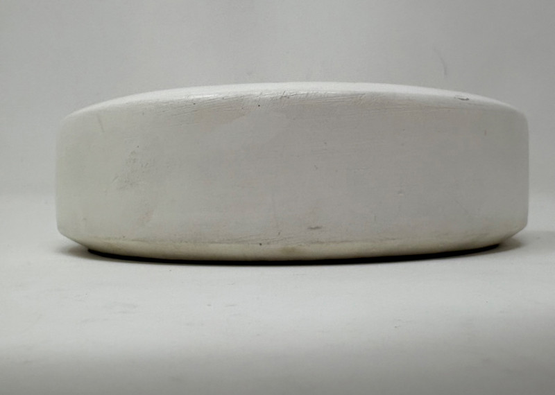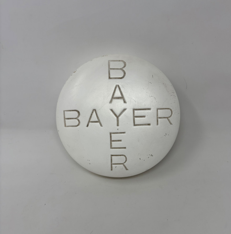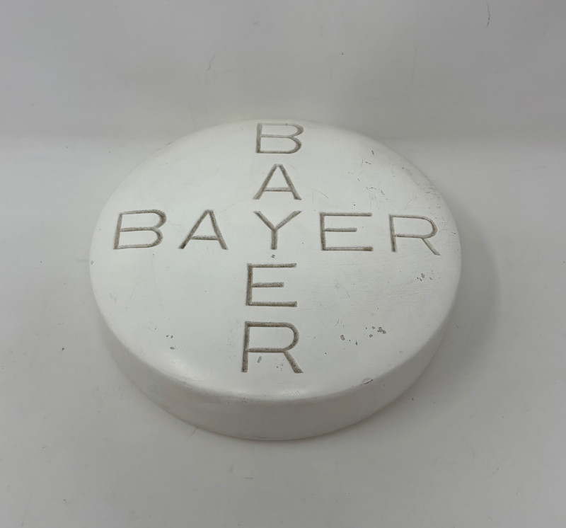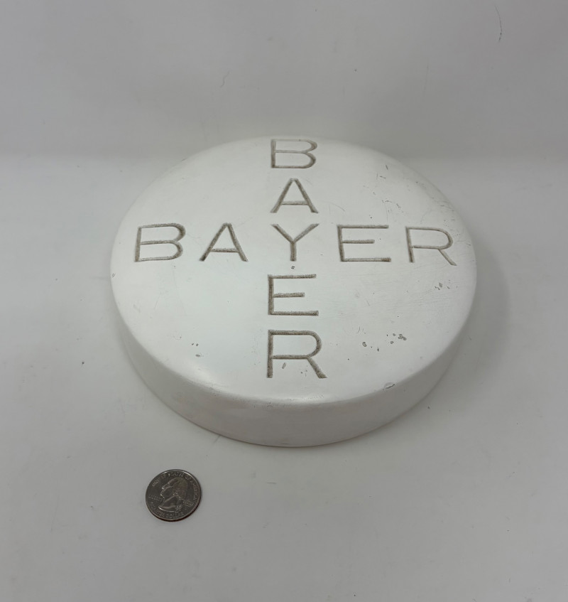 Giant-size vintage white Bayer aspirin tablet with name spelled out vertically and horizontally, just like on a regular aspirin tablet. Circa 1950s for promotion of Bayer aspirin sales in pharmacies. Measures approx. 7" in diameter by just shy 2" H and has felt on the bottom. Appears to be ceramic (weighs over 3 pounds) and has some wear due to age/display use, but still a great conversation piece.