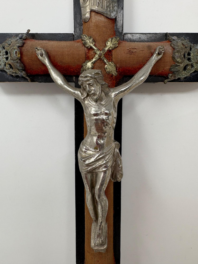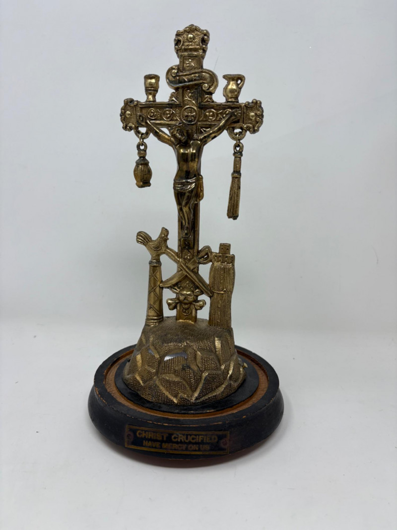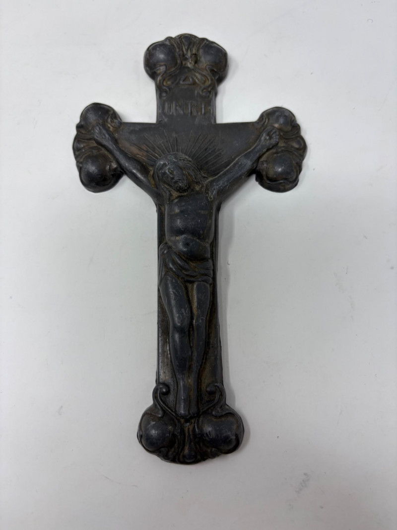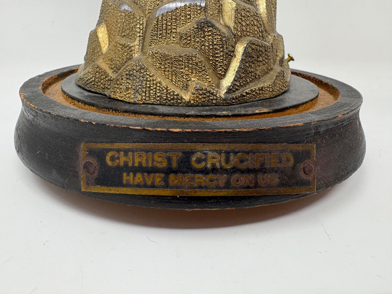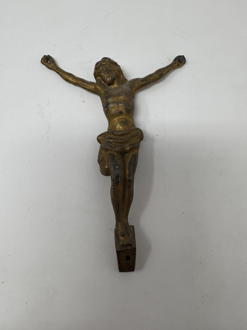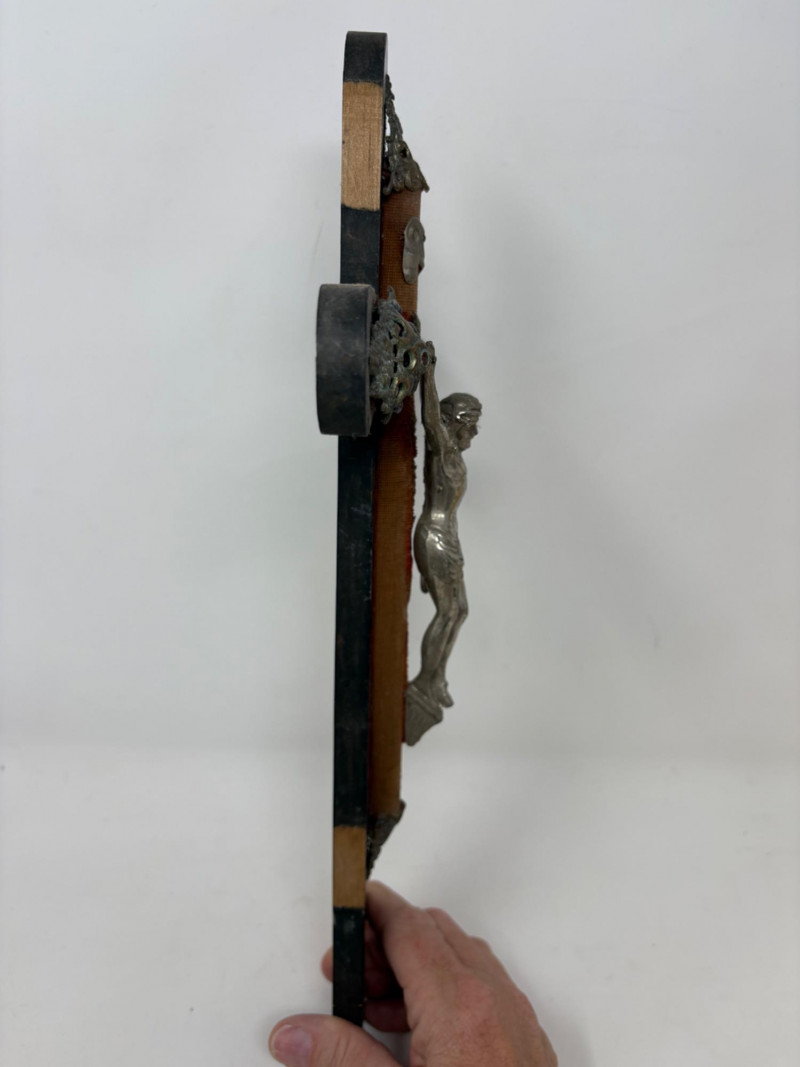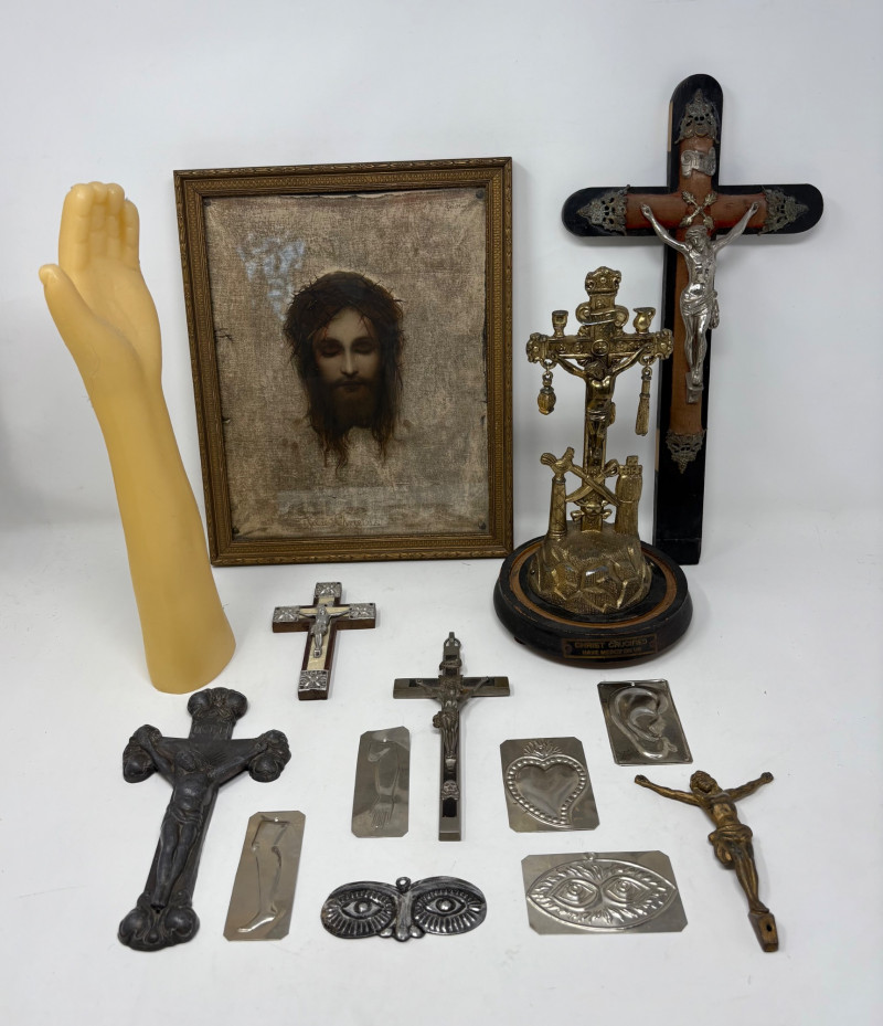 Wide range of Christian religious pieces from various sources – mostly European. Client collected religious artifacts wherever she traveled so these each have a story. Wax forearm/hand purchased at the Sanctuary of Our Lady Fatima pilgrimage site in Portugal. Measures 12.5" H. Portrait of Christ as if painted on a shroud. Creepy because depending on how you hold it, Jesus's eyes are either closed or staring right at you. Purchased in Paris from an antique dealer. Measures 12” H x 9.5" W framed. Antique black wooden crucifix with Christ on a very worn red velvet padded cross with brass details. From a church in southern France. Cross measures approximately 14" H x 7.5" W with the metal Christ figure measuring almost 6" H. Christ crucified mounted on a cloche base (glass is missing but could easily be replaced if desired). Metal plate affixed to base says "Christ Crucified - Have Mercy On Us". Various biblical references such as the cock crowing and the hill at Gethsemane. Purchased in a Paris antique gallery. Measures approximately 10" H x 6" in diameter at base 4 metal crucifixes of differing metals and creation methods. They vary in size from 7" H to 4.5" H. 6 embossed Mexican metal plates for prayer of recovery to a specific body part. They average about 3" in size..