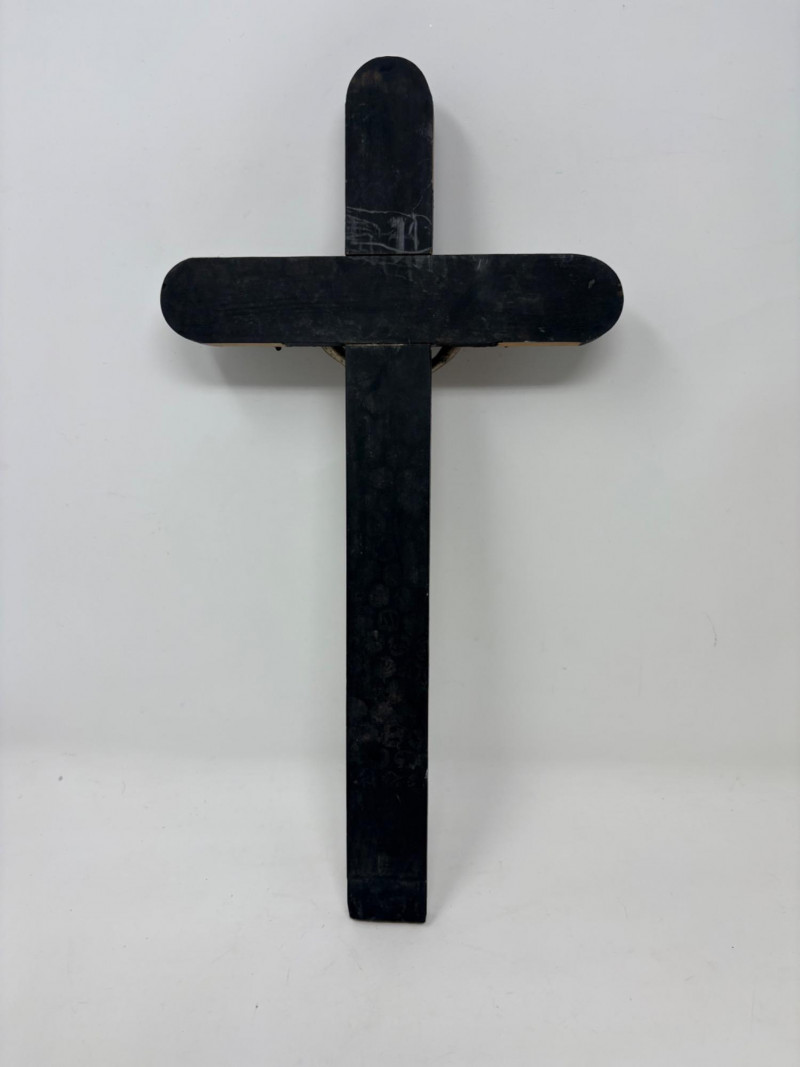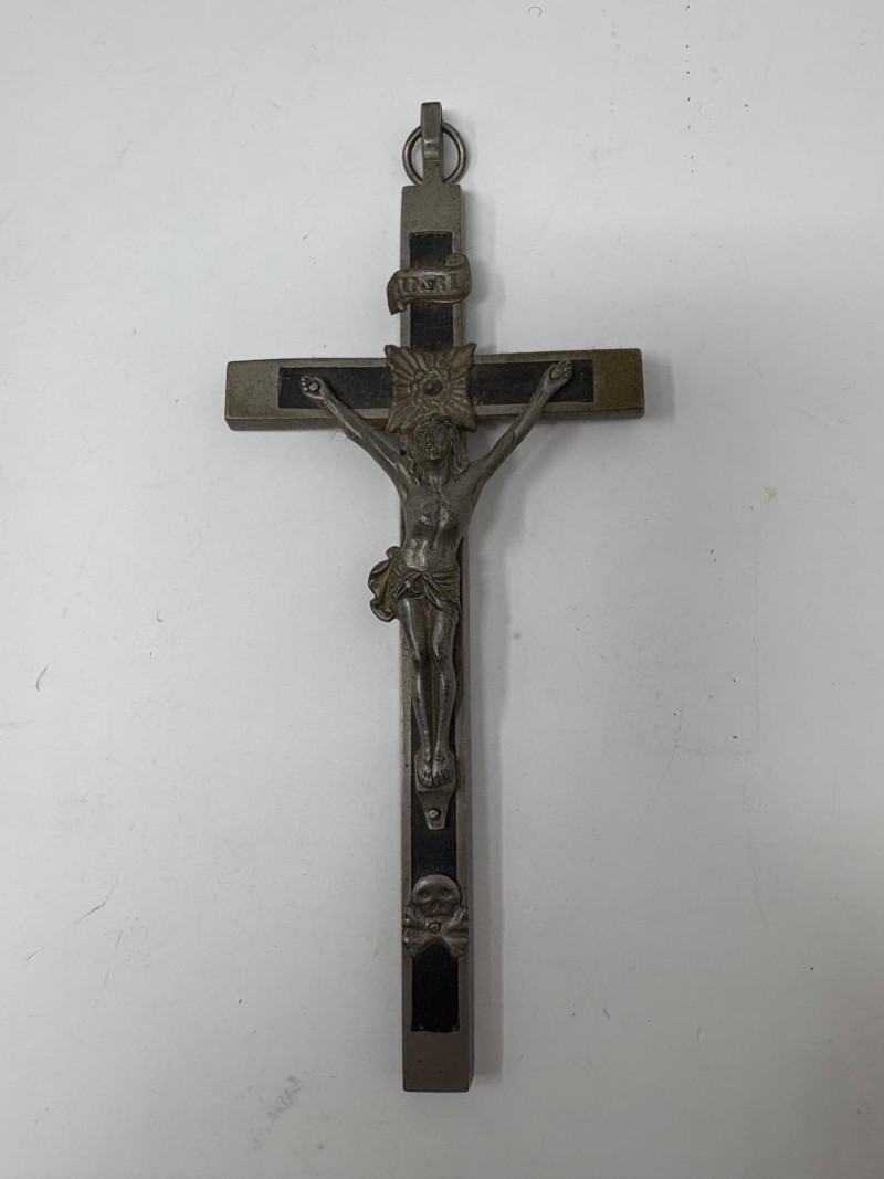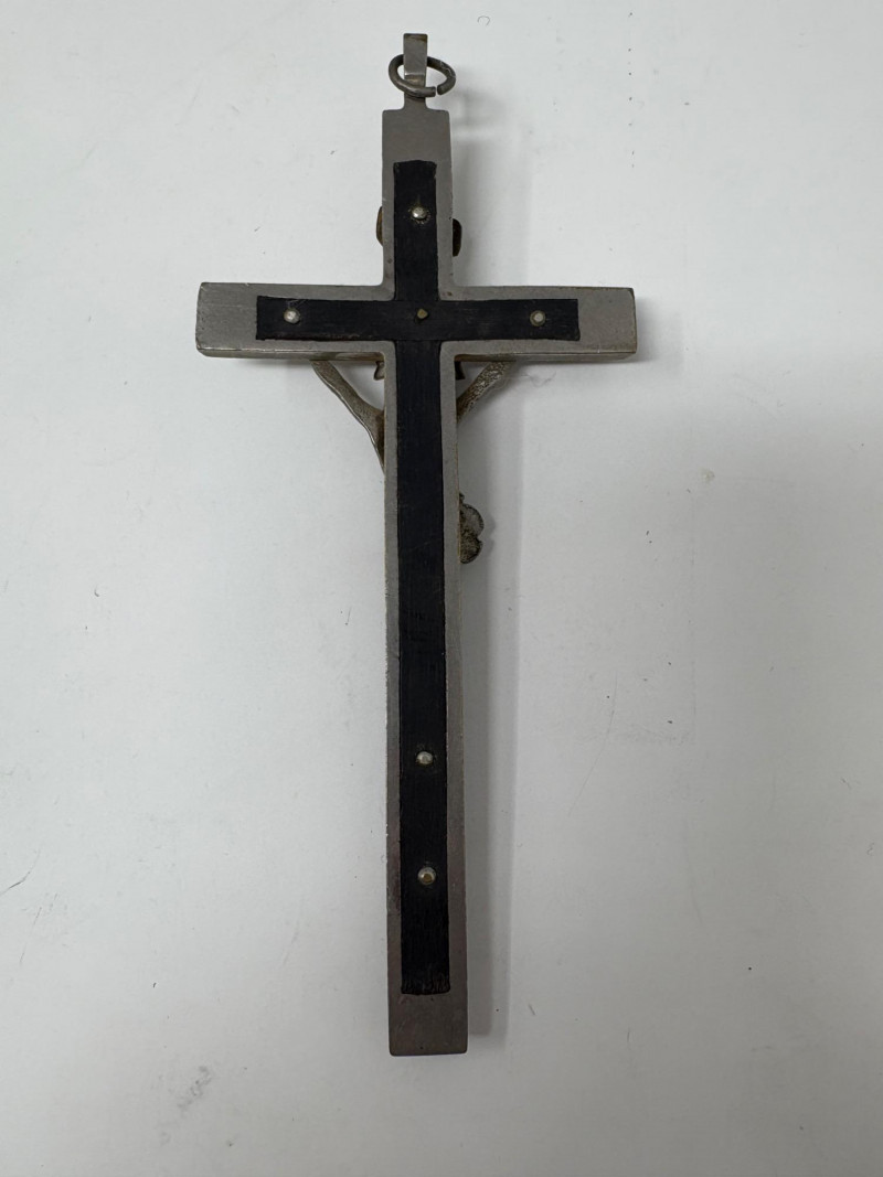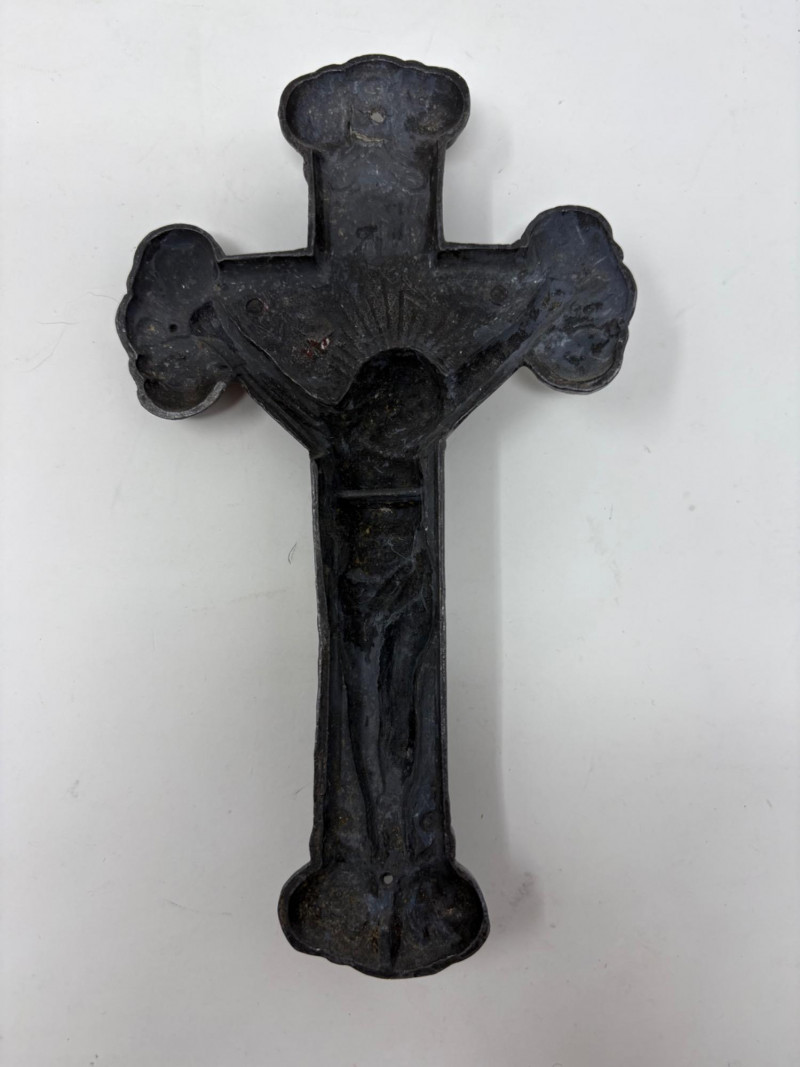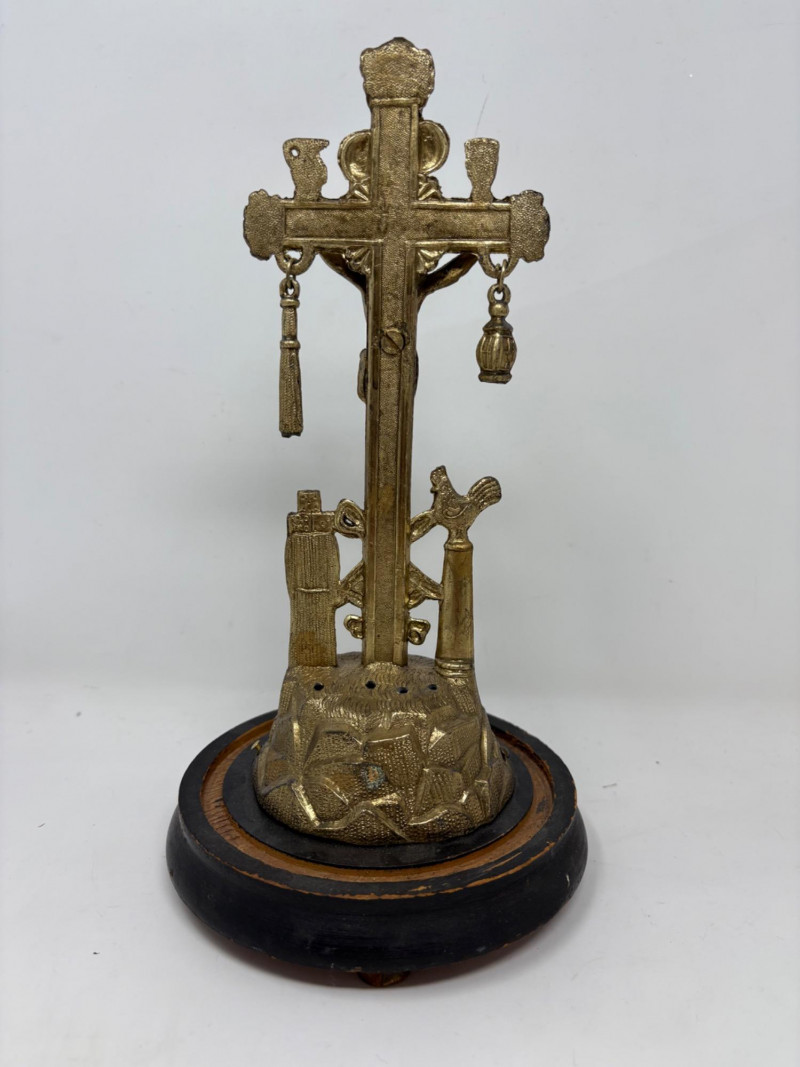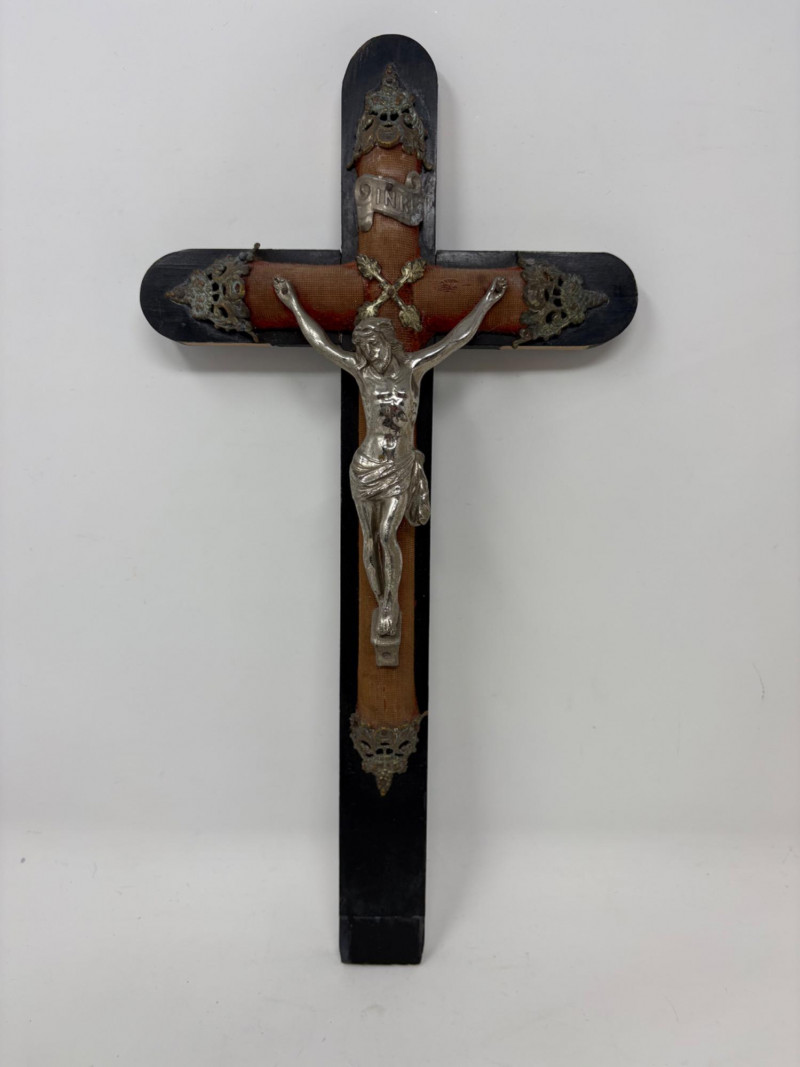 Wide range of Christian religious pieces from various sources – mostly European. Client collected religious artifacts wherever she traveled so these each have a story. Wax forearm/hand purchased at the Sanctuary of Our Lady Fatima pilgrimage site in Portugal. Measures 12.5" H. Portrait of Christ as if painted on a shroud. Creepy because depending on how you hold it, Jesus's eyes are either closed or staring right at you. Purchased in Paris from an antique dealer. Measures 12” H x 9.5" W framed. Antique black wooden crucifix with Christ on a very worn red velvet padded cross with brass details. From a church in southern France. Cross measures approximately 14" H x 7.5" W with the metal Christ figure measuring almost 6" H. Christ crucified mounted on a cloche base (glass is missing but could easily be replaced if desired). Metal plate affixed to base says "Christ Crucified - Have Mercy On Us". Various biblical references such as the cock crowing and the hill at Gethsemane. Purchased in a Paris antique gallery. Measures approximately 10" H x 6" in diameter at base 4 metal crucifixes of differing metals and creation methods. They vary in size from 7" H to 4.5" H. 6 embossed Mexican metal plates for prayer of recovery to a specific body part. They average about 3" in size..