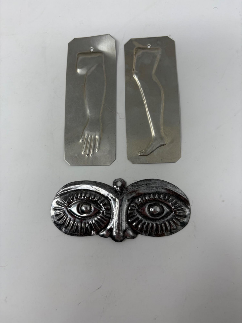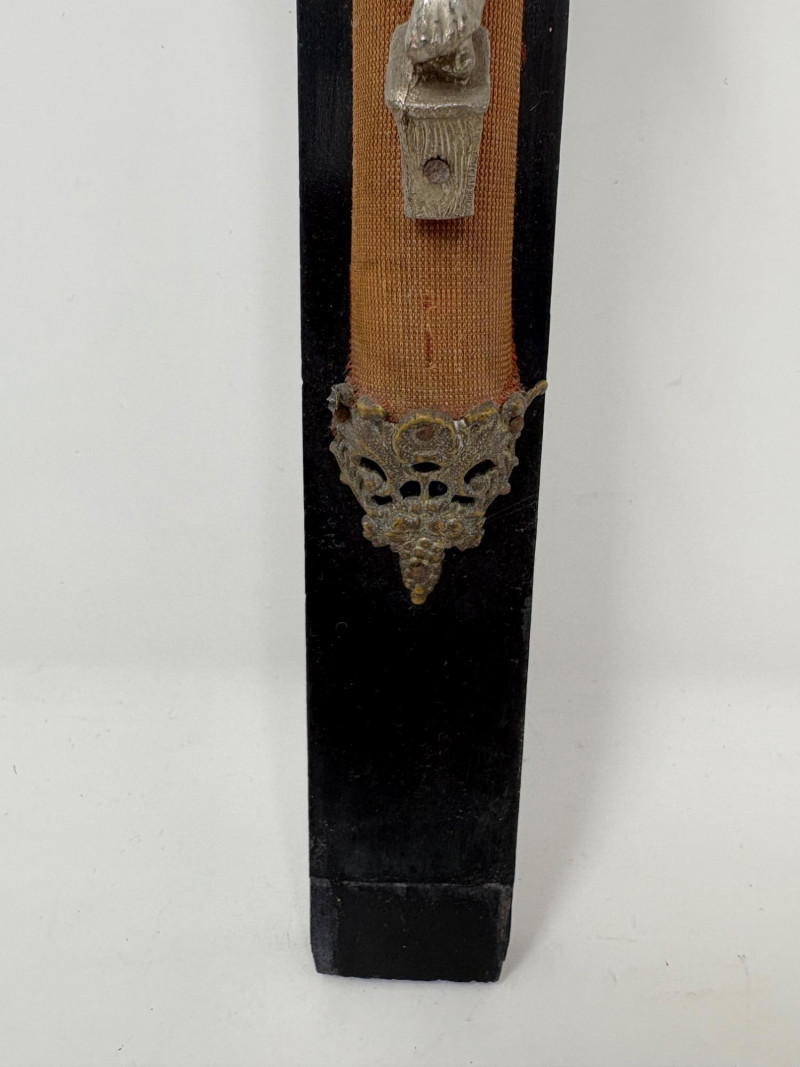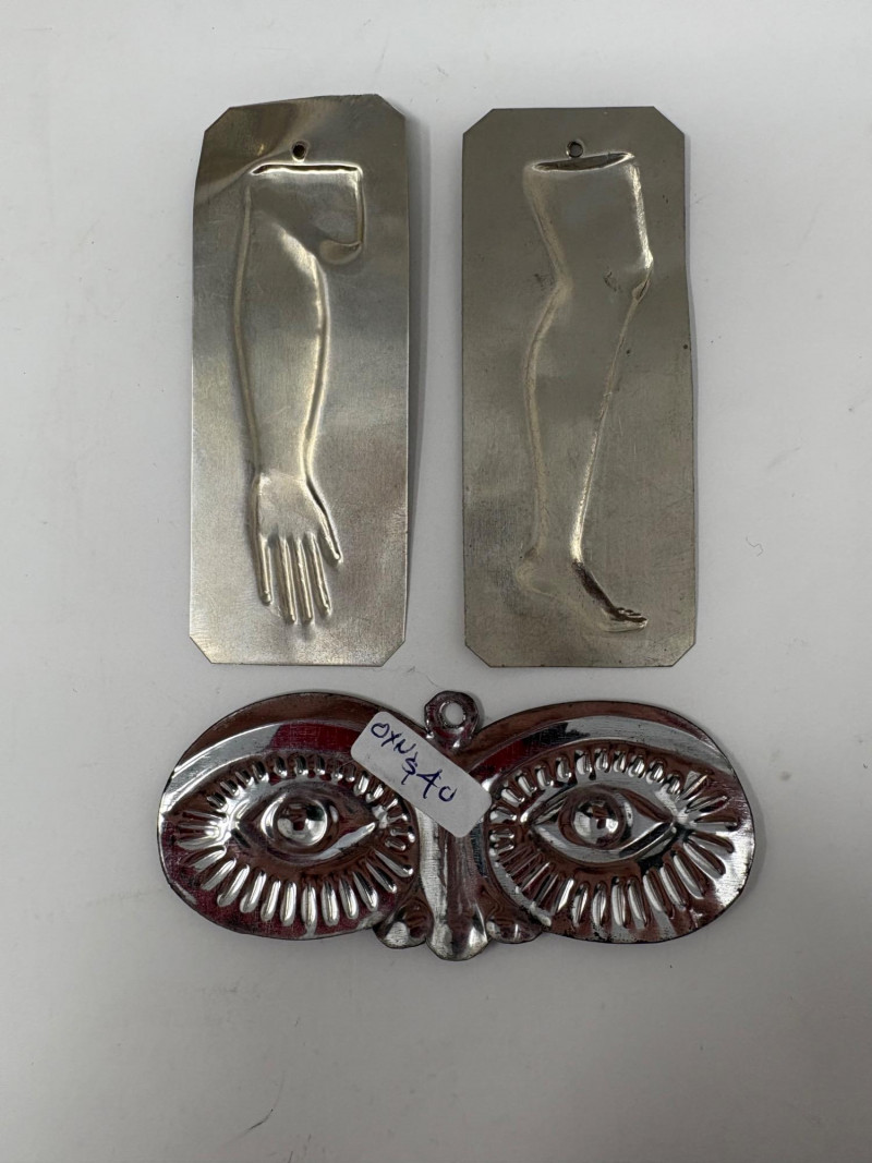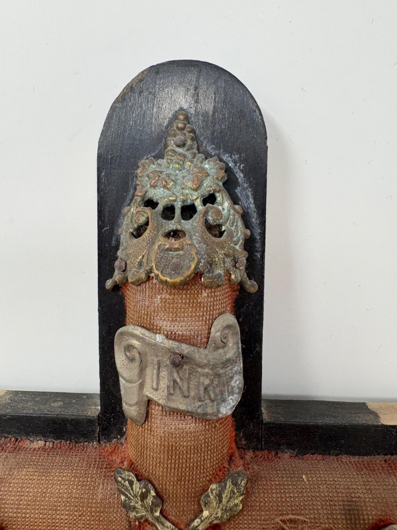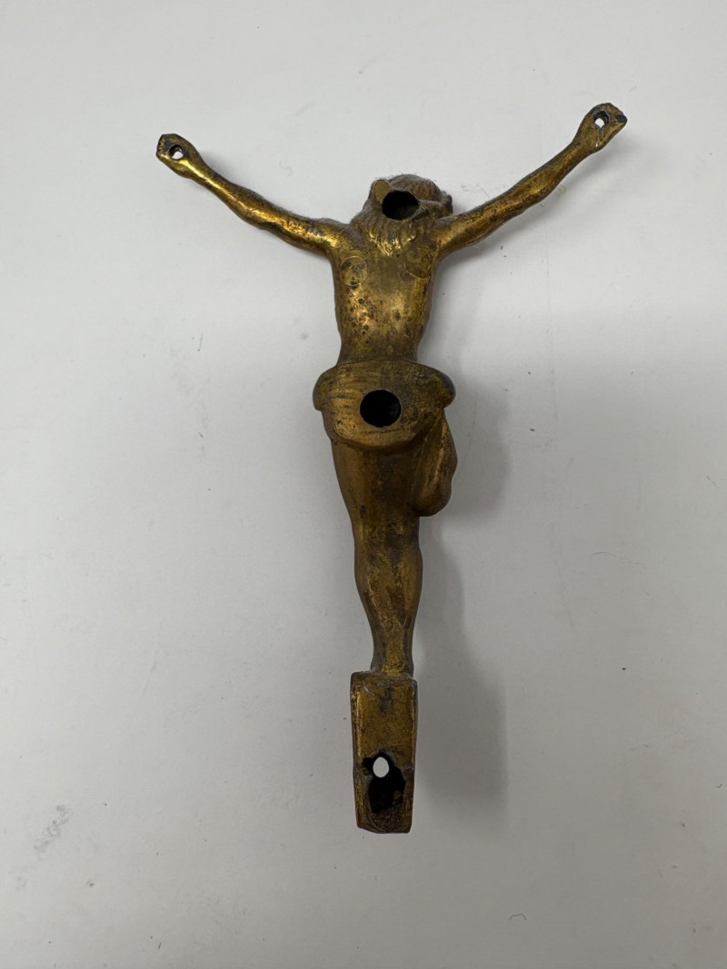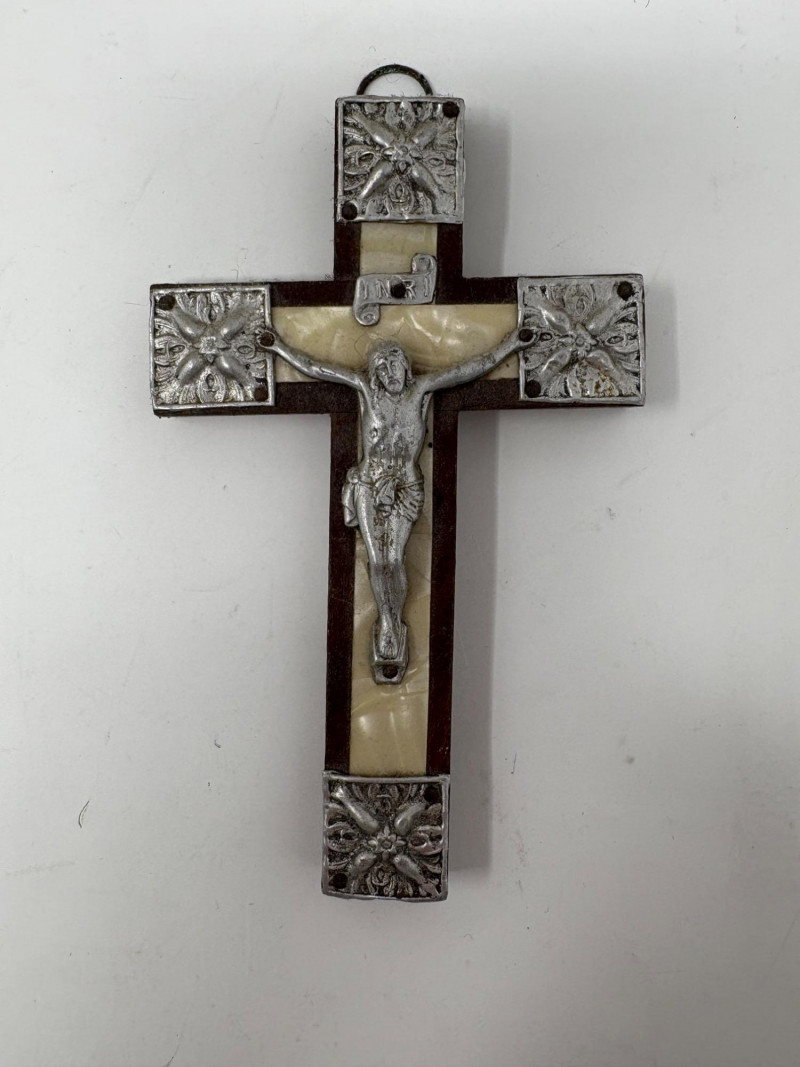 Wide range of Christian religious pieces from various sources – mostly European. Client collected religious artifacts wherever she traveled so these each have a story. Wax forearm/hand purchased at the Sanctuary of Our Lady Fatima pilgrimage site in Portugal. Measures 12.5" H. Portrait of Christ as if painted on a shroud. Creepy because depending on how you hold it, Jesus's eyes are either closed or staring right at you. Purchased in Paris from an antique dealer. Measures 12” H x 9.5" W framed. Antique black wooden crucifix with Christ on a very worn red velvet padded cross with brass details. From a church in southern France. Cross measures approximately 14" H x 7.5" W with the metal Christ figure measuring almost 6" H. Christ crucified mounted on a cloche base (glass is missing but could easily be replaced if desired). Metal plate affixed to base says "Christ Crucified - Have Mercy On Us". Various biblical references such as the cock crowing and the hill at Gethsemane. Purchased in a Paris antique gallery. Measures approximately 10" H x 6" in diameter at base 4 metal crucifixes of differing metals and creation methods. They vary in size from 7" H to 4.5" H. 6 embossed Mexican metal plates for prayer of recovery to a specific body part. They average about 3" in size..