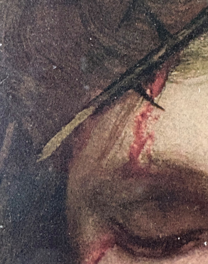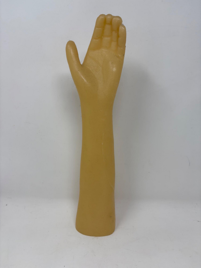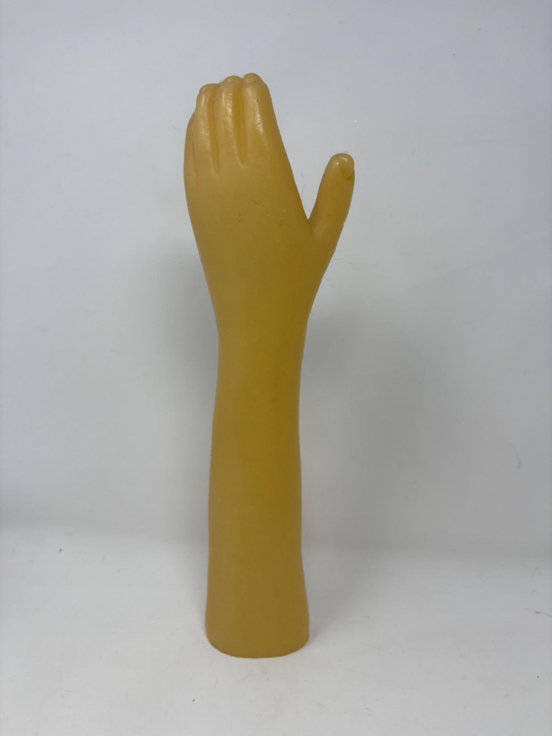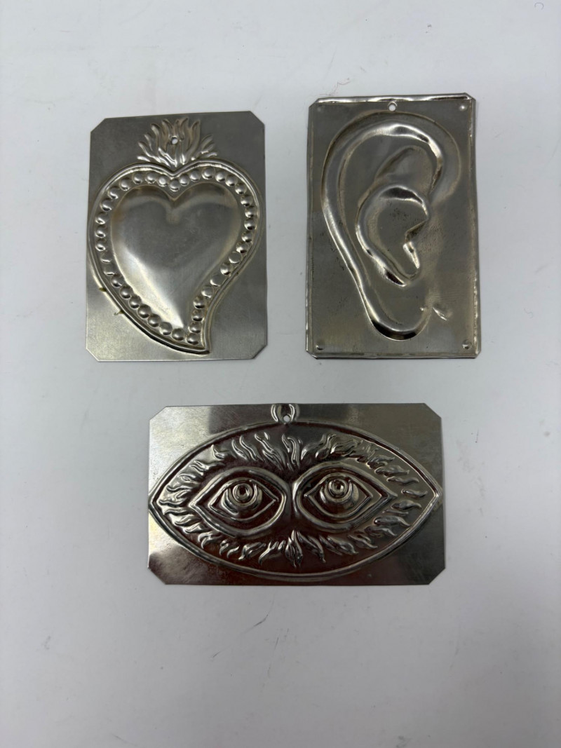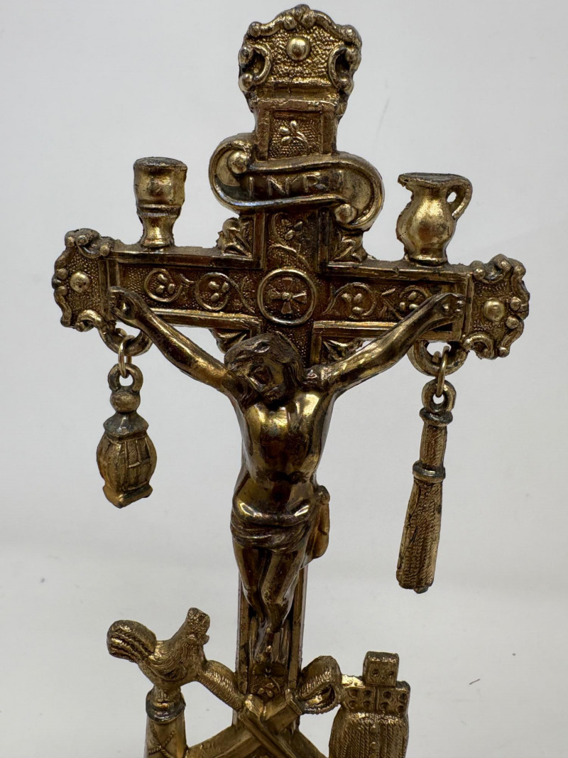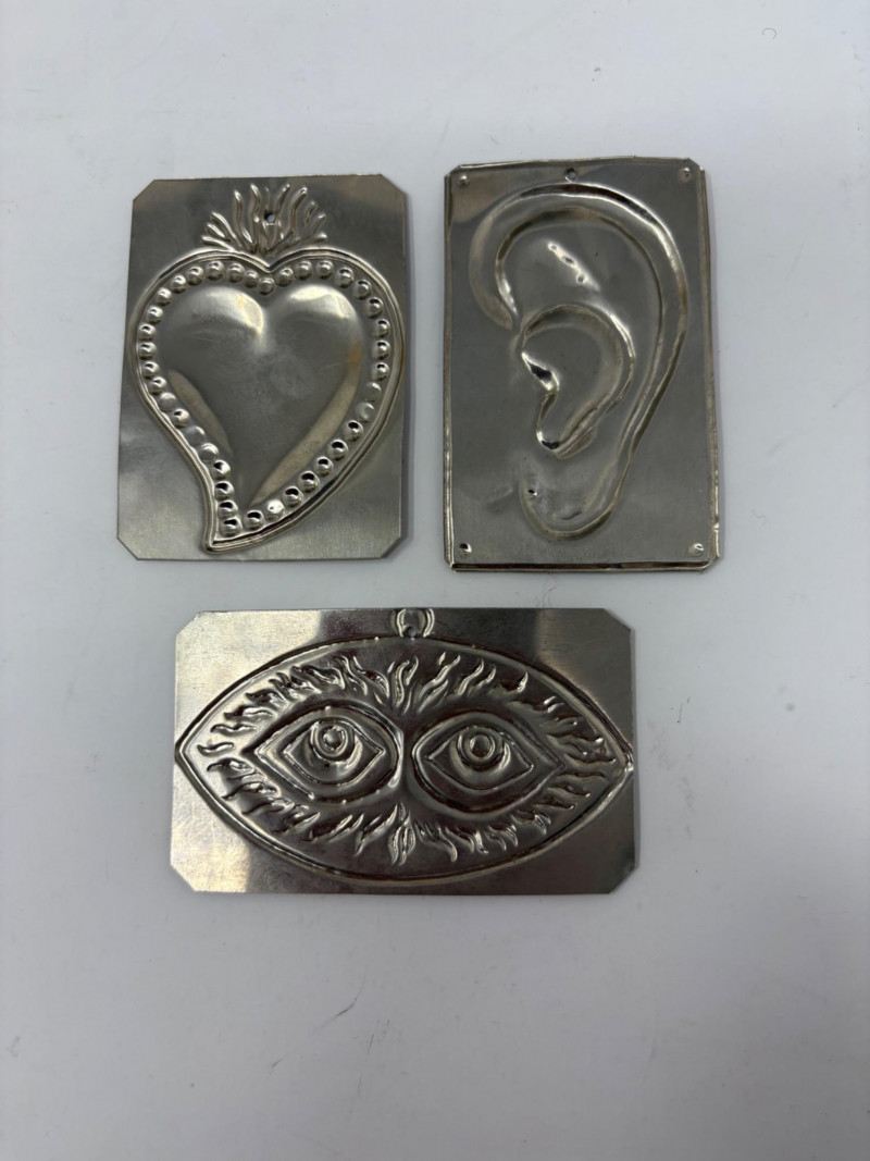 Wide range of Christian religious pieces from various sources – mostly European. Client collected religious artifacts wherever she traveled so these each have a story. Wax forearm/hand purchased at the Sanctuary of Our Lady Fatima pilgrimage site in Portugal. Measures 12.5" H. Portrait of Christ as if painted on a shroud. Creepy because depending on how you hold it, Jesus's eyes are either closed or staring right at you. Purchased in Paris from an antique dealer. Measures 12” H x 9.5" W framed. Antique black wooden crucifix with Christ on a very worn red velvet padded cross with brass details. From a church in southern France. Cross measures approximately 14" H x 7.5" W with the metal Christ figure measuring almost 6" H. Christ crucified mounted on a cloche base (glass is missing but could easily be replaced if desired). Metal plate affixed to base says "Christ Crucified - Have Mercy On Us". Various biblical references such as the cock crowing and the hill at Gethsemane. Purchased in a Paris antique gallery. Measures approximately 10" H x 6" in diameter at base 4 metal crucifixes of differing metals and creation methods. They vary in size from 7" H to 4.5" H. 6 embossed Mexican metal plates for prayer of recovery to a specific body part. They average about 3" in size..