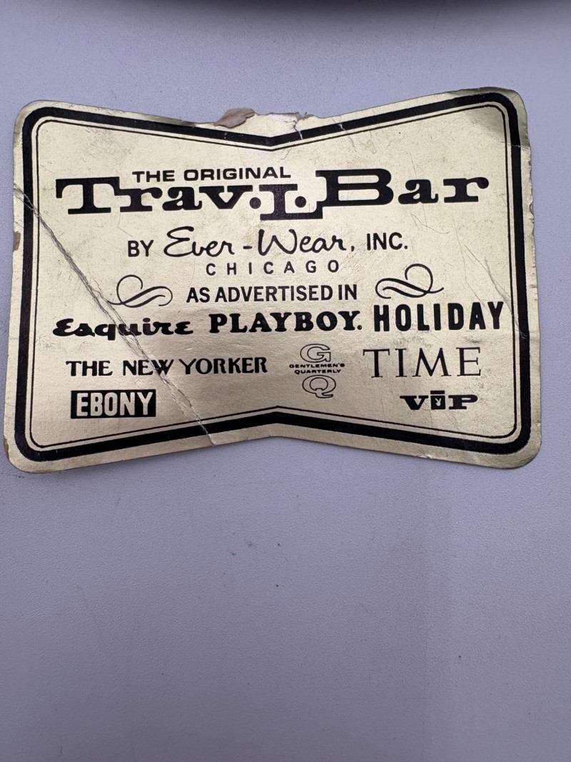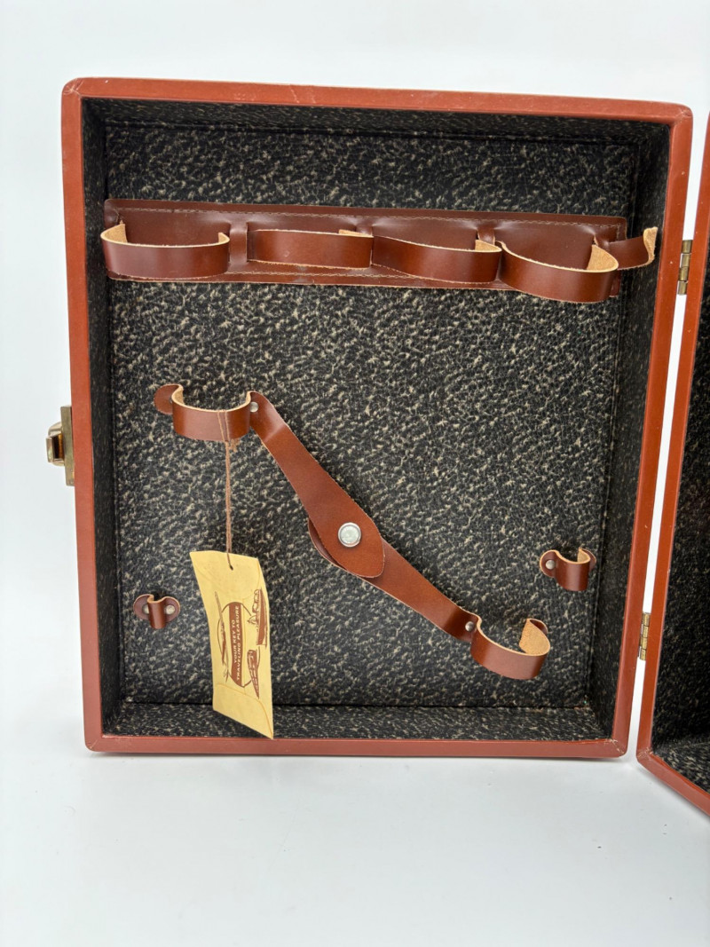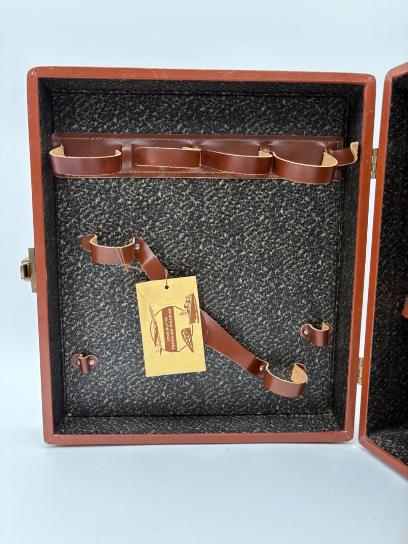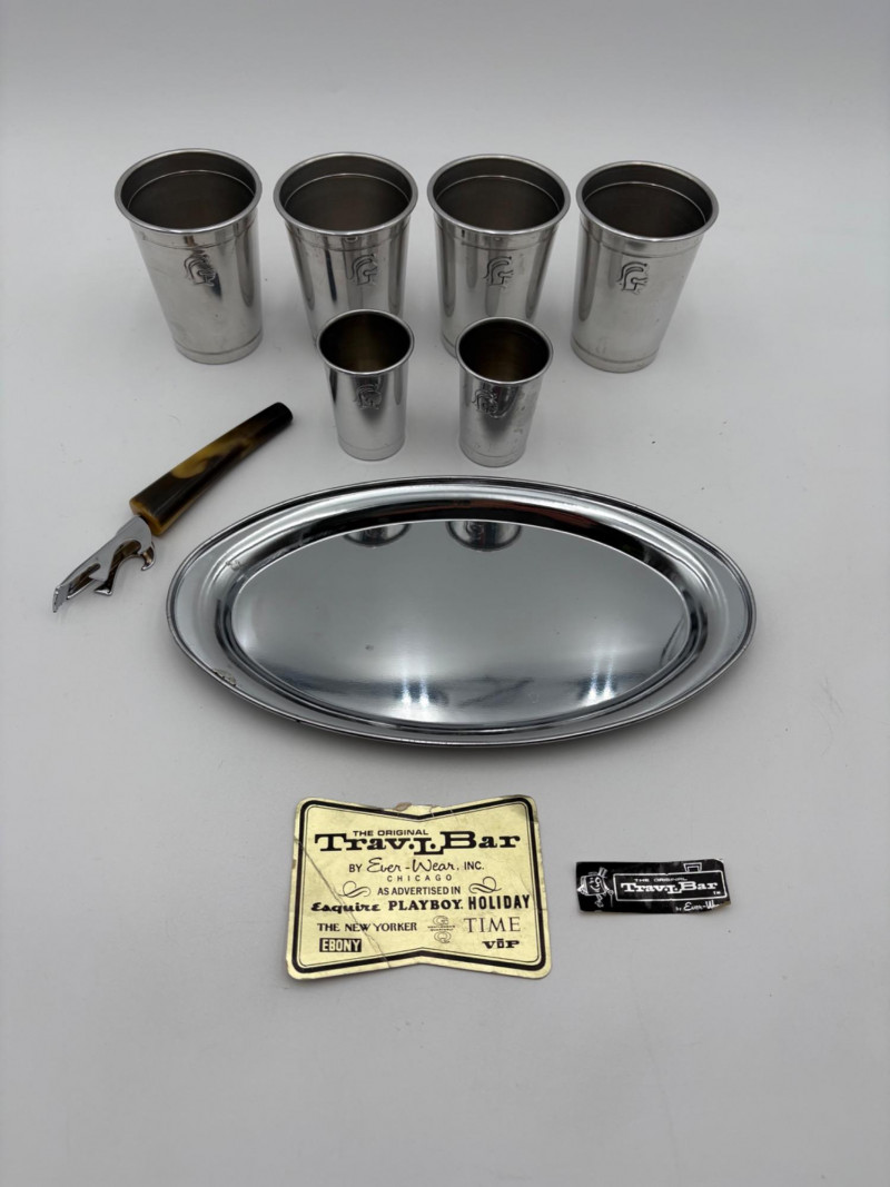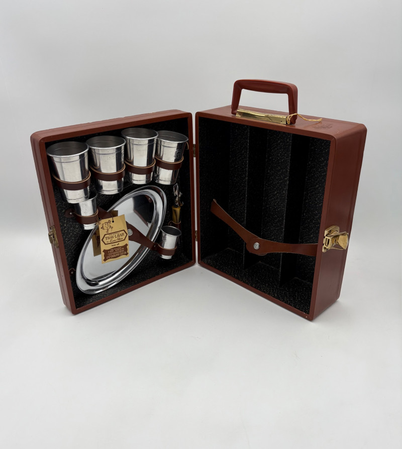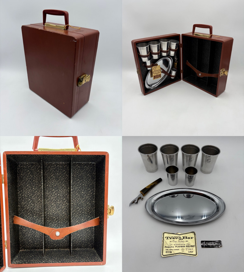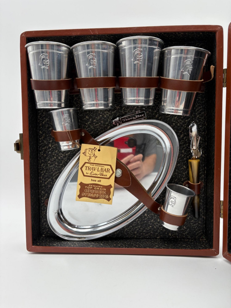 “Trav-L-Bar” from mid-1950s. Very popular with traveling advertising industry execs looking to give their prospects the liquid courage to make a buy. This one shows its age on the exterior with a few dings and such, but the interior is in terrific shape with original labels and leather straps. Includes 4 small cups (approx. 3.5" H), 2 shot glasses (approx. 2.25" H), an opener, and a tray in good vintage condition - metal appears to be aluminum. Lots of space on the right panel for your liquor of choice. Case measures approx. 15" H with handle x 12" W x 5.5" D including latch.