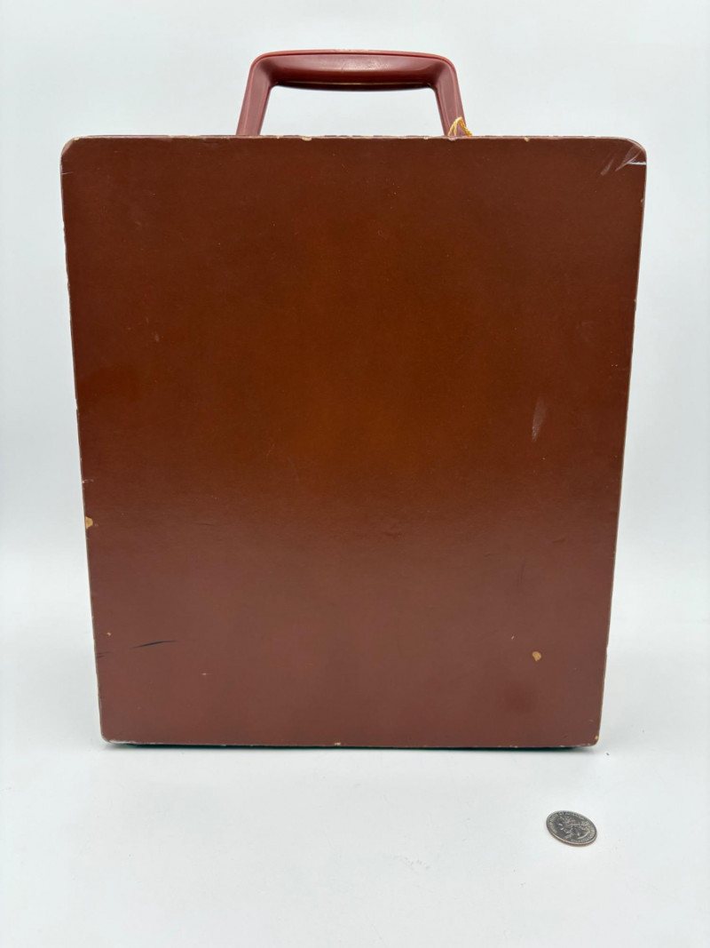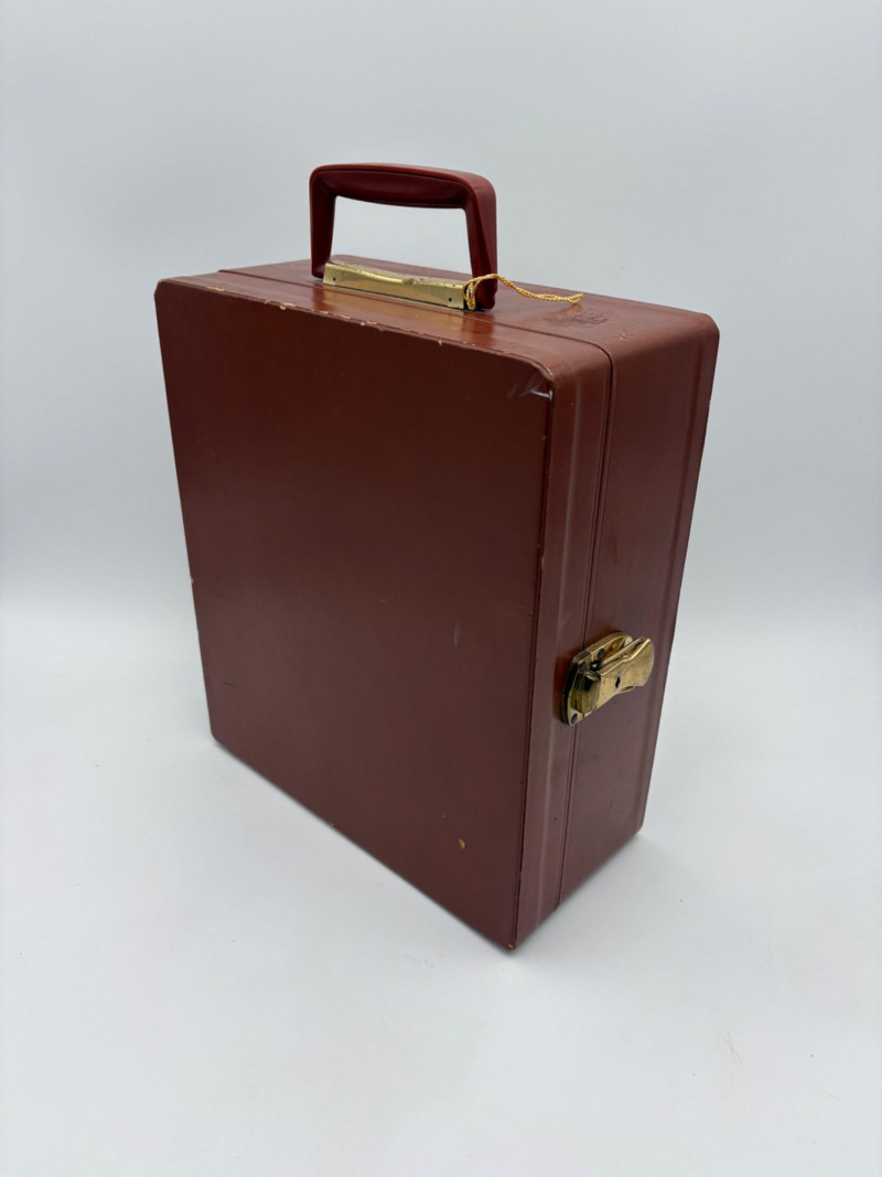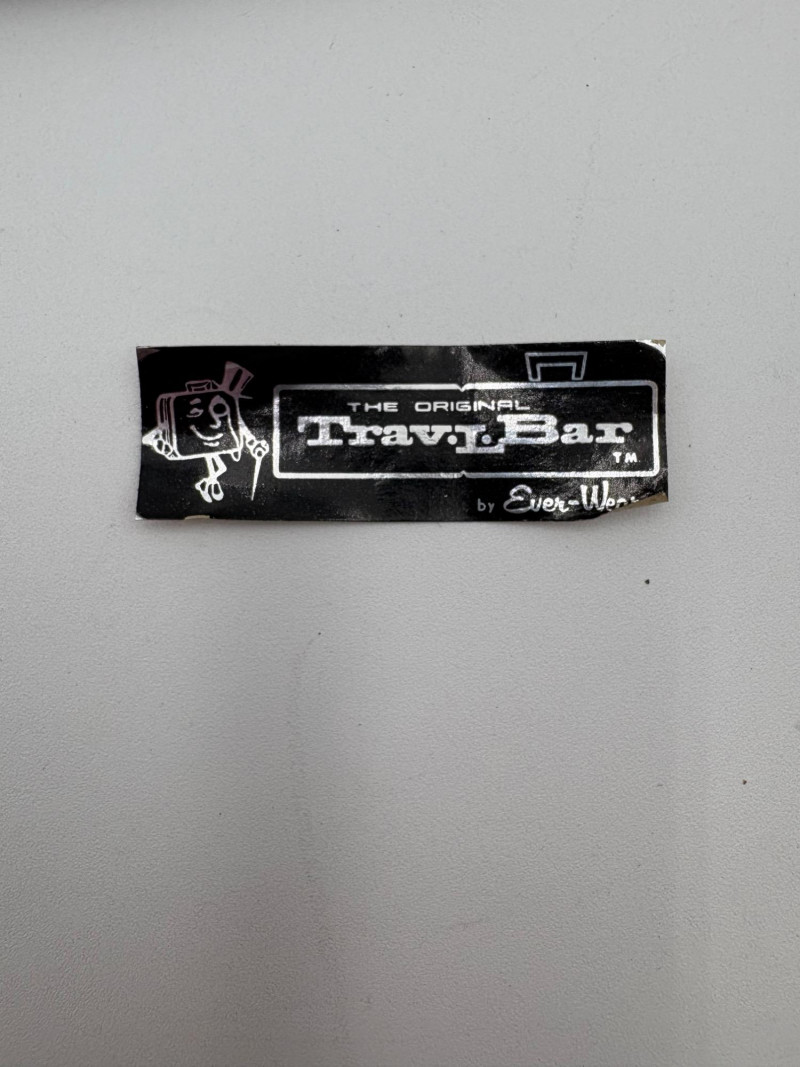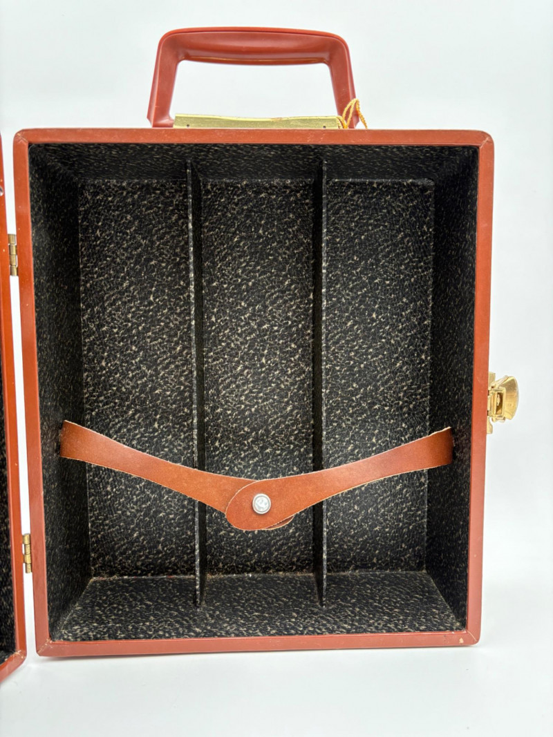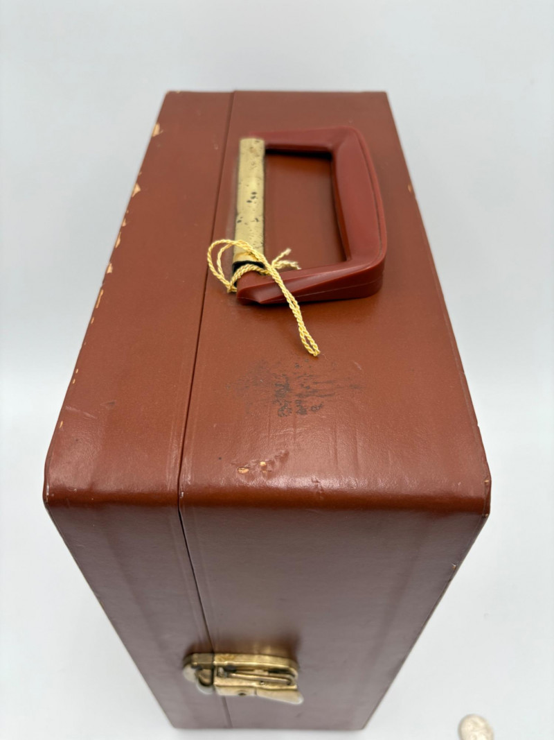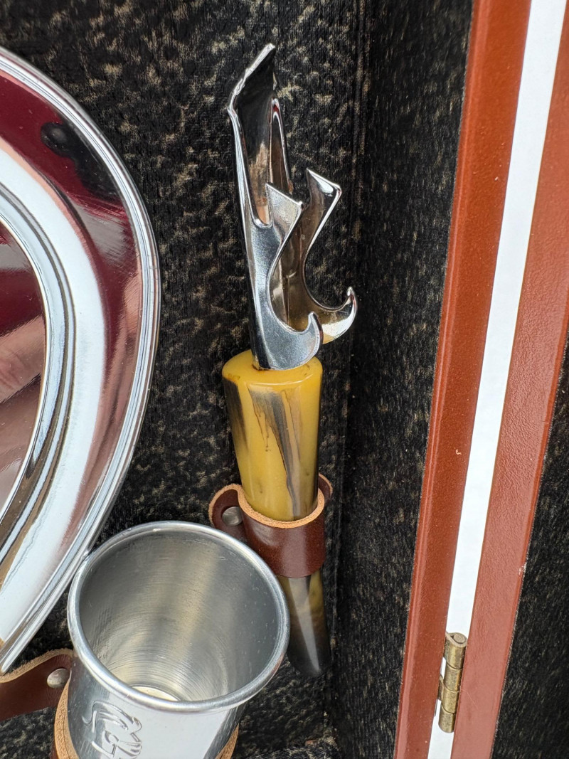 “Trav-L-Bar” from mid-1950s. Very popular with traveling advertising industry execs looking to give their prospects the liquid courage to make a buy. This one shows its age on the exterior with a few dings and such, but the interior is in terrific shape with original labels and leather straps. Includes 4 small cups (approx. 3.5" H), 2 shot glasses (approx. 2.25" H), an opener, and a tray in good vintage condition - metal appears to be aluminum. Lots of space on the right panel for your liquor of choice. Case measures approx. 15" H with handle x 12" W x 5.5" D including latch.