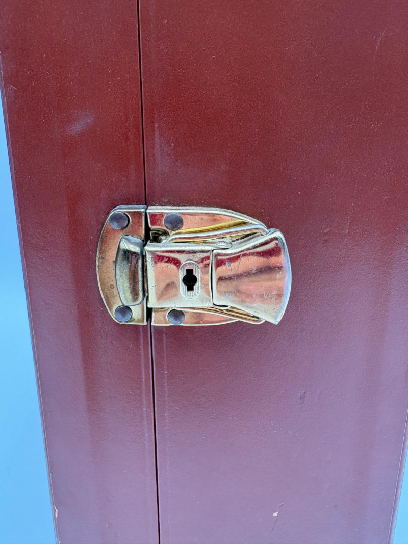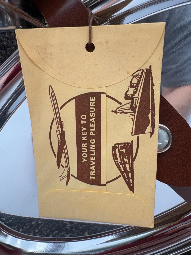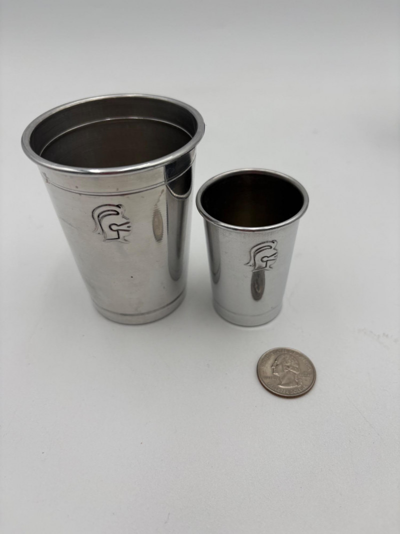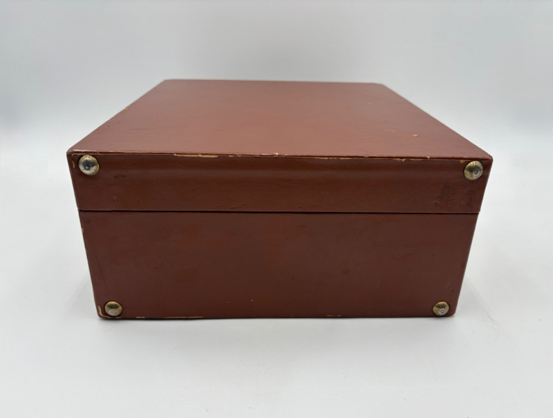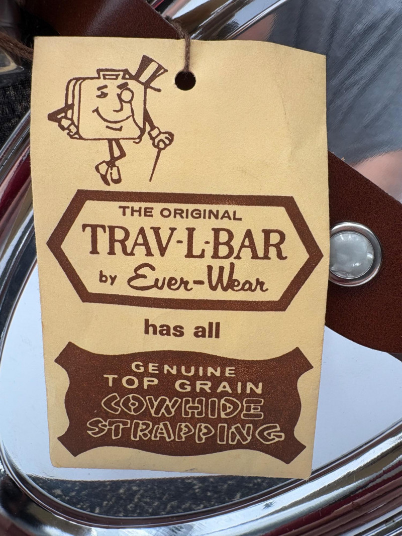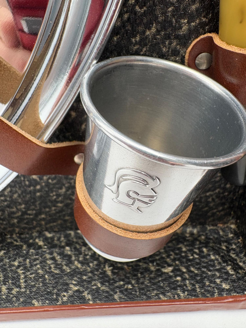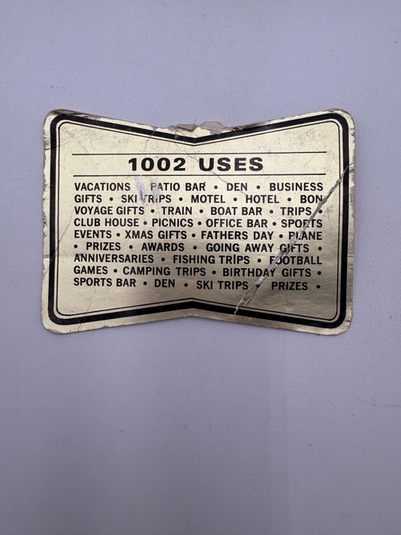 “Trav-L-Bar” from mid-1950s. Very popular with traveling advertising industry execs looking to give their prospects the liquid courage to make a buy. This one shows its age on the exterior with a few dings and such, but the interior is in terrific shape with original labels and leather straps. Includes 4 small cups (approx. 3.5" H), 2 shot glasses (approx. 2.25" H), an opener, and a tray in good vintage condition - metal appears to be aluminum. Lots of space on the right panel for your liquor of choice. Case measures approx. 15" H with handle x 12" W x 5.5" D including latch.