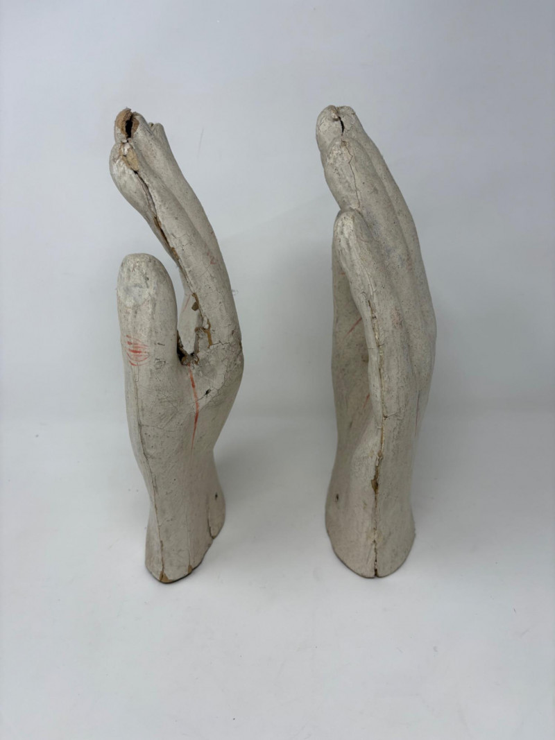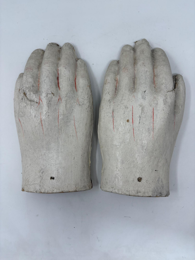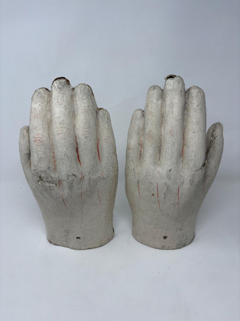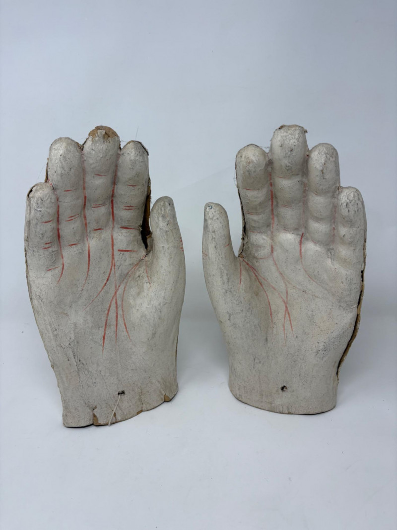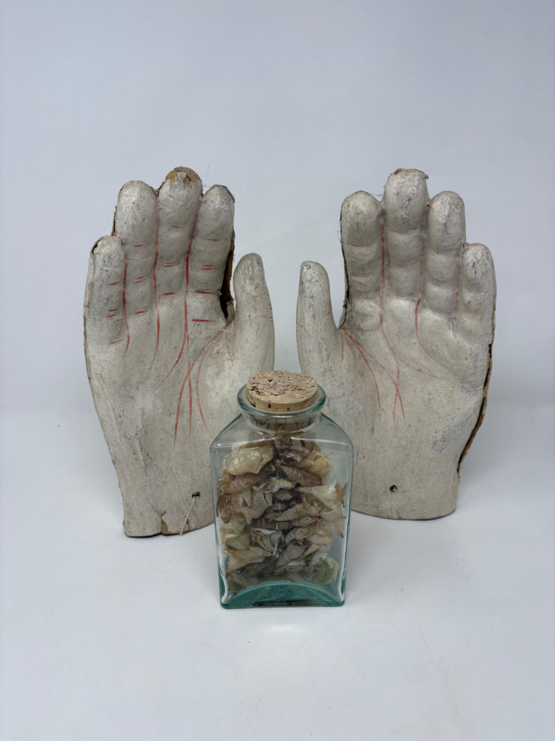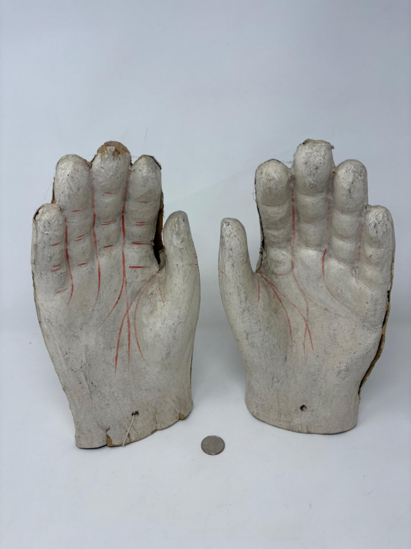 Two rather creepy items ideal for conversation starters. Triangular glass bottle full of insect casings/molting skins. Chock full of variety with a cork lid. Measures approximately 7" H x 3.75" along each straight edge. In perfect condition. Pair of creepy vintage giant hands with red highlighting in very thin paper mache (shades of Uncle John on "Sunny in Philadelphia" - yep, very creepy!). From venerated - now defunct - old east coast department store Strawbridge & Clothier. We think they were used as some kind of advertising aid - regardless, they are disturbing but fascinating. Measure approximately 12" H x 6.5" W and while not in pristine shape, we think the the condition makes them even creepier.