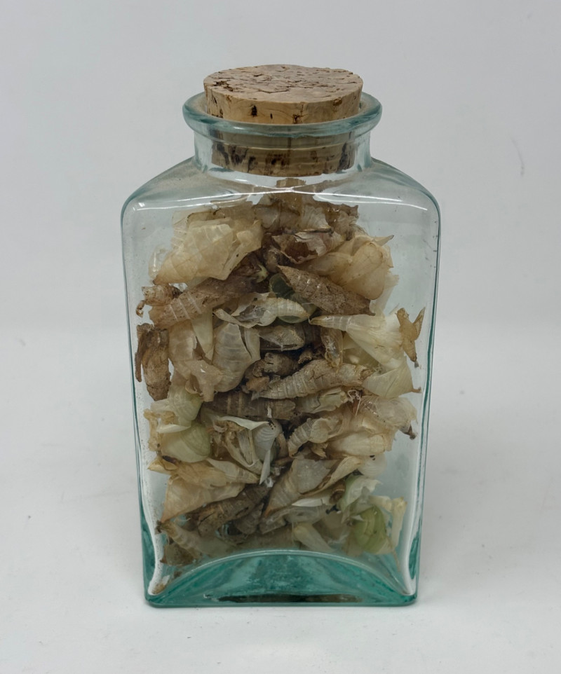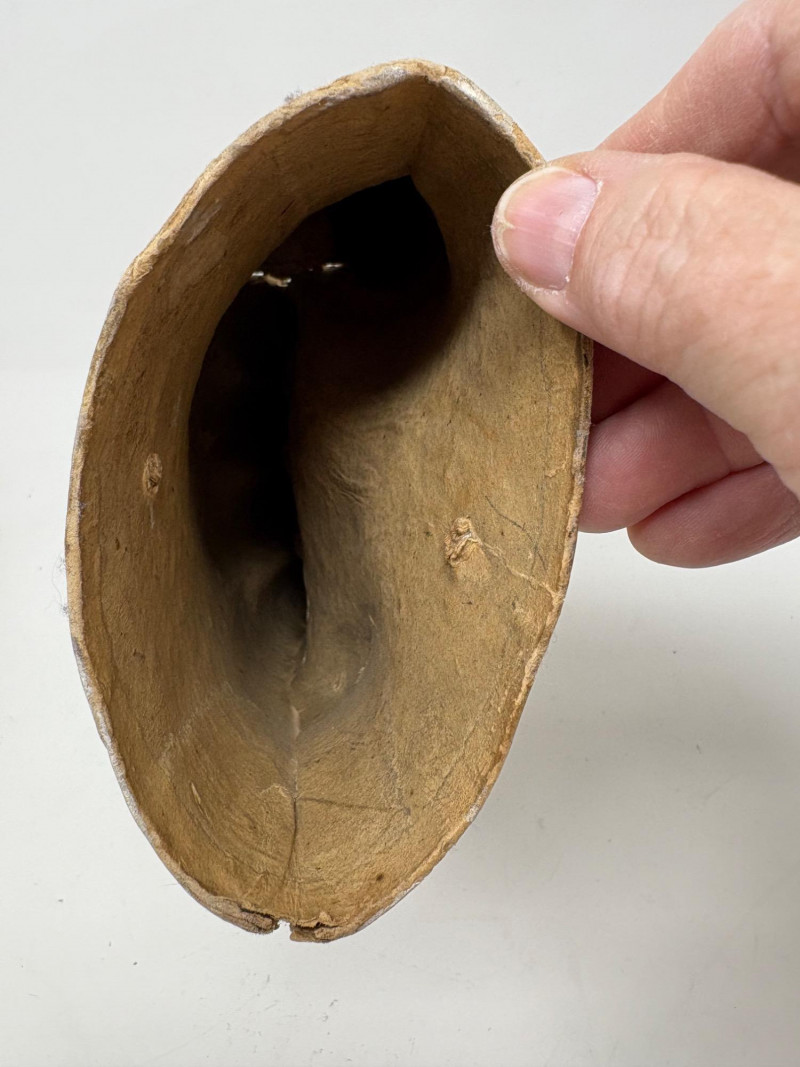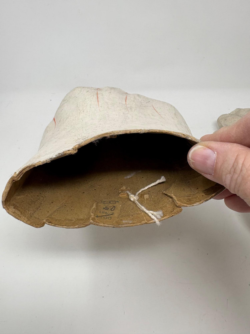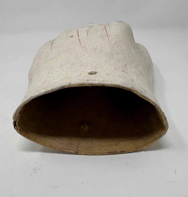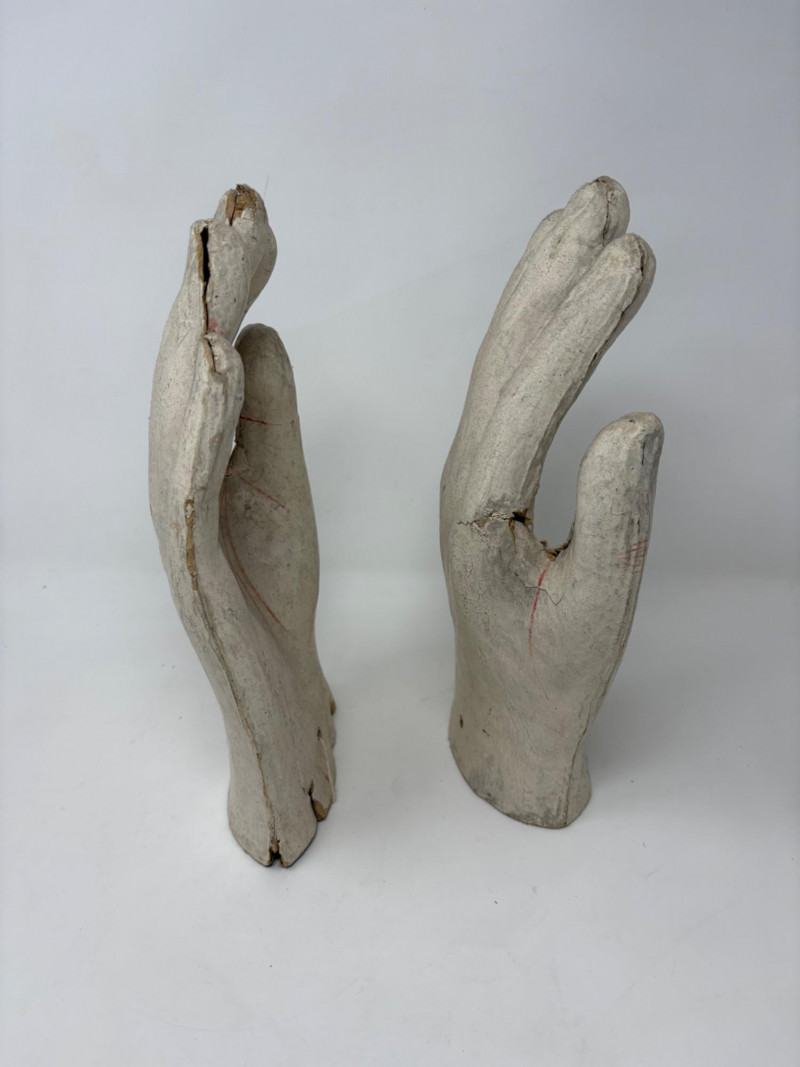 Two rather creepy items ideal for conversation starters. Triangular glass bottle full of insect casings/molting skins. Chock full of variety with a cork lid. Measures approximately 7" H x 3.75" along each straight edge. In perfect condition. Pair of creepy vintage giant hands with red highlighting in very thin paper mache (shades of Uncle John on "Sunny in Philadelphia" - yep, very creepy!). From venerated - now defunct - old east coast department store Strawbridge & Clothier. We think they were used as some kind of advertising aid - regardless, they are disturbing but fascinating. Measure approximately 12" H x 6.5" W and while not in pristine shape, we think the the condition makes them even creepier.
