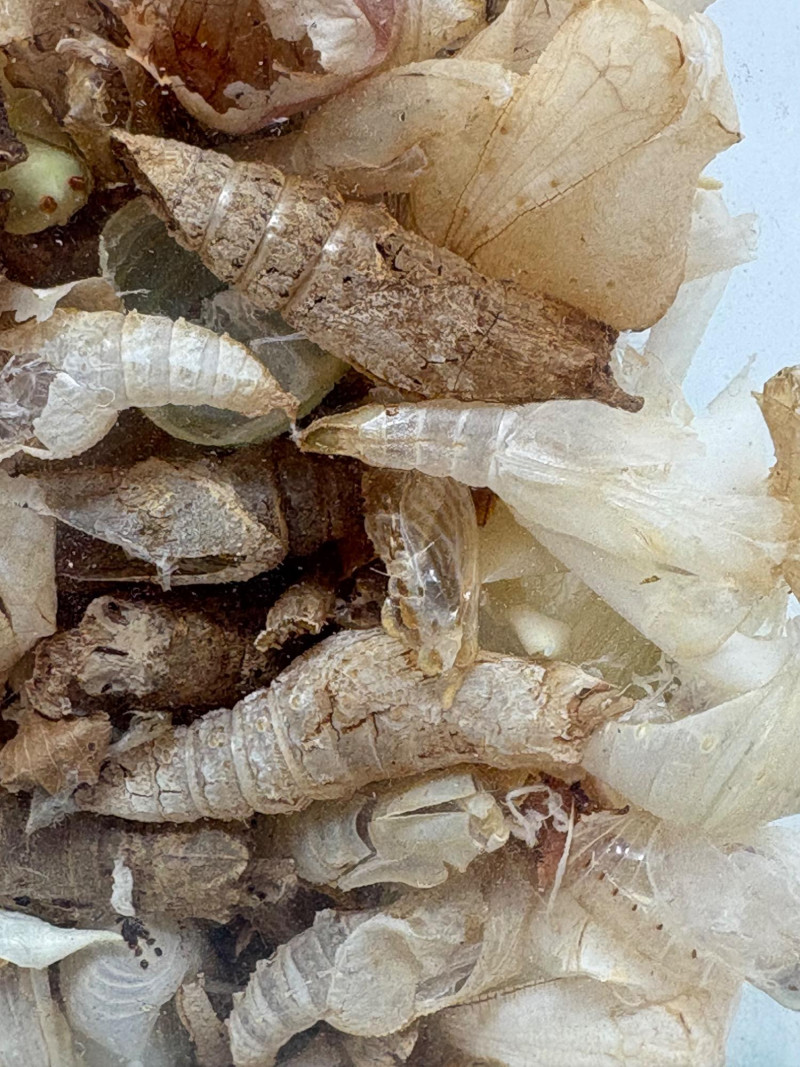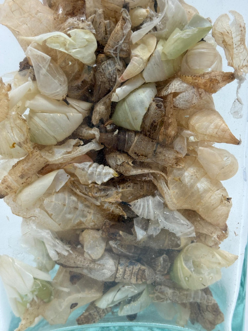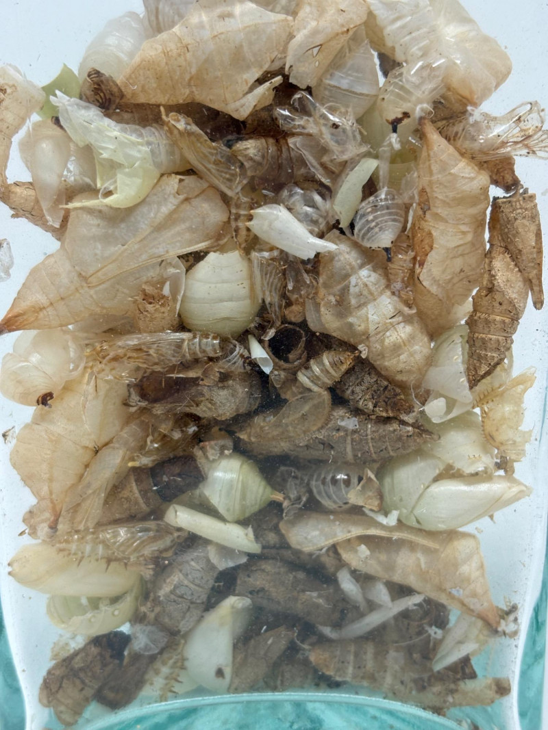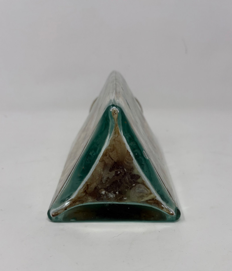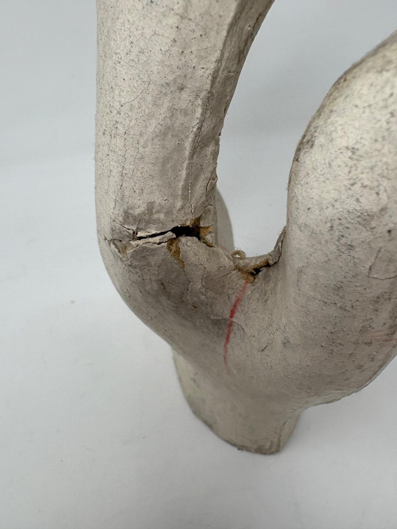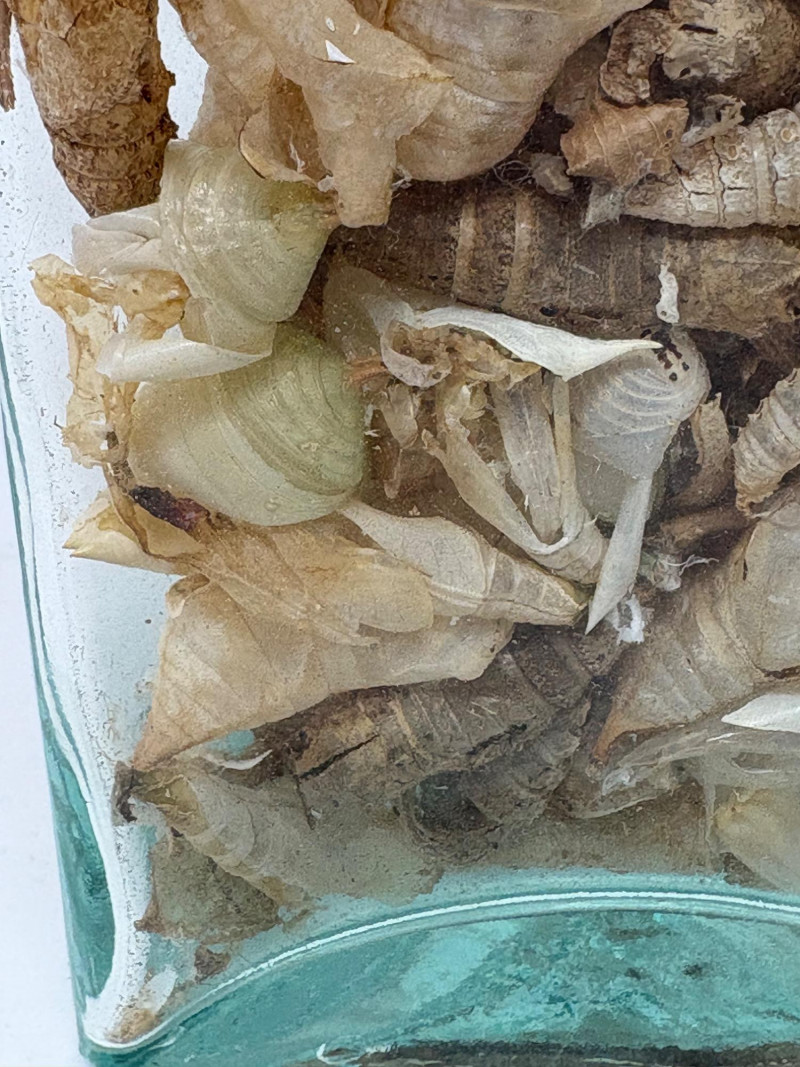 Two rather creepy items ideal for conversation starters. Triangular glass bottle full of insect casings/molting skins. Chock full of variety with a cork lid. Measures approximately 7" H x 3.75" along each straight edge. In perfect condition. Pair of creepy vintage giant hands with red highlighting in very thin paper mache (shades of Uncle John on "Sunny in Philadelphia" - yep, very creepy!). From venerated - now defunct - old east coast department store Strawbridge & Clothier. We think they were used as some kind of advertising aid - regardless, they are disturbing but fascinating. Measure approximately 12" H x 6.5" W and while not in pristine shape, we think the the condition makes them even creepier.