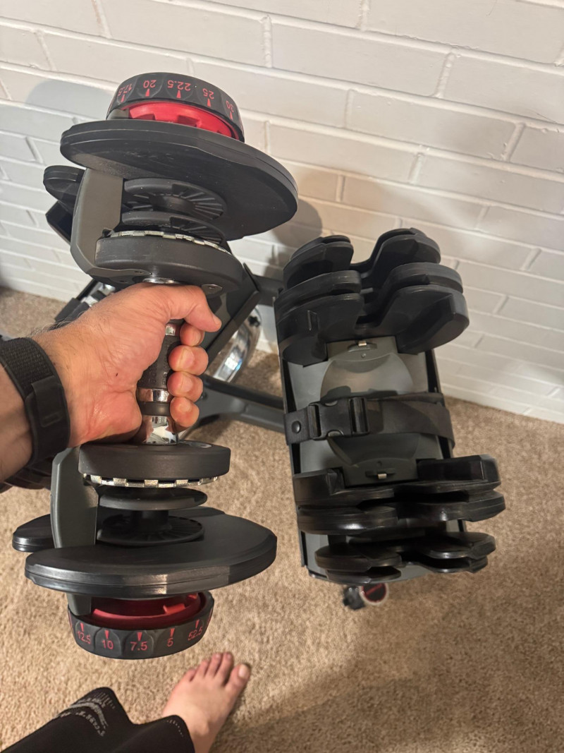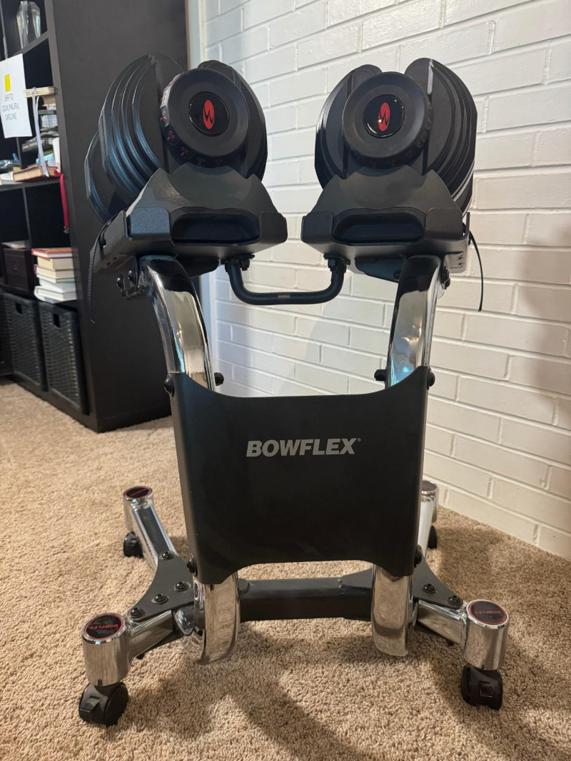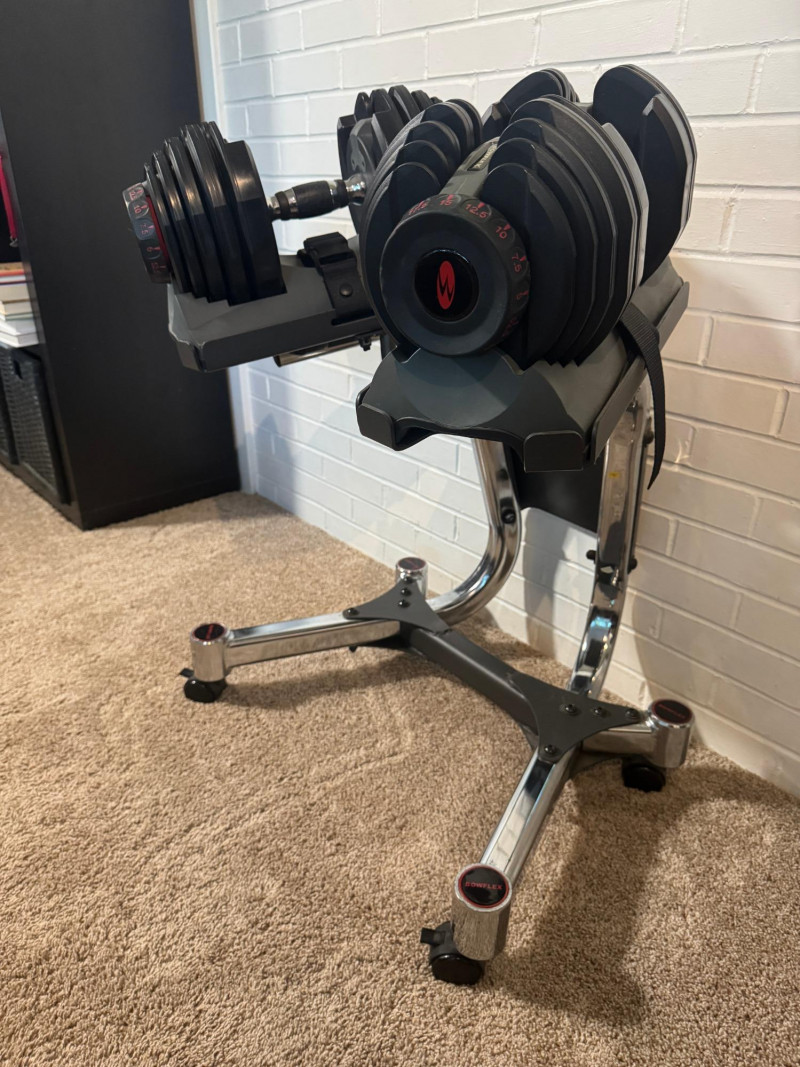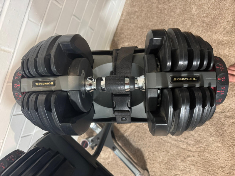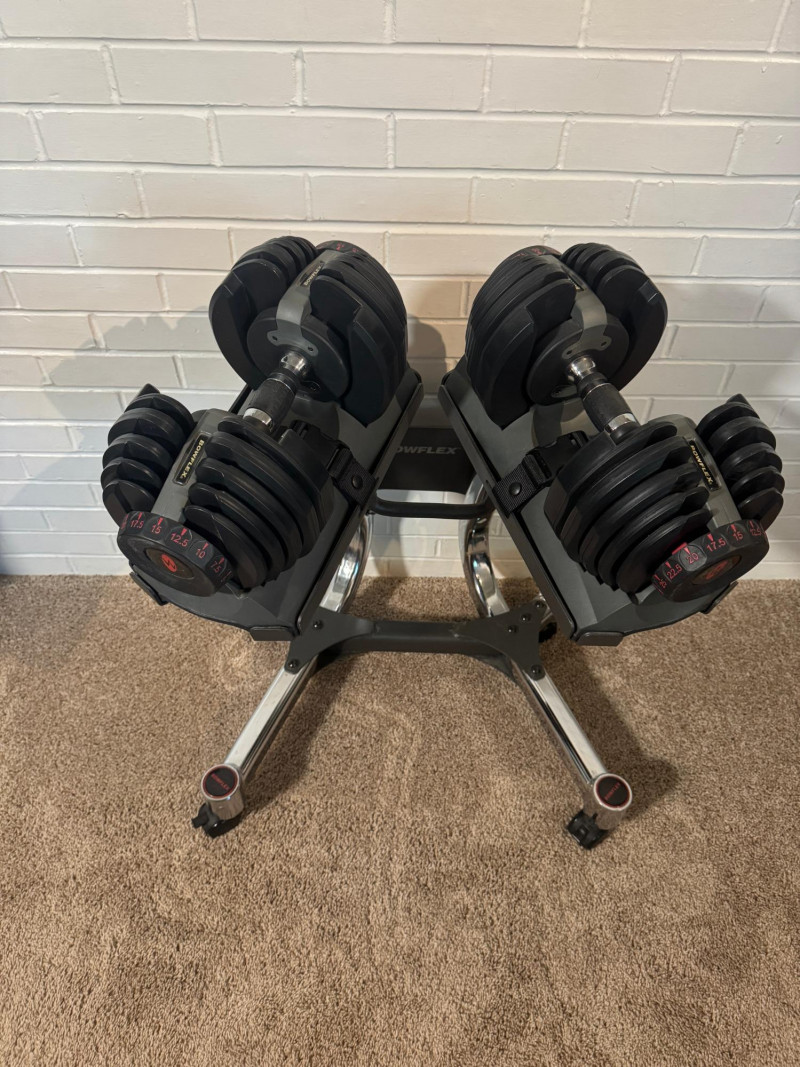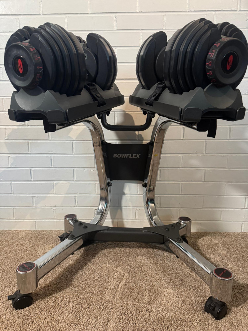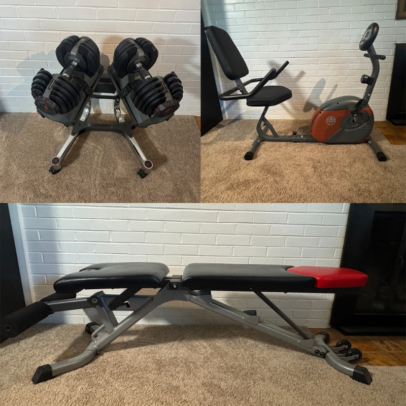 Get fit at home with our knockout exercise suite! Work your arms with the dumbbells, your core with the press bench, and your legs with the recumbent exercise bike! This lot includes: ABOUT THE DUMBBELLS These adjustable dumbbells replace 15 sets of weights. Weights adjust from 5 to 52.5 lbs in 2.5 lb increments up to the first 25 lbs. Easy-to-use selection dials for adjusting weights. All you need is two Bowflex® SelectTech® 552 Dumbbells to transform your body. The Bowflex® SelectTech® Stand is designed to help protect your lower back by reducing the need to bend down to pick up heavy weights. The stand's built-in media rack provides easy access training videos, entertainment and more on your smart device from the free Bowflex SelectTech™ app. It has a convenient small footprint and wheels away for easy storage. Features: ABOUT THE DUMBBELL STAND ABOUT THE WEIGHT BENCH Comfort and versatility should be at the top of your list when choosing a new bench for your workout space. With the Bowflex SelectTech 3.1 Workout Bench, you'll get just that and more. This bench will adjust to 4 different positions and can help correct your posture with added stability to ensure you have a safe workout. Ideal workouts for this bench include dumbbell, barbell, and cage use. Whether you're new to weights or an avid lifter, the Bowflex SelectTech 3.1 Workout Bench is a perfect addition to your workout routine. ABOUT THE EXERCISE BIKE The Marcy ME709 Recumbent Magnetic Exercise Bike features 8 preset magnetic resistance levels and a comfortable recumbent design. It has a 300-pound weight capacity, adjustable seat, and large textured pedals with straps. The bike includes an LCD computer displaying time, speed, distance, calories, and odometer. Made with heavy-duty steel tubing and a durable powder-coated finish, it measures 55.5" L x 25" W x 37.5" H and weighs 57 lbs.. The bike has transport wheels for easy movement and a compact design for convenient storage, making it suitable for at-home use. This Marcy bike ensures a safe ride with its weighted, counter-balanced pedals with adjustable straps and step-through frame design for easy entrance and exit. An easy-to-read computer display allows you to track your time, distance, calories burned and speed throughout your Marcy stationary bike workouts. Transport wheels and a compact design allow for quick and convenient storage make this a perfect piece of exercise equipment for home use. Local Pickup Only. Bidding on this lot is an agreement that: (1.) You will have 2 capable, able-bodied persons to lift and load at a minimum. (2.) You will bring a hand truck and/or any other tools needed to remove this item. If these steps are not followed your item will be forfeited and no refund given.