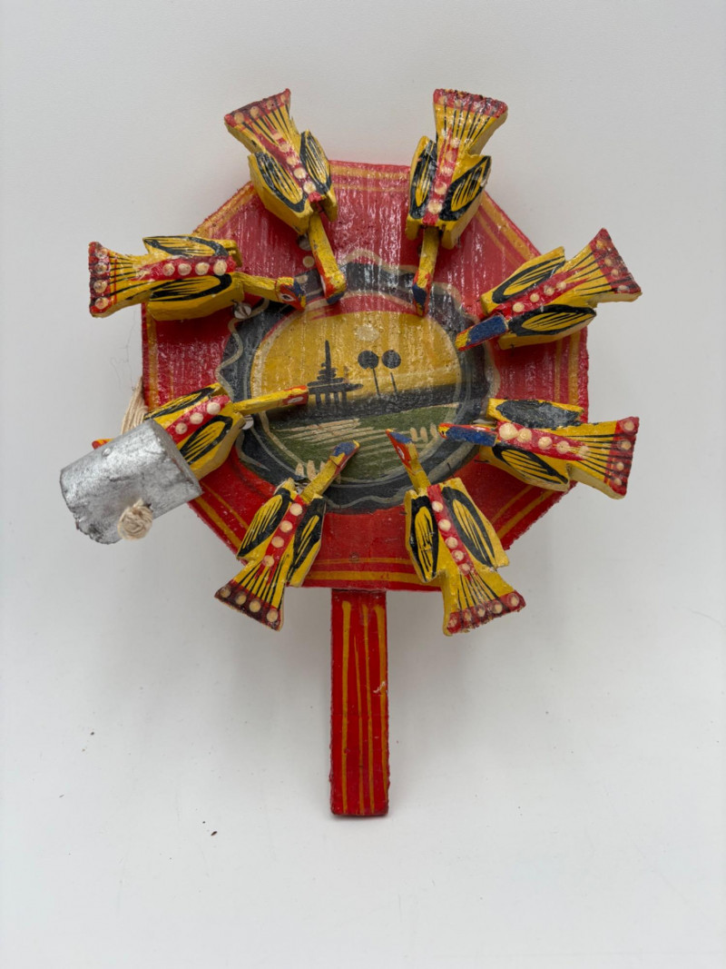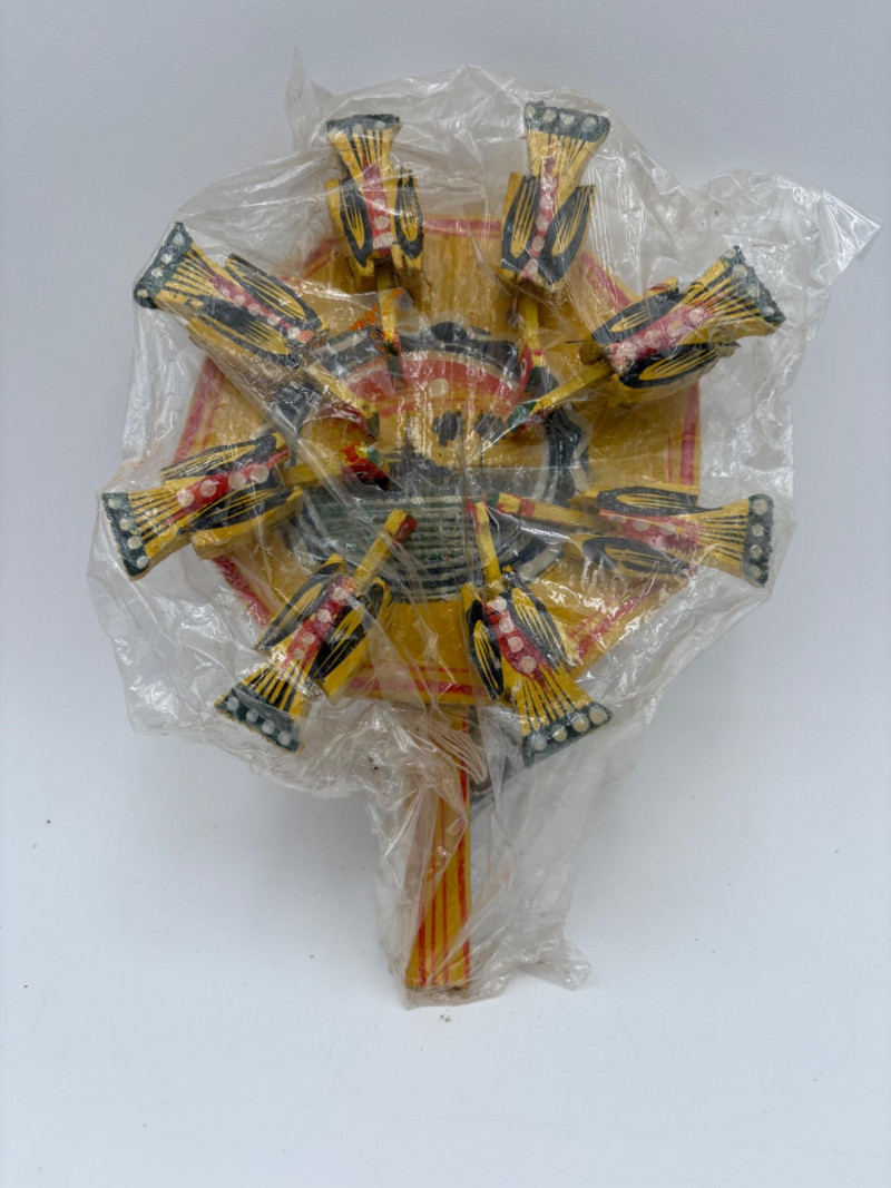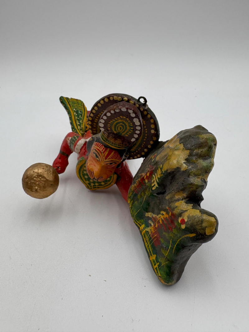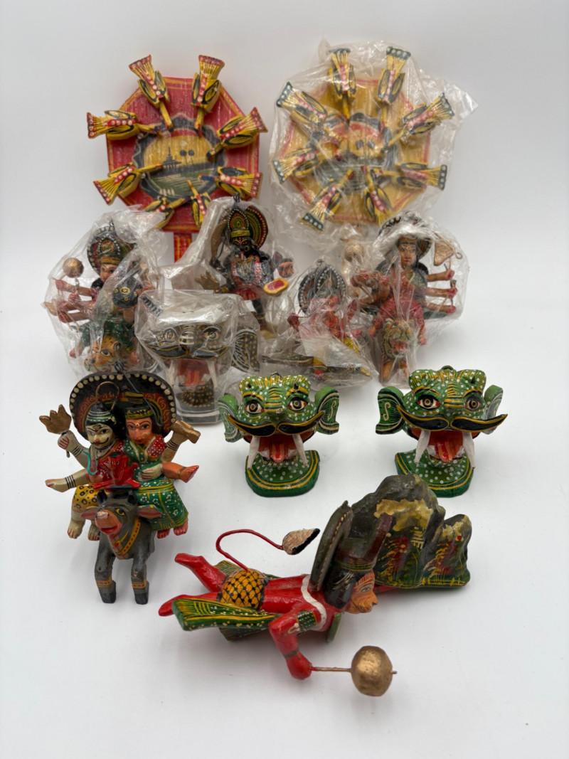 Nice group of 11 hand-made wooden Christmas ornaments & two hand-held paddle games our client picked up in India over 30 years ago. Some of the figures are still in original packaging. See photos for details. Paddles in back measure approx. 10" H.