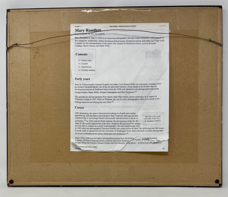 Photographer Mary Randlett (1924-2019) created iconic compositions focused on the prominent figures, landscape and architecture of the Pacific Northwest. She is well known for her portraiture of the artists that comprised the "Northwest School" movement of the 1930s and 40s. Over forty national institutions hold her work in their collections. These include the Metropolitan Museum of Art in New York City, the Smithsonian Institution in Washington D.C, and the University of Washington in Seattle. She received the Artist Trust Lifetime Achievement Award in 2001. - Arts.WA.Gov