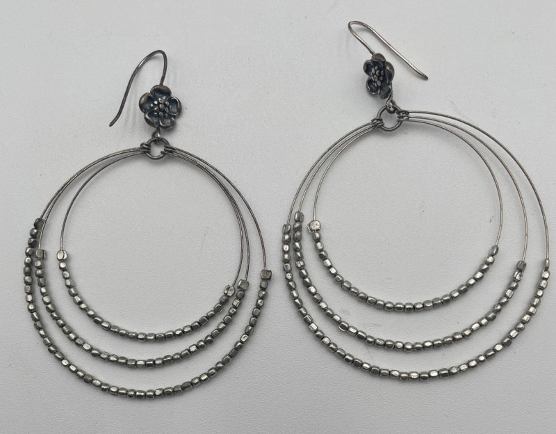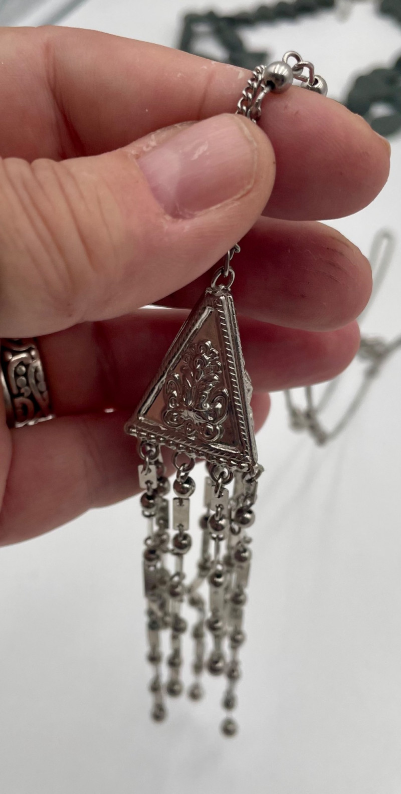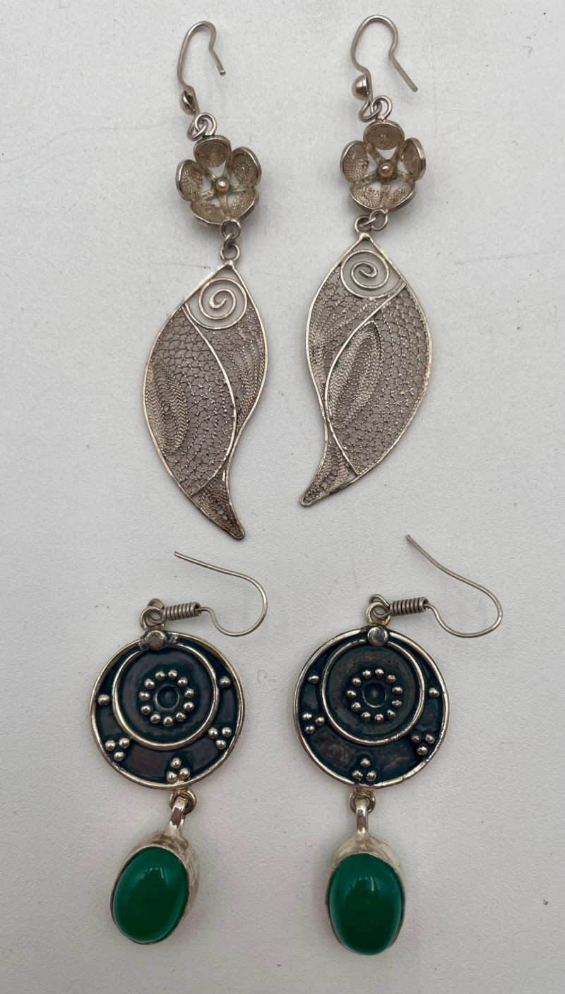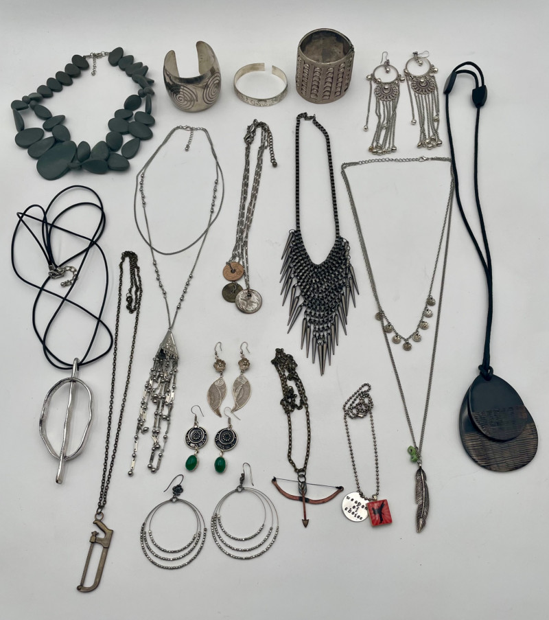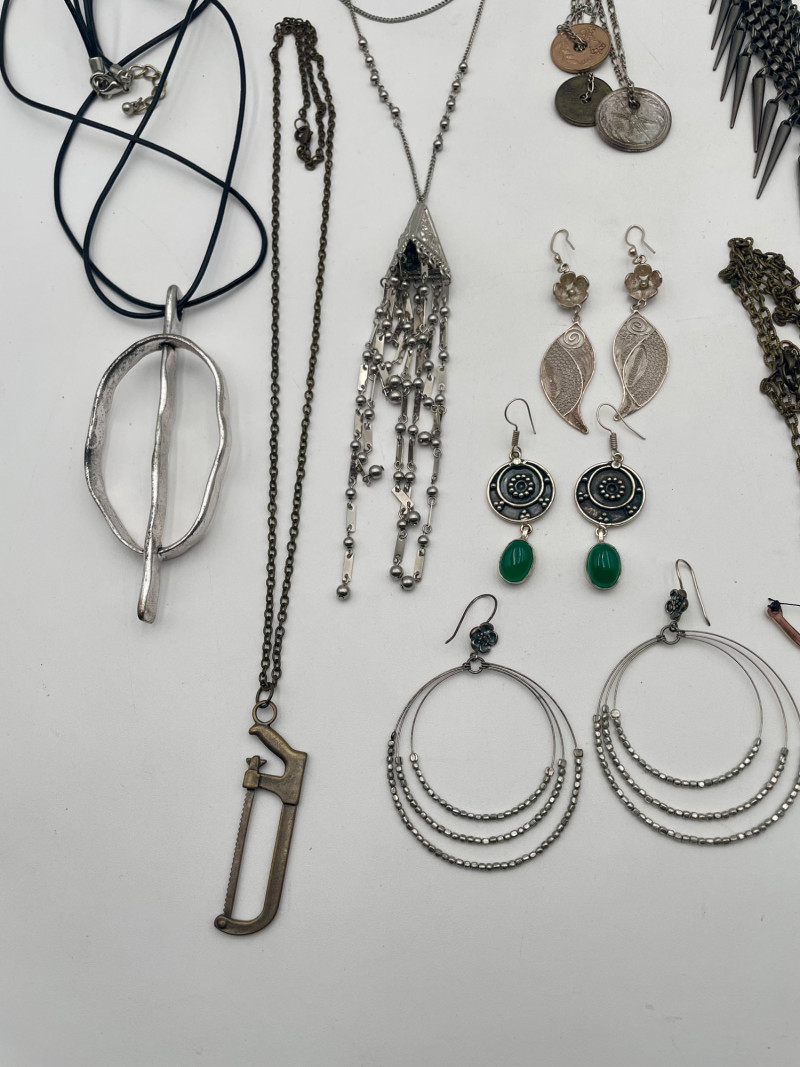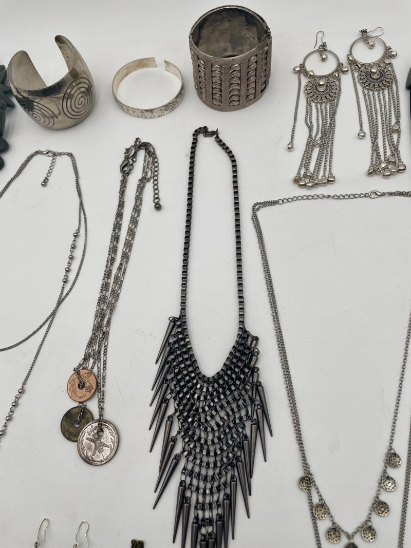 Huge lot of silver tone and some sterling jewelry including drop earrings, sterling silver earrings, spring-hinge & cuff bracelets, Lagenlook necklaces, and much more! See photos for images of each item.