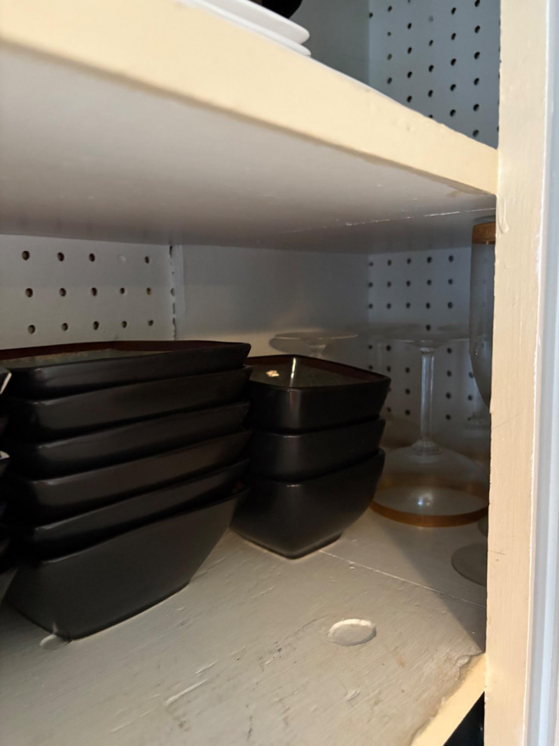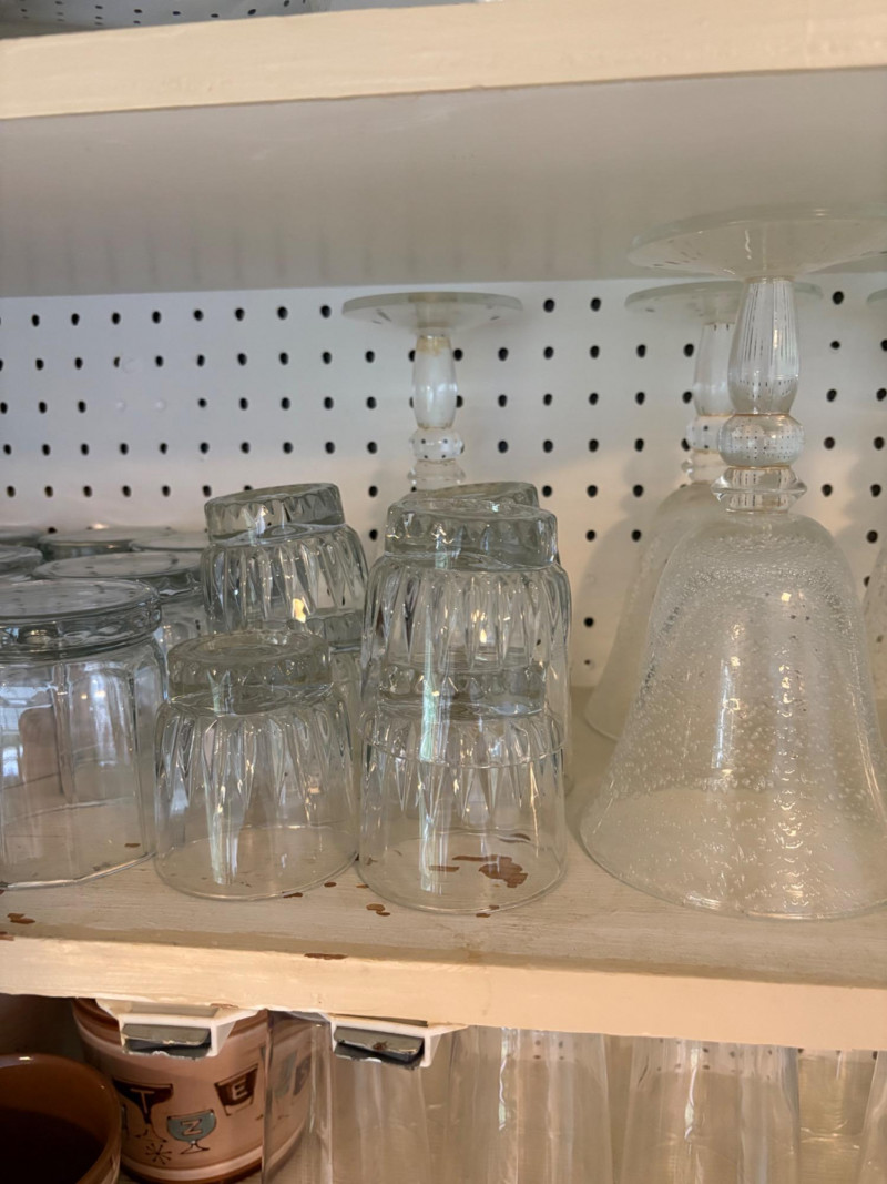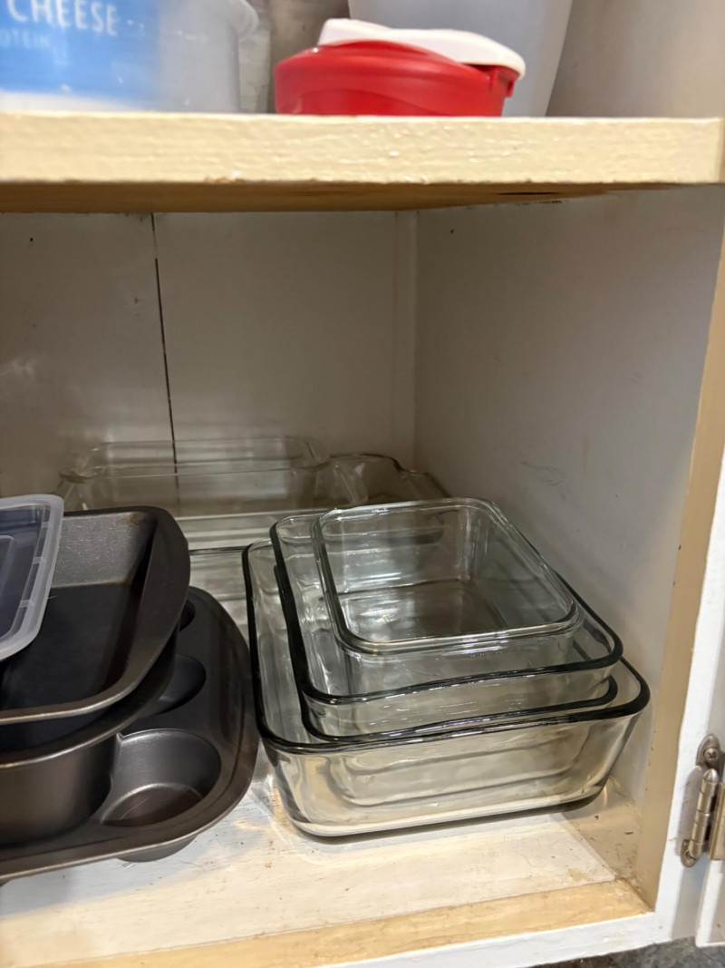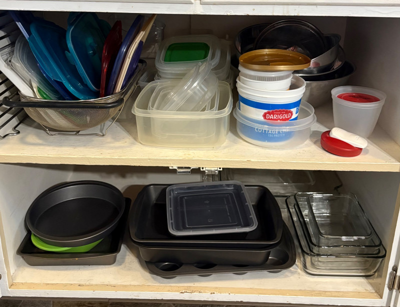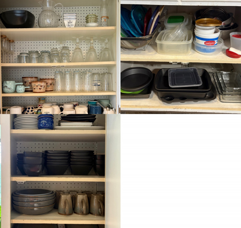 Three cabinets of bakeware, glassware, dishware, and some vintage serving dishes. What you see is what you get! Winning bidder needs to bring appropriate boxes & packing to remove all items from cabinets.