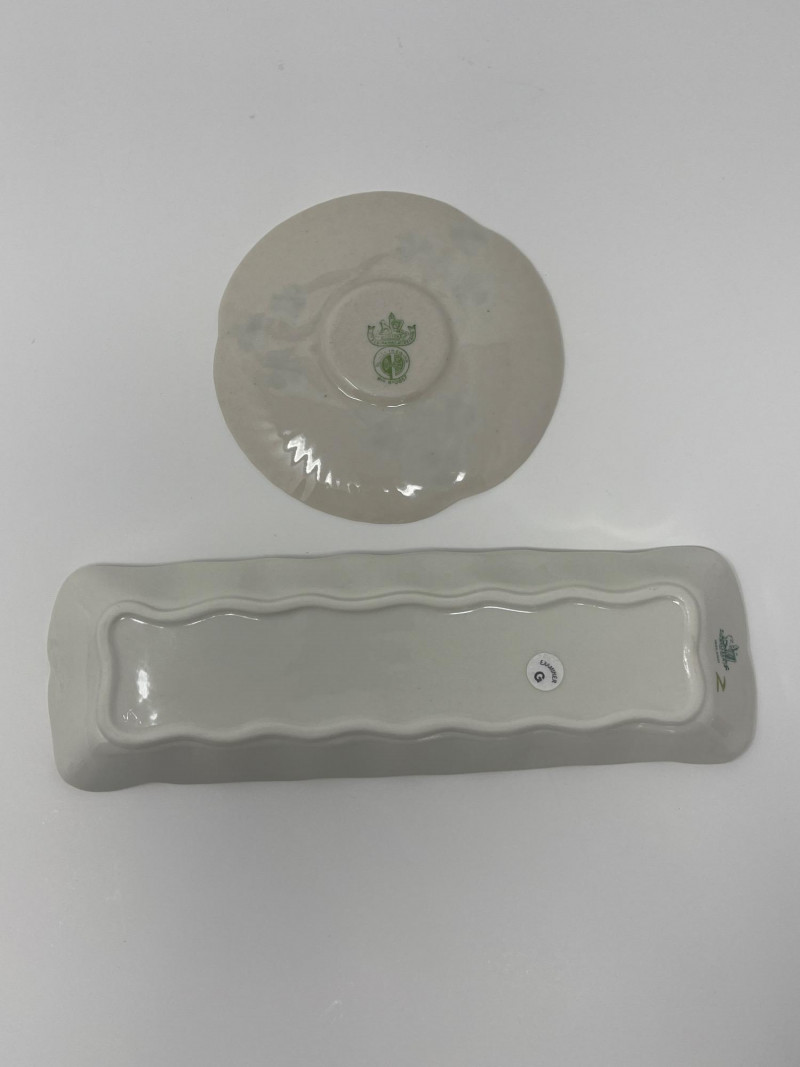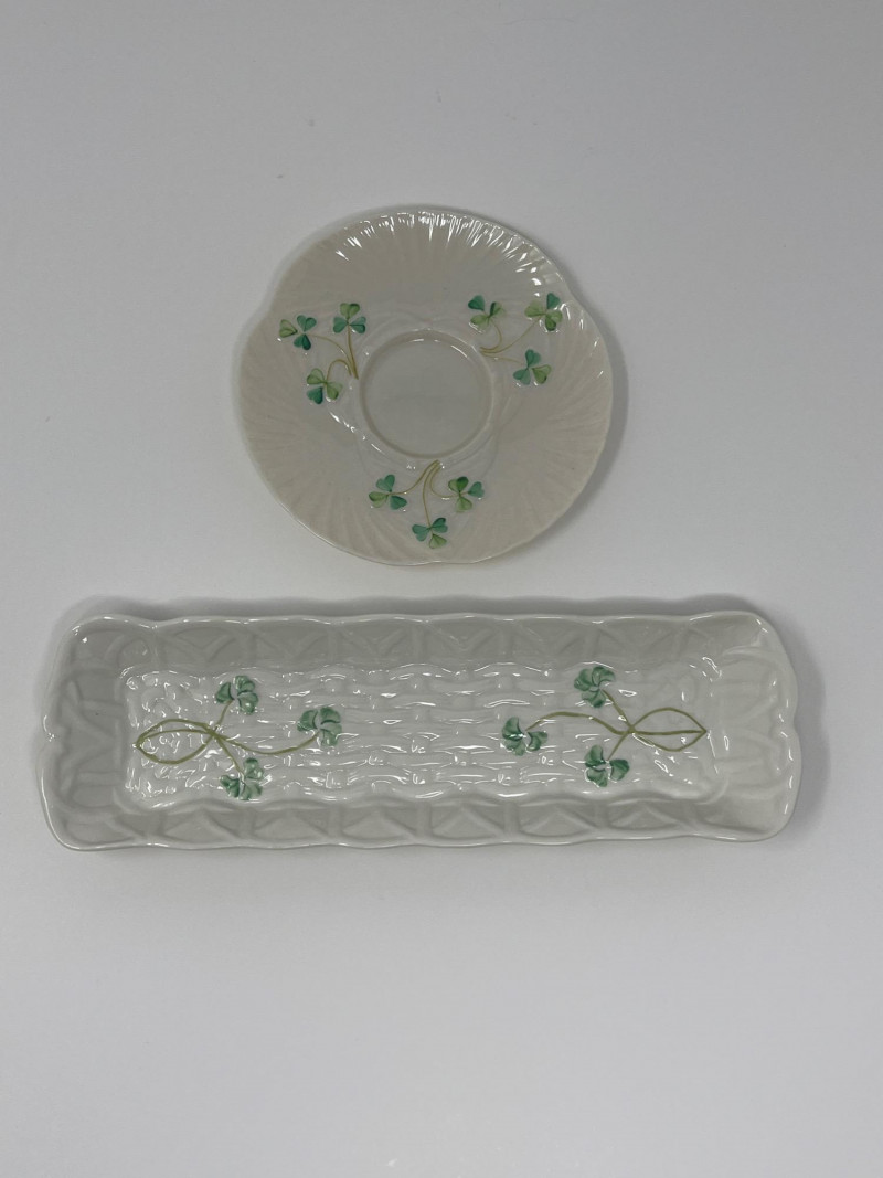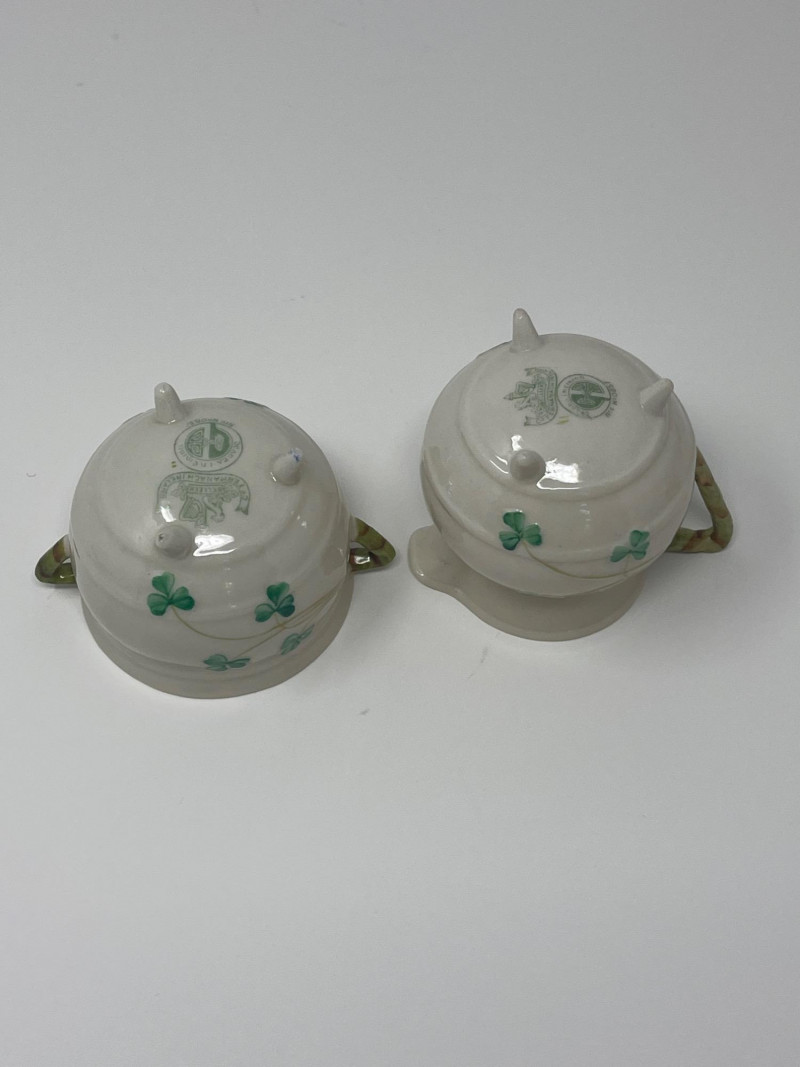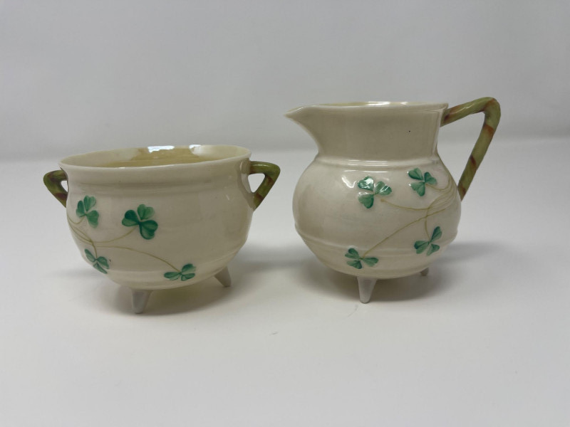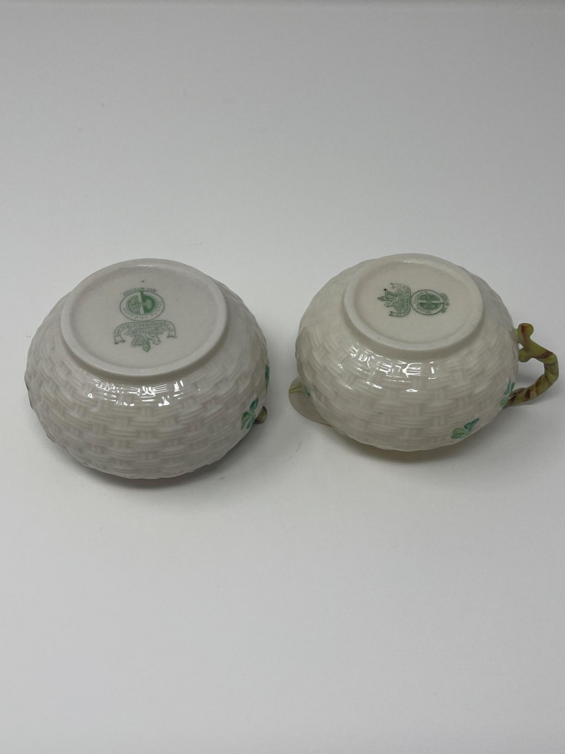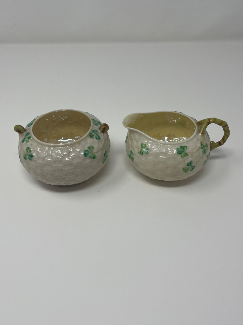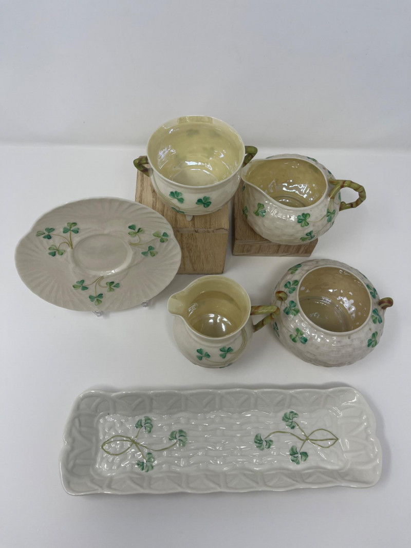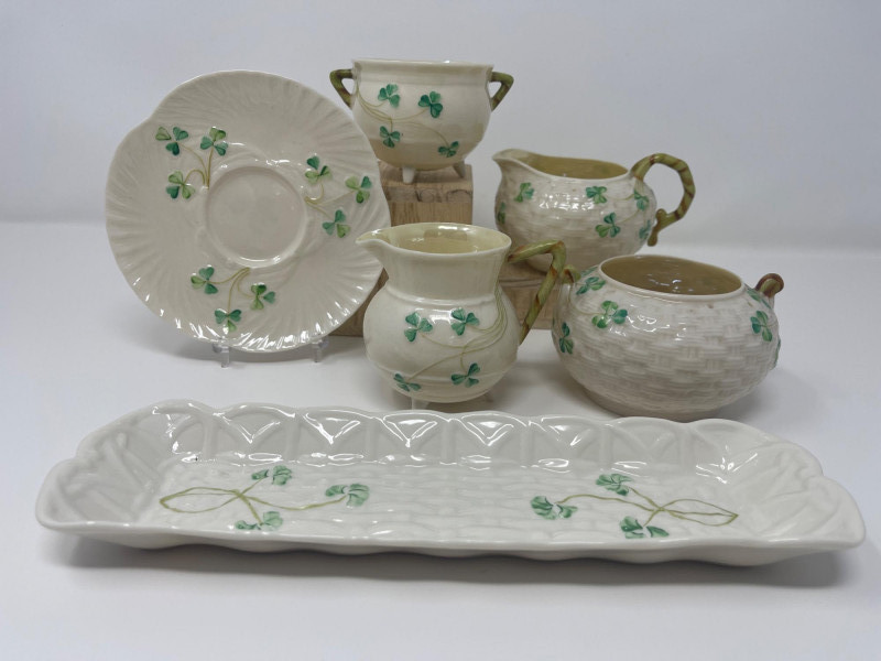Belleek Irish Bone China Creamer and Sugar Sets with Accessories Collection of Belleek Irish bone china featuring shamrock motifs and embossed patterns. Includes two creamer and sugar bowl sets with lids, one small pitcher, a round underplate, and a 9 1/2-inch relish tray. All pieces are in Belleek's signature ivory porcelain with green shamrock accents. Heights range from 2 to 3 inches.