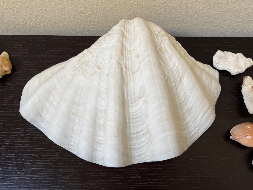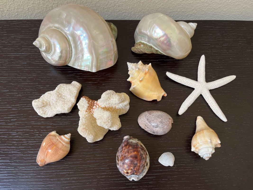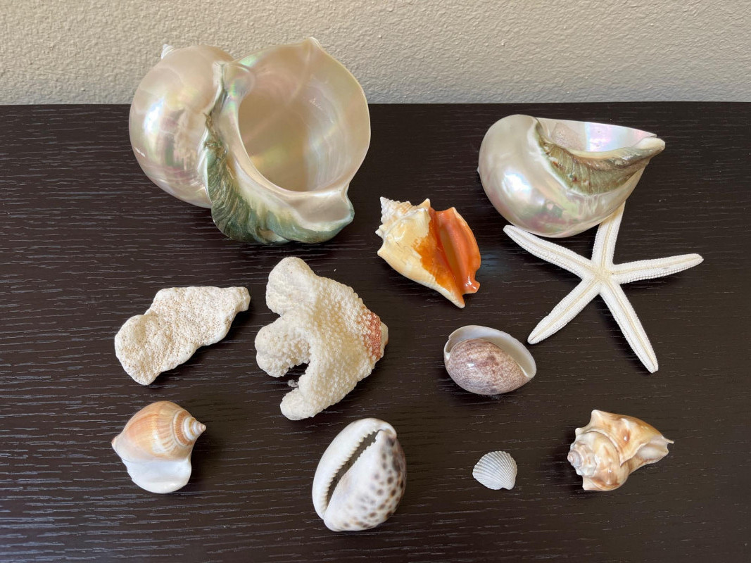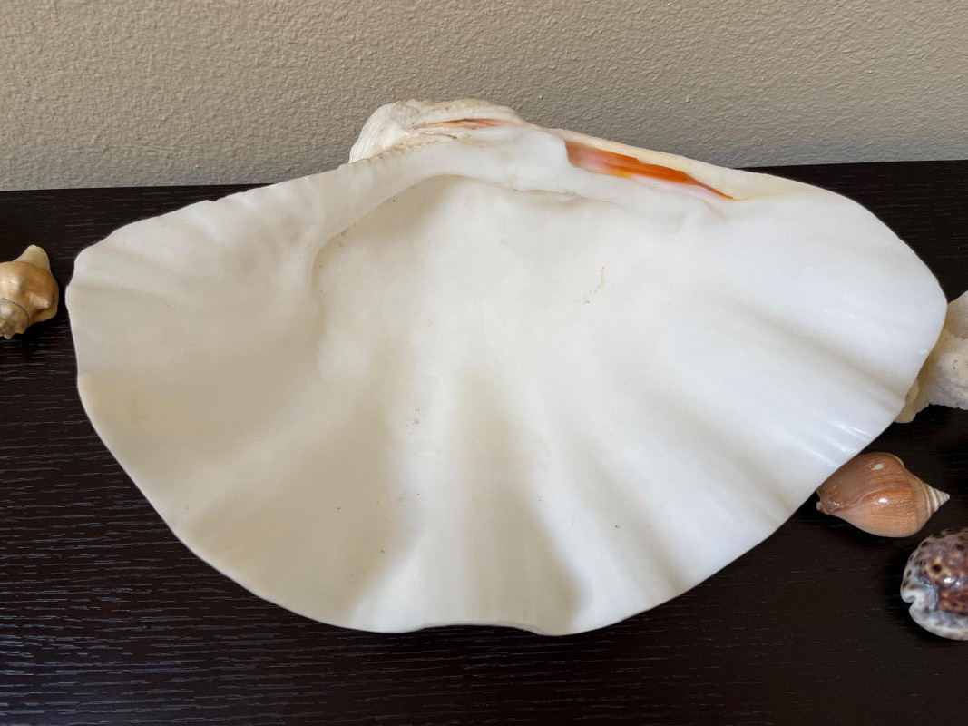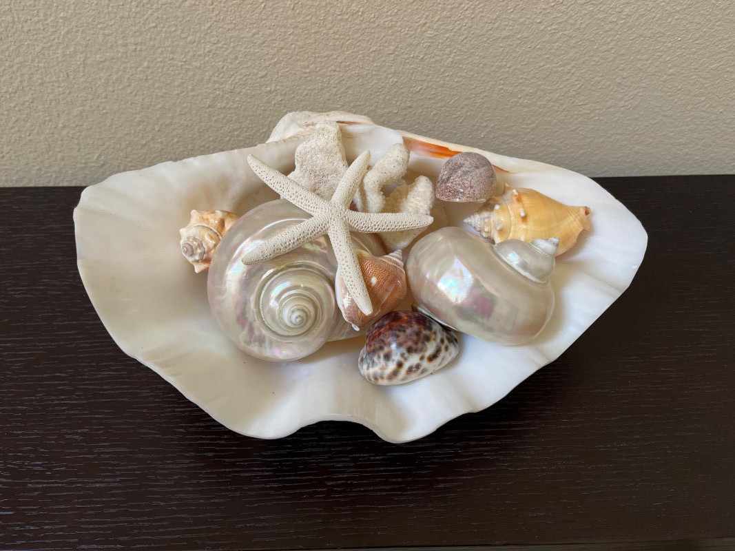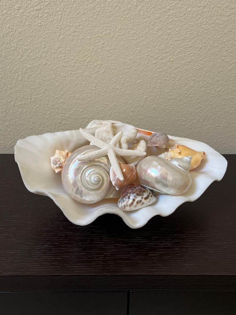 Large Shell Display with Assorted Seashells A collection of seashells and coral artfully arranged within a large shell. This coastal display features an array of marine shells, including lustrous mother-of-pearl shells, smooth cowrie shells, vibrant conch fragments, textured coral pieces, and a delicate starfish. The natural hues of pearlescent white, sandy beige, and coral orange create a beach-inspired aesthetic, perfect for adding a touch of coastal charm to any space. Key Features: