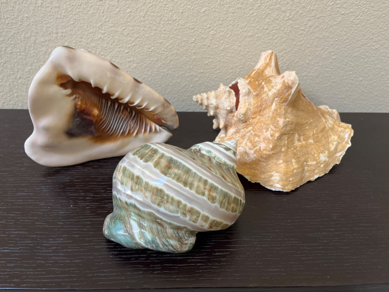Three Large Decorative Shells Group of three large marine shells, each with distinct form and surface pattern. Includes a ridged Conch shell with orange and cream tones, a green and white Nautilus shell with spiraled lines, and a Spiny Murex shell with extended points and ridges.