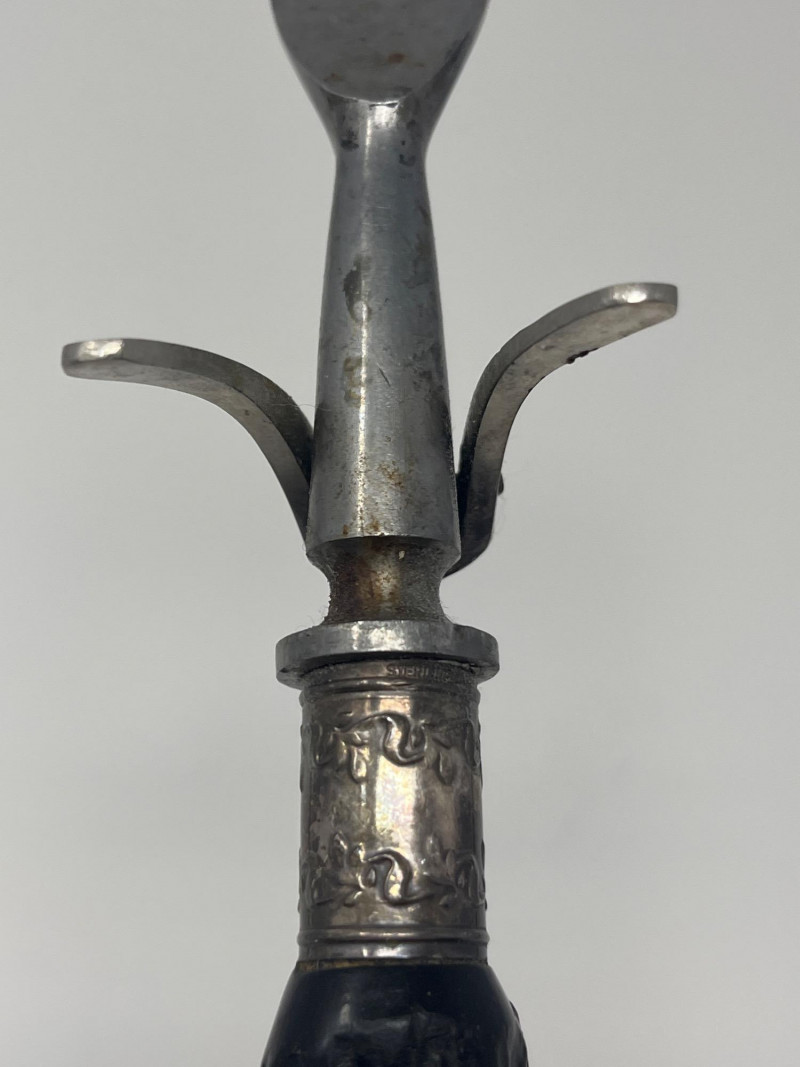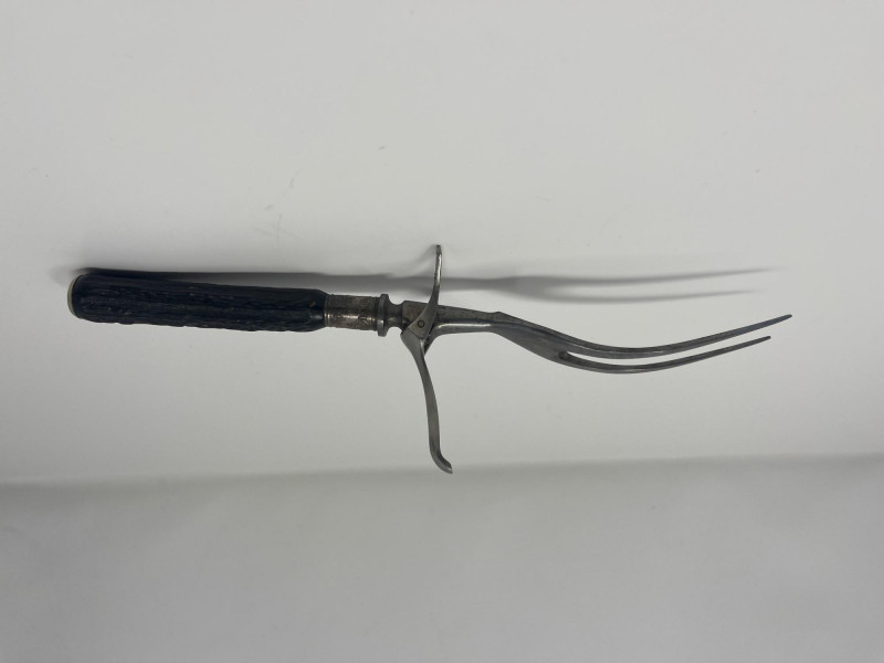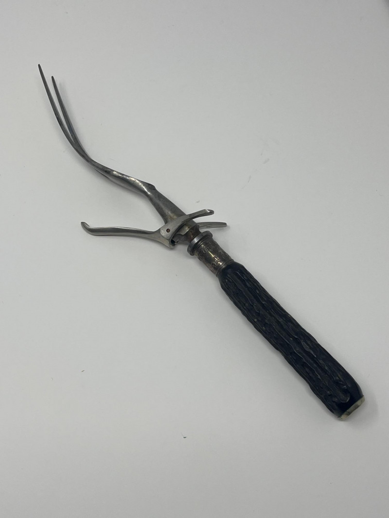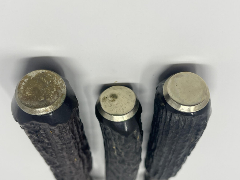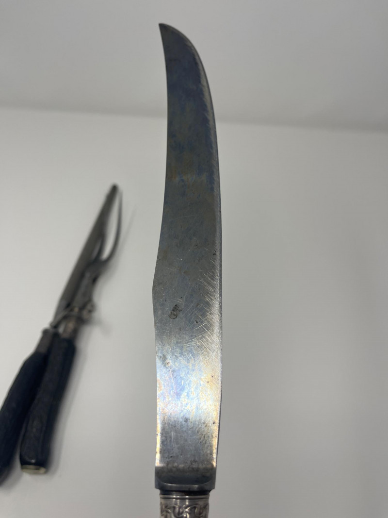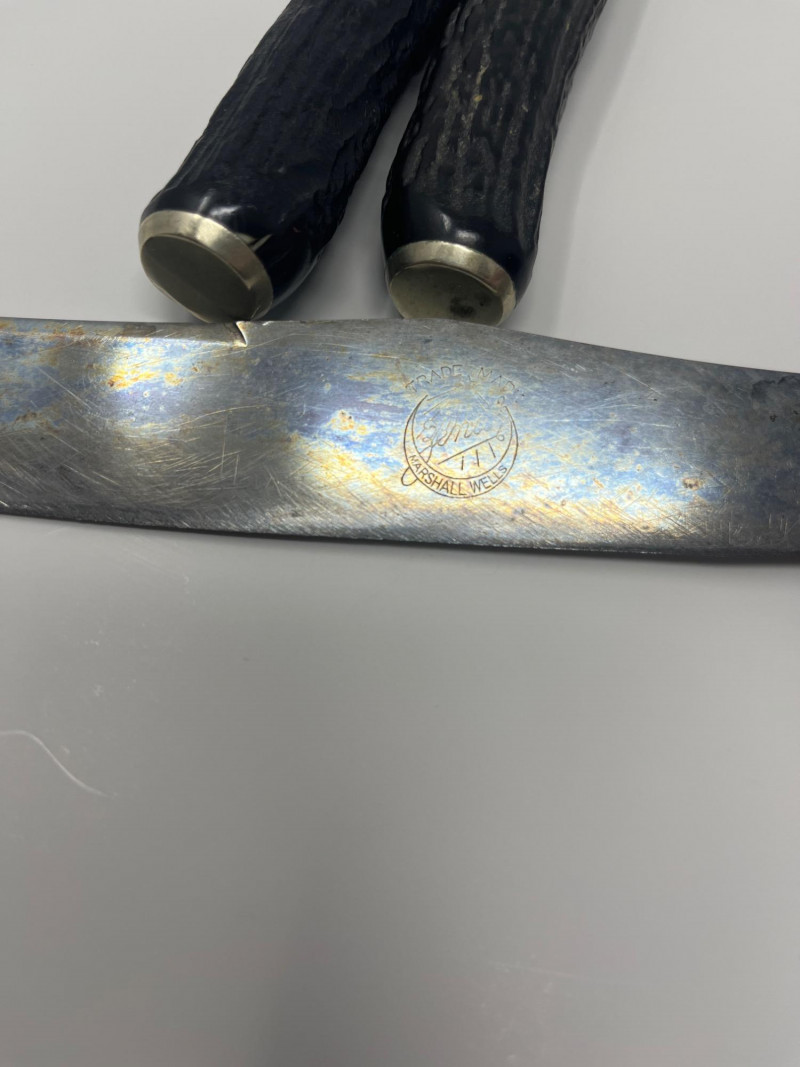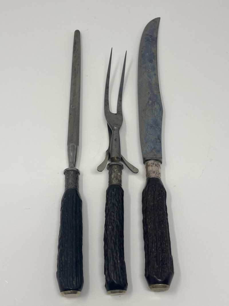 Vintage Carving Set with Antler Handles Three-piece carving set featuring antler handles. Includes a carving knife marked "Marshall Wells," a meat fork made of stainless steel with no visible markings, and a sharpening steel with partially legible "Lee" marking. Each piece varies slightly in weight and form. Key Features: