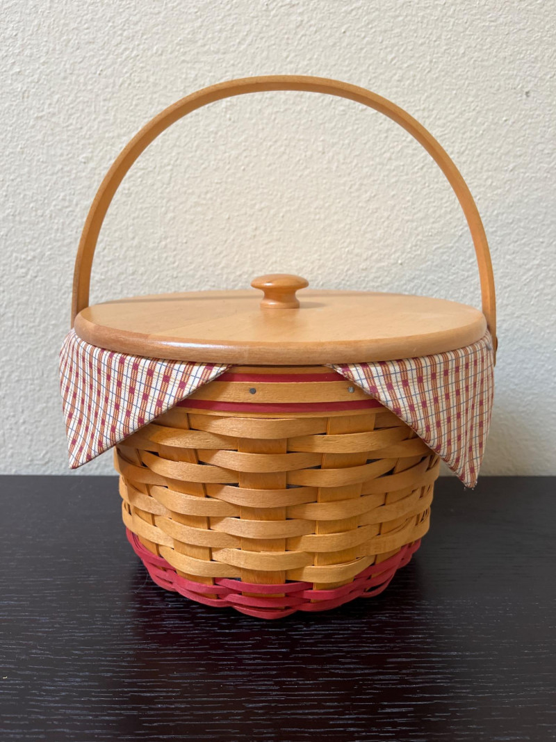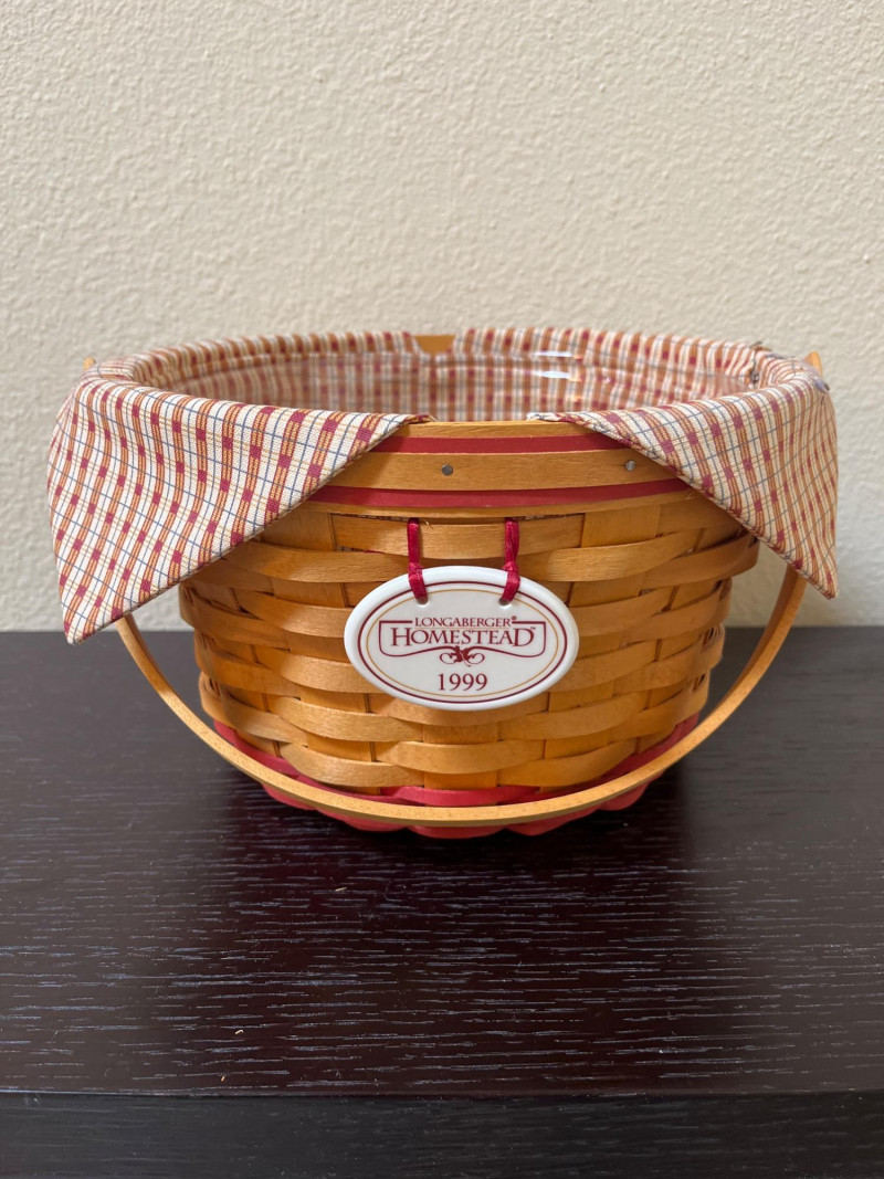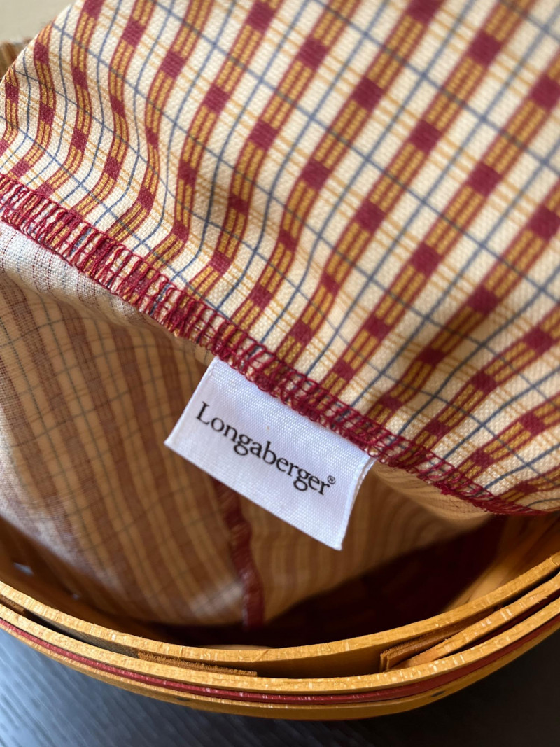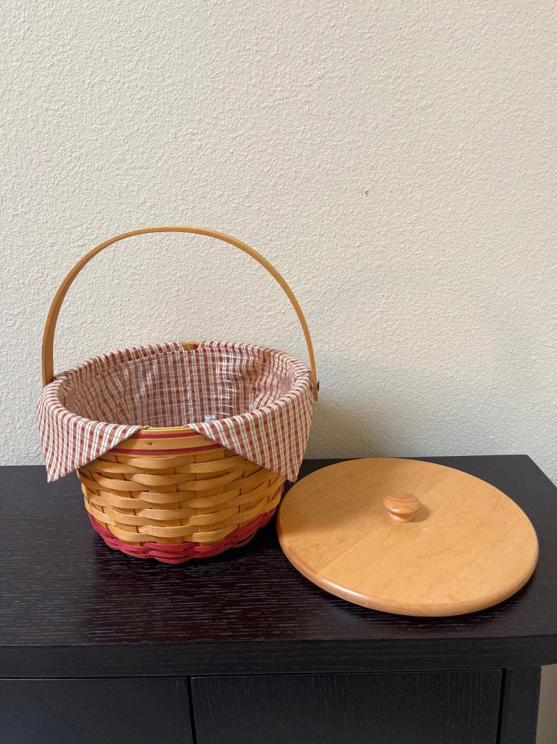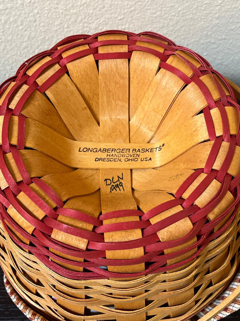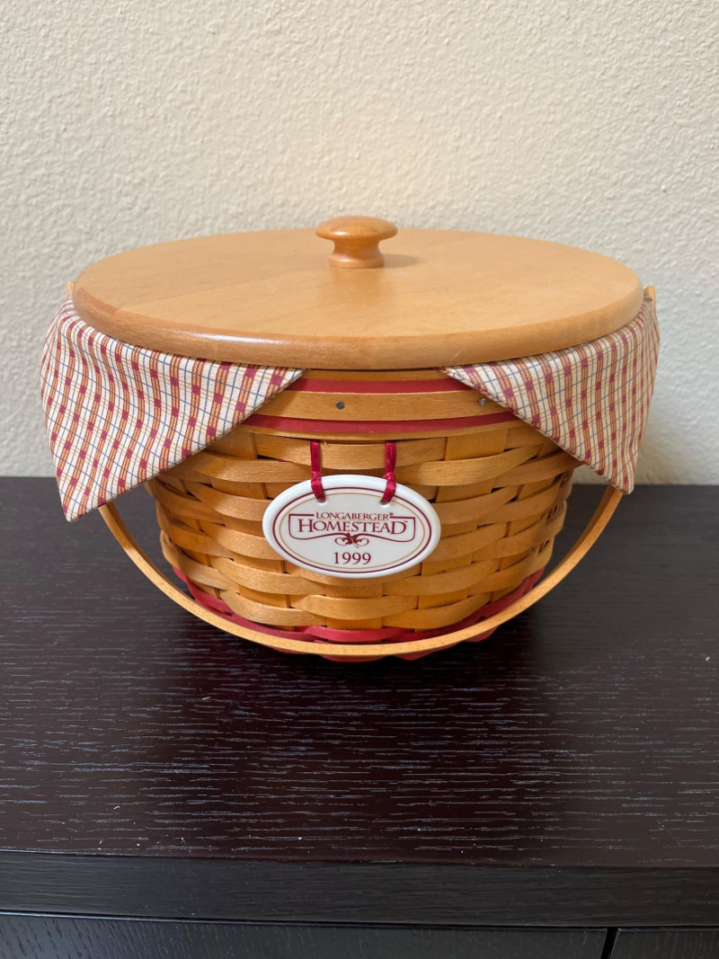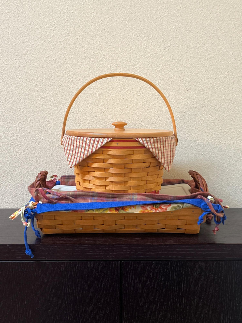Longaberger Basket Set with Lid and Serving Basket – 2 Pieces This set includes a 1999 Longaberger round basket with a wooden lid, swing handle, and removable cloth liner in a red gingham pattern and a clear plastic insert. The basket measures approximately 6" tall without the handle, 11" with the handle, and 10" in diameter. Also included is a rectangular Longaberger serving basket (marked 2008) measuring 15" x 10.5" x 3". It features braided leather handles, a plastic insert with lid, a floral cloth liner, and two additional drawstring liners in coordinating colors.