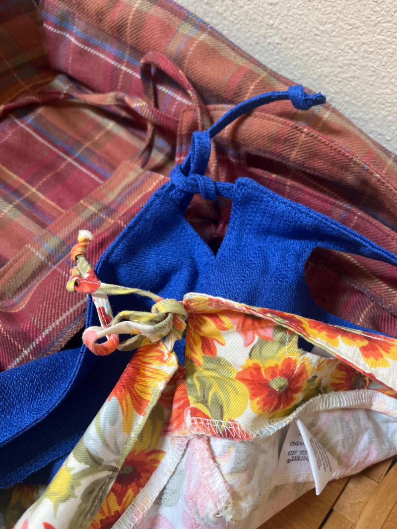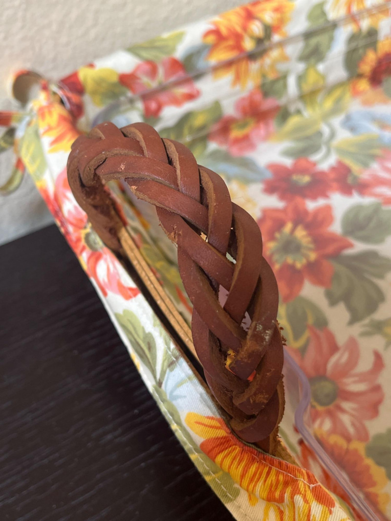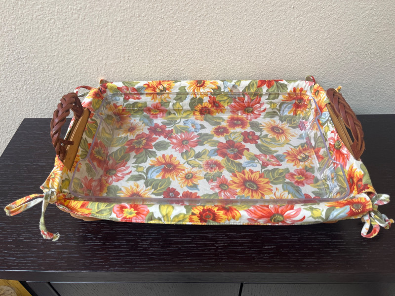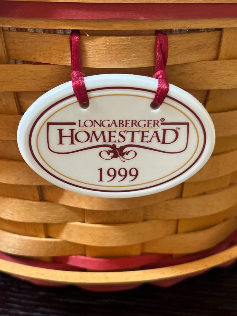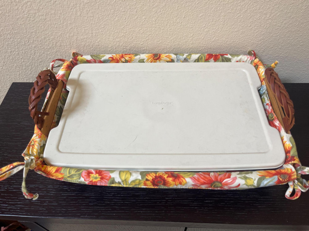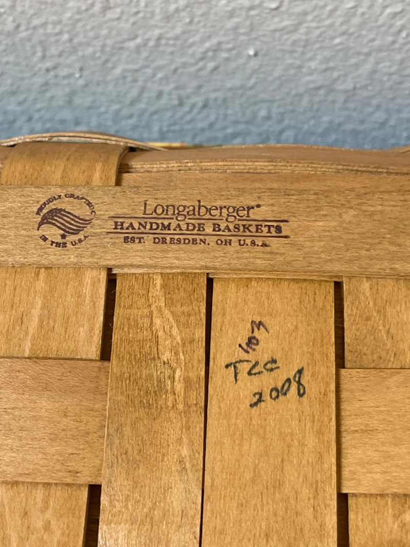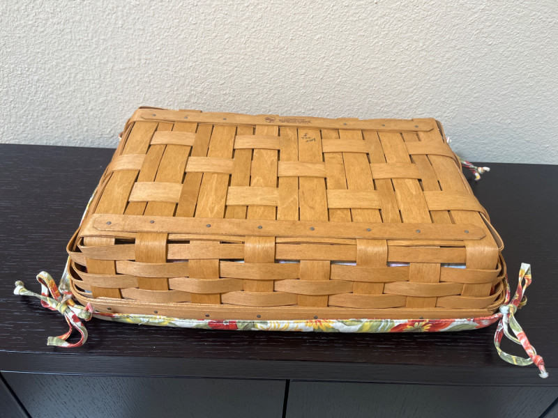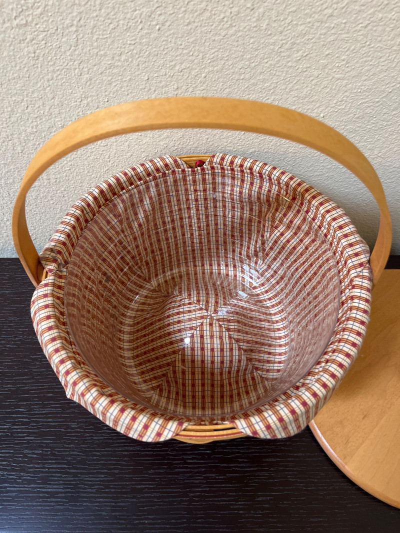 Longaberger Basket Set with Lid and Serving Basket – 2 Pieces This set includes a 1999 Longaberger round basket with a wooden lid, swing handle, and removable cloth liner in a red gingham pattern and a clear plastic insert. The basket measures approximately 6" tall without the handle, 11" with the handle, and 10" in diameter. Also included is a rectangular Longaberger serving basket (marked 2008) measuring 15" x 10.5" x 3". It features braided leather handles, a plastic insert with lid, a floral cloth liner, and two additional drawstring liners in coordinating colors.