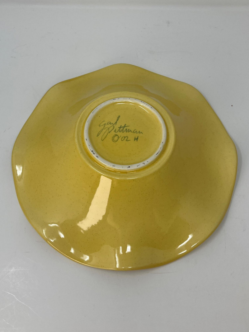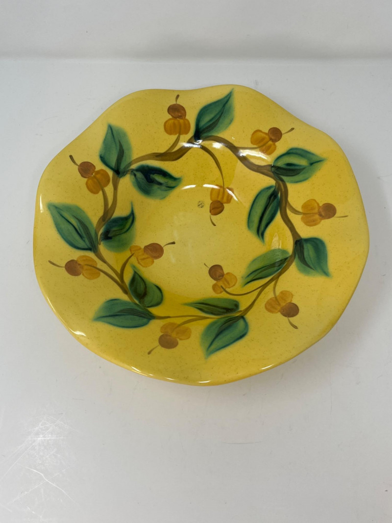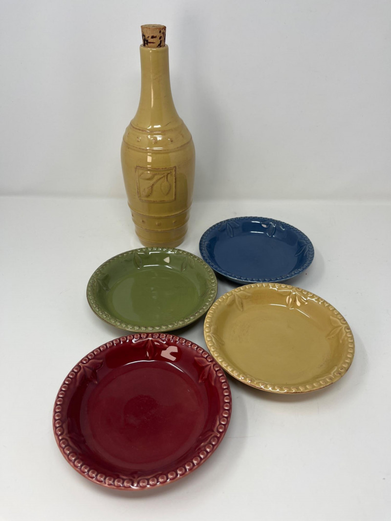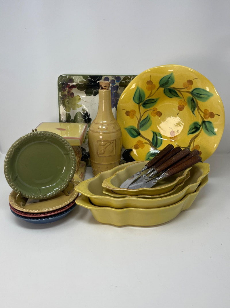 Mediterranean Style Set Collection with Mediterranean influences featuring a mix of hand-painted and stoneware pieces. Includes a 10 1/2" yellow platter signed by Gail Pittman with cherry blossom motifs, and several pieces made in Portugal by Grestel, including wavy-edge serving bowls (largest is 12 1/2" wide). A ceramic tray decorated with grapes and leaves measures 14" wide. Also included are a decorative ceramic bottle, a 5 1/2" tall yellow pedestal with floral details, a set of six cheese spreaders with wooden handles and stainless blades, and assorted small plates in green, red, and yellow.