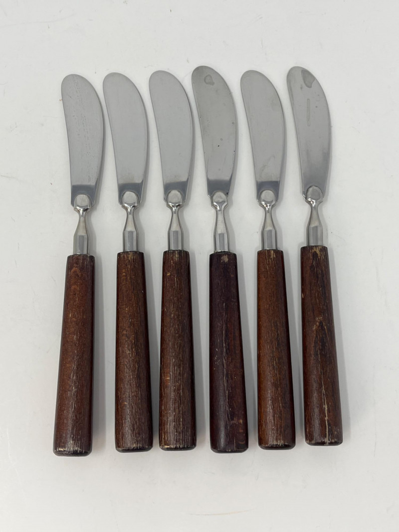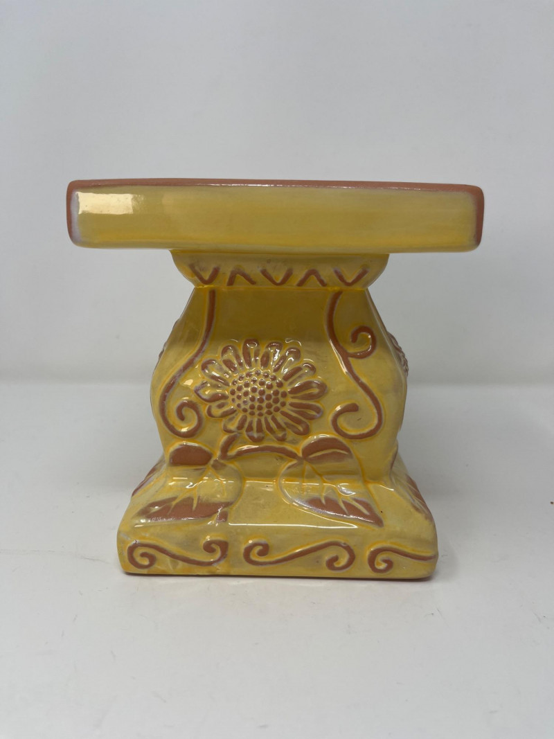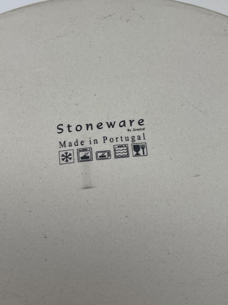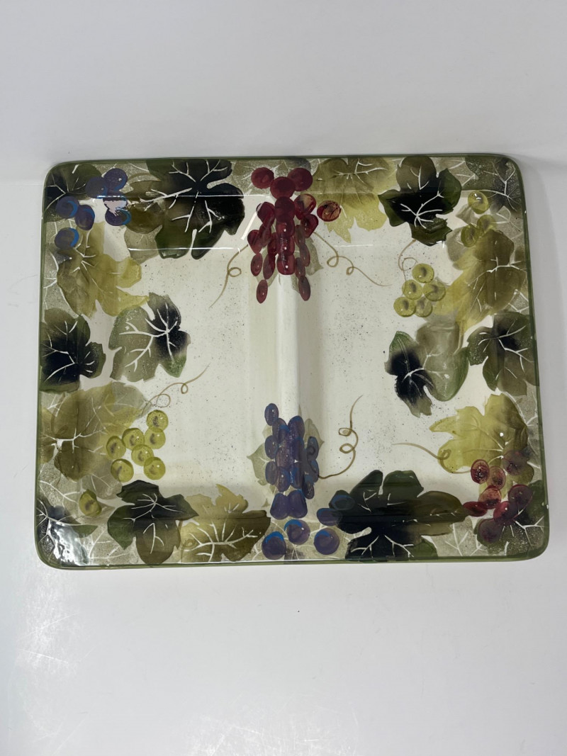 Mediterranean Style Set Collection with Mediterranean influences featuring a mix of hand-painted and stoneware pieces. Includes a 10 1/2" yellow platter signed by Gail Pittman with cherry blossom motifs, and several pieces made in Portugal by Grestel, including wavy-edge serving bowls (largest is 12 1/2" wide). A ceramic tray decorated with grapes and leaves measures 14" wide. Also included are a decorative ceramic bottle, a 5 1/2" tall yellow pedestal with floral details, a set of six cheese spreaders with wooden handles and stainless blades, and assorted small plates in green, red, and yellow.