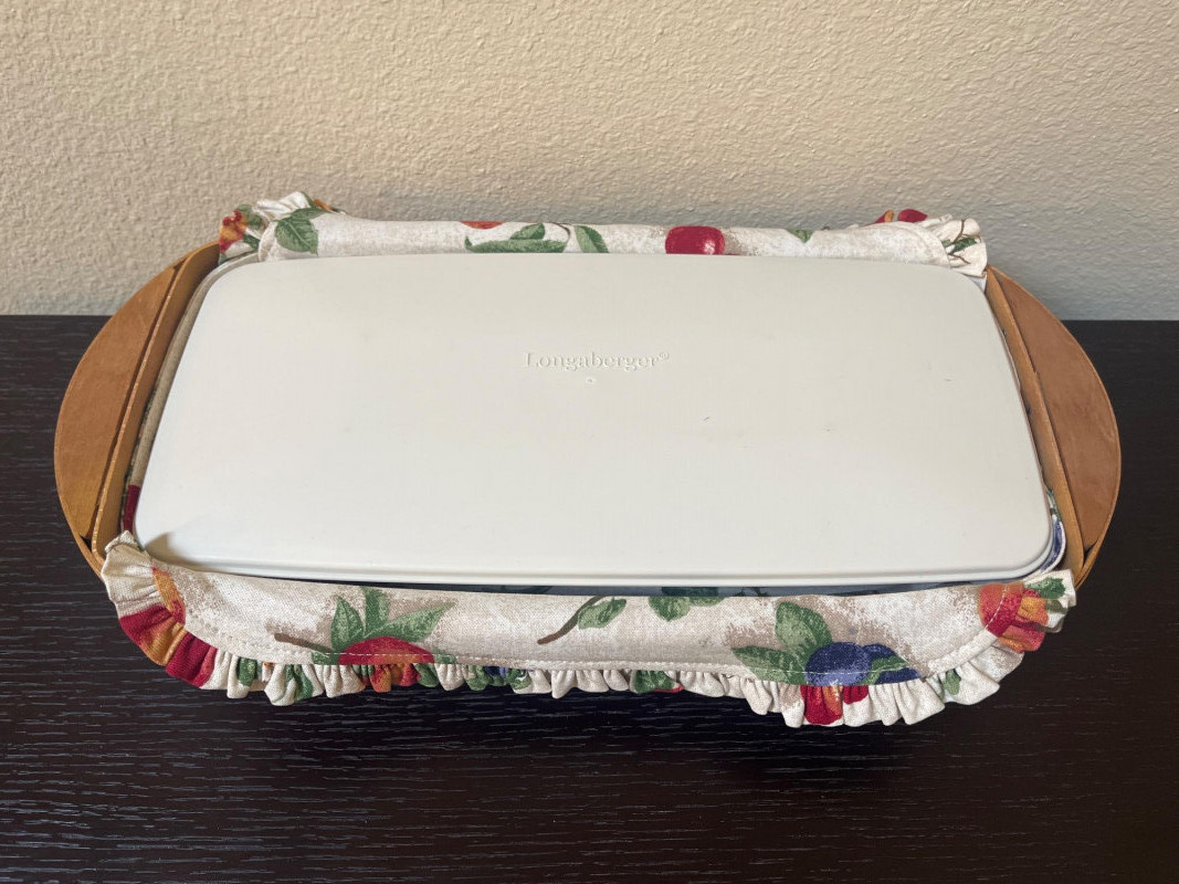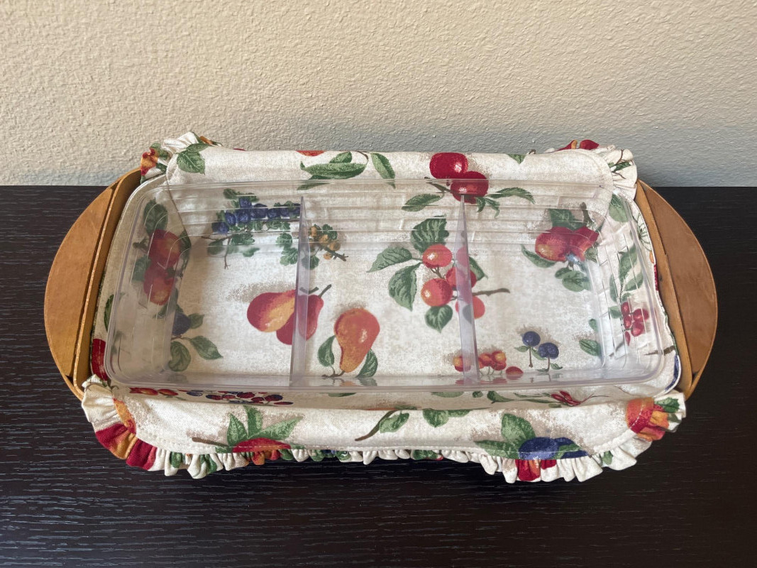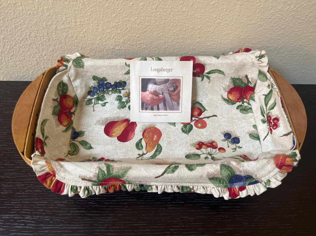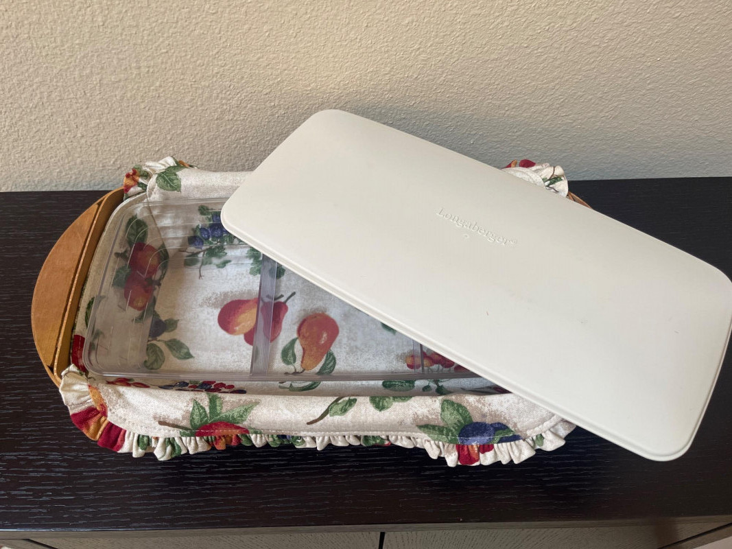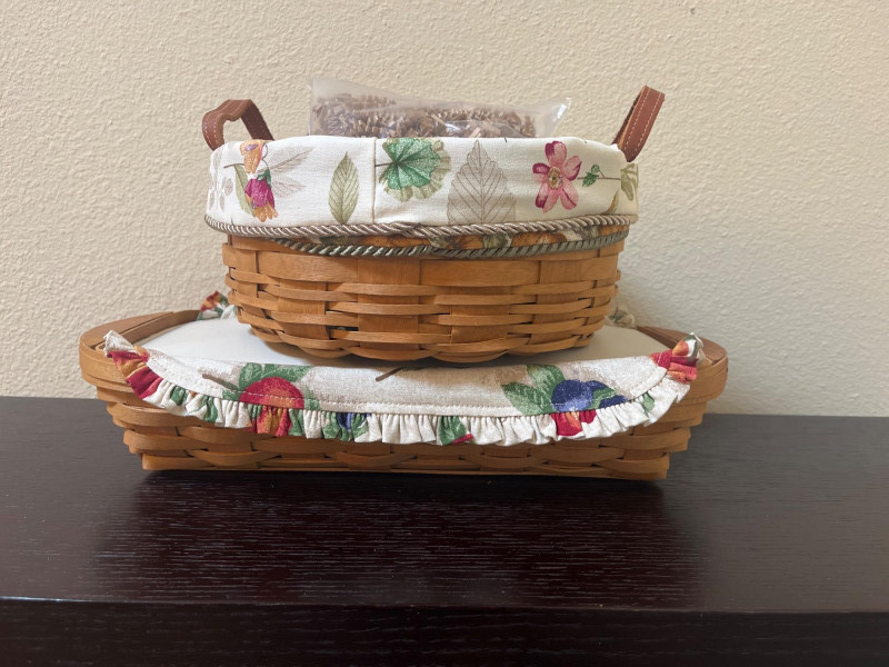 Longaberger Basket & Insert Set Set includes two Longaberger woven baskets with liners and accessories. The oblong serving basket measures approximately 16" x 8" and comes with a clear divided plastic insert, a white fitted lid, and a gathered fruit-pattern fabric liner. The round basket measures 10" in diameter and 5" tall (excluding handles), with leather carrying handles. It includes three interchangeable fabric liners: a floral botanical print, a green pattern with small white flowers, and a pumpkin-themed insert. A sealed bag of original basket filler is also included.