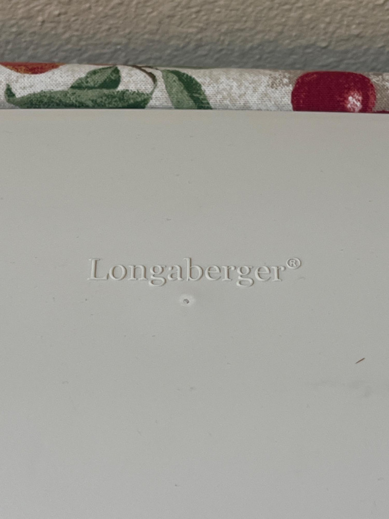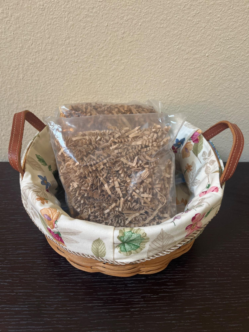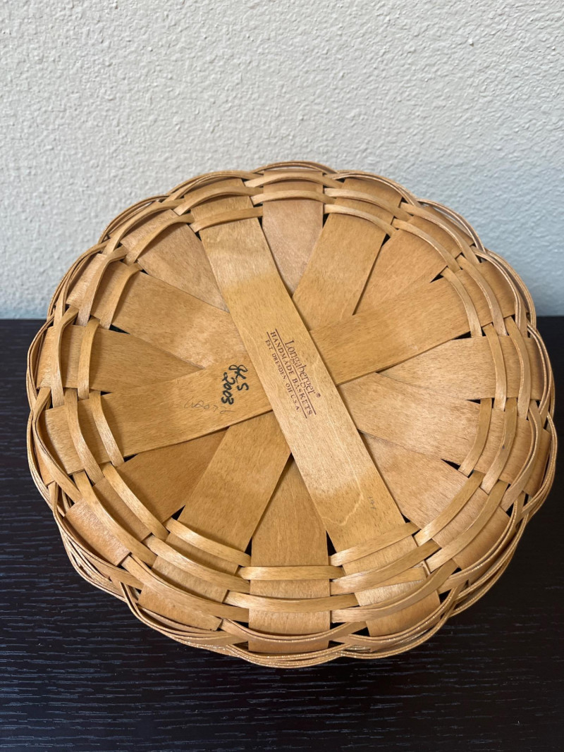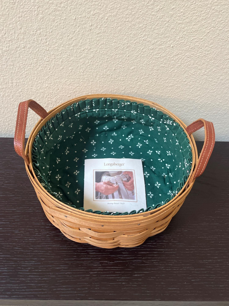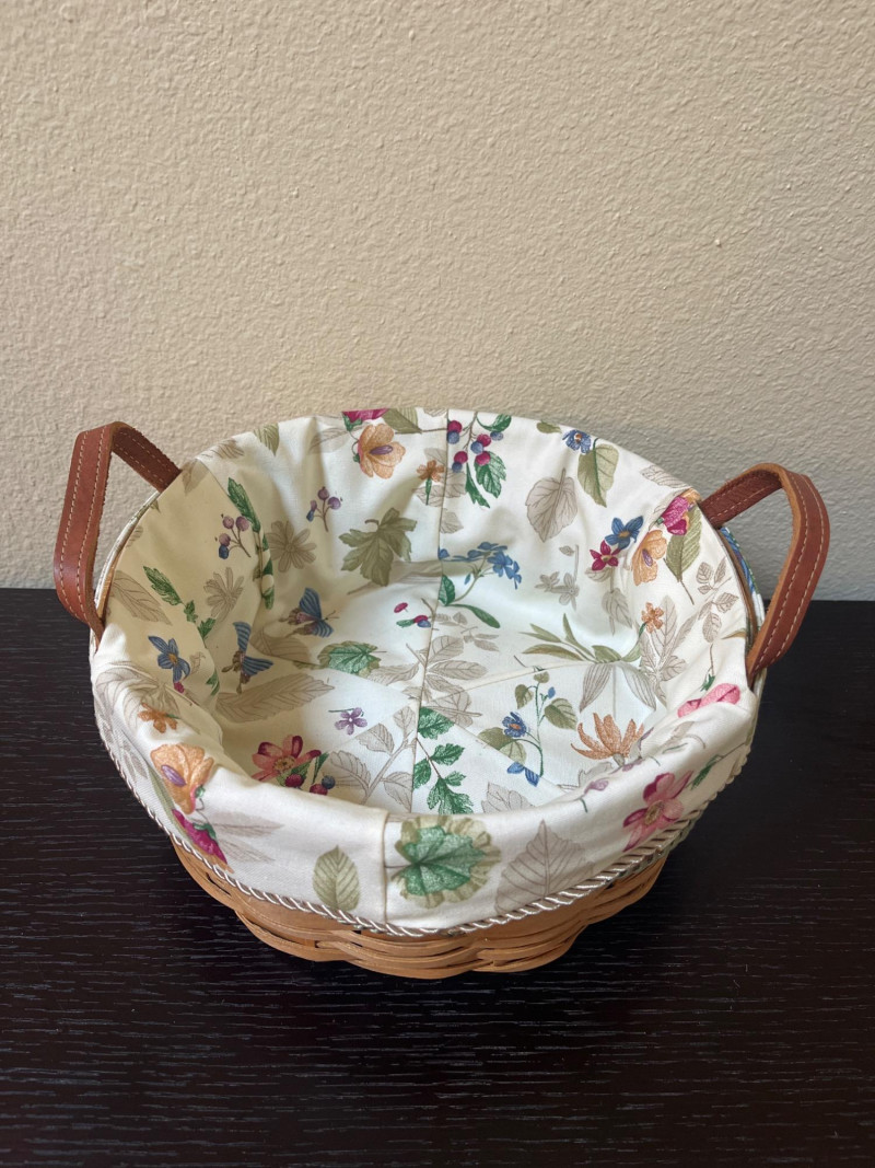 Longaberger Basket & Insert Set Set includes two Longaberger woven baskets with liners and accessories. The oblong serving basket measures approximately 16" x 8" and comes with a clear divided plastic insert, a white fitted lid, and a gathered fruit-pattern fabric liner. The round basket measures 10" in diameter and 5" tall (excluding handles), with leather carrying handles. It includes three interchangeable fabric liners: a floral botanical print, a green pattern with small white flowers, and a pumpkin-themed insert. A sealed bag of original basket filler is also included.