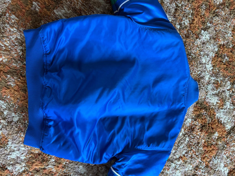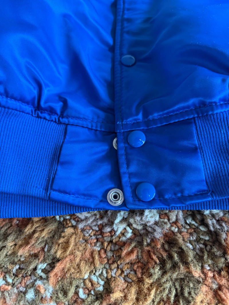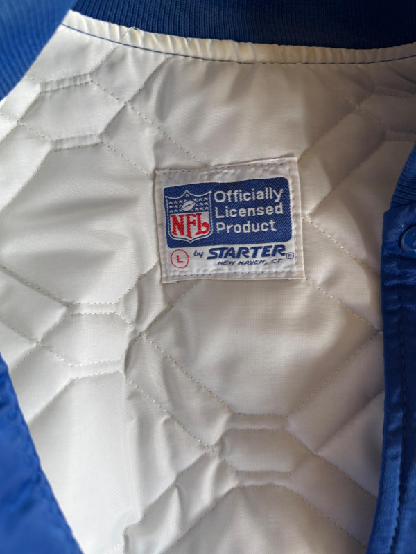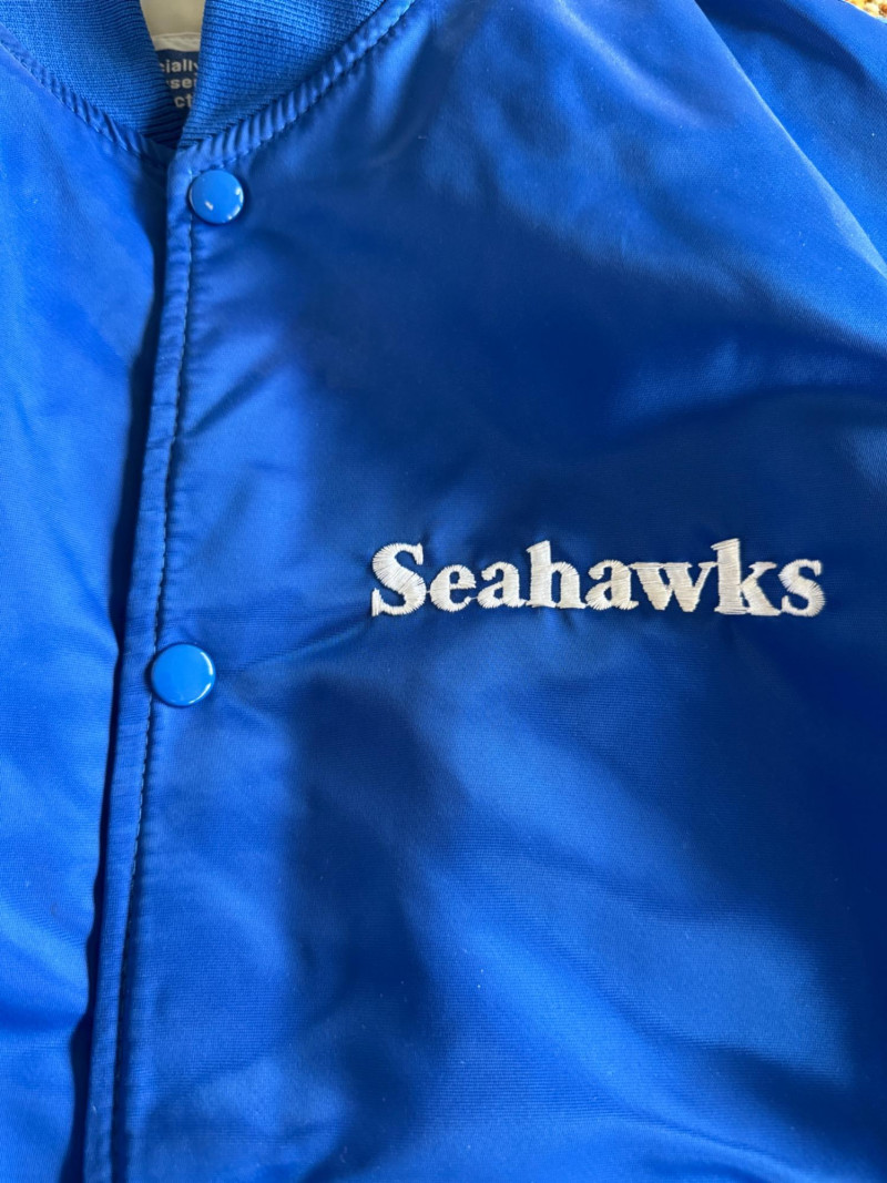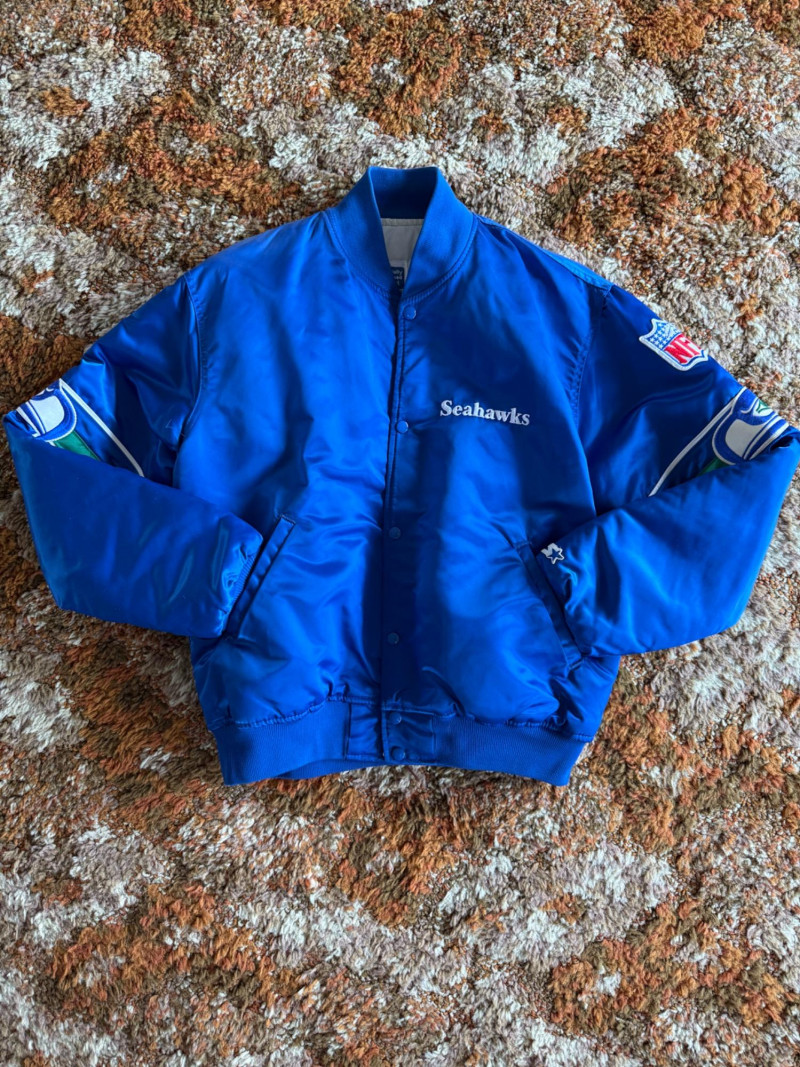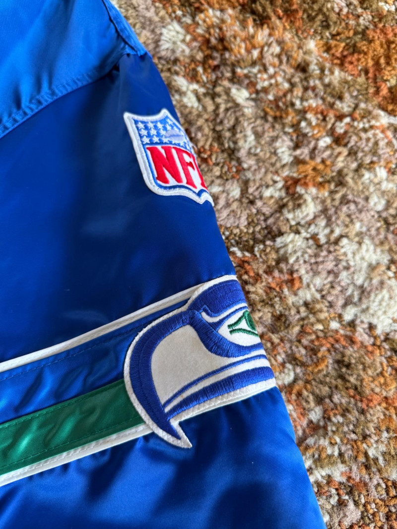 Classic Seattle Seahawks NFL Starter jacket in vibrant royal blue with embroidered logo on the chest and bold sleeve graphics. Features quilted white interior lining, front snap buttons, ribbed cuffs and hem, and side pockets. Measurements: Pit to pit: 21.5" Neck to hem: 22"