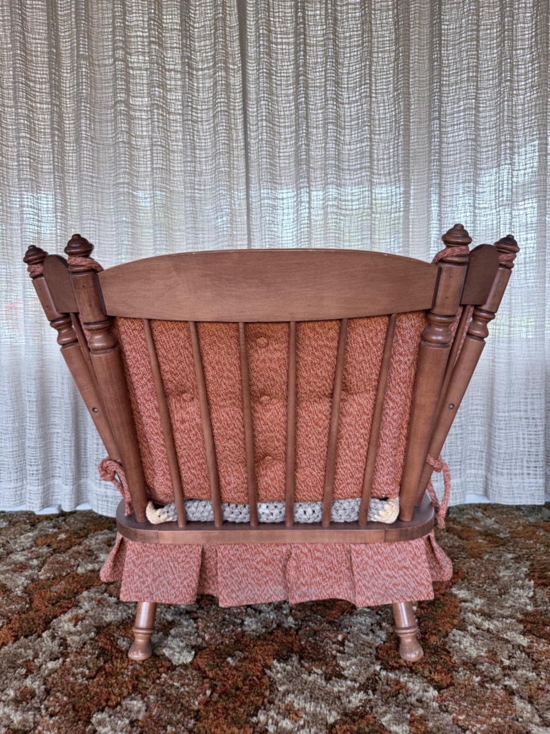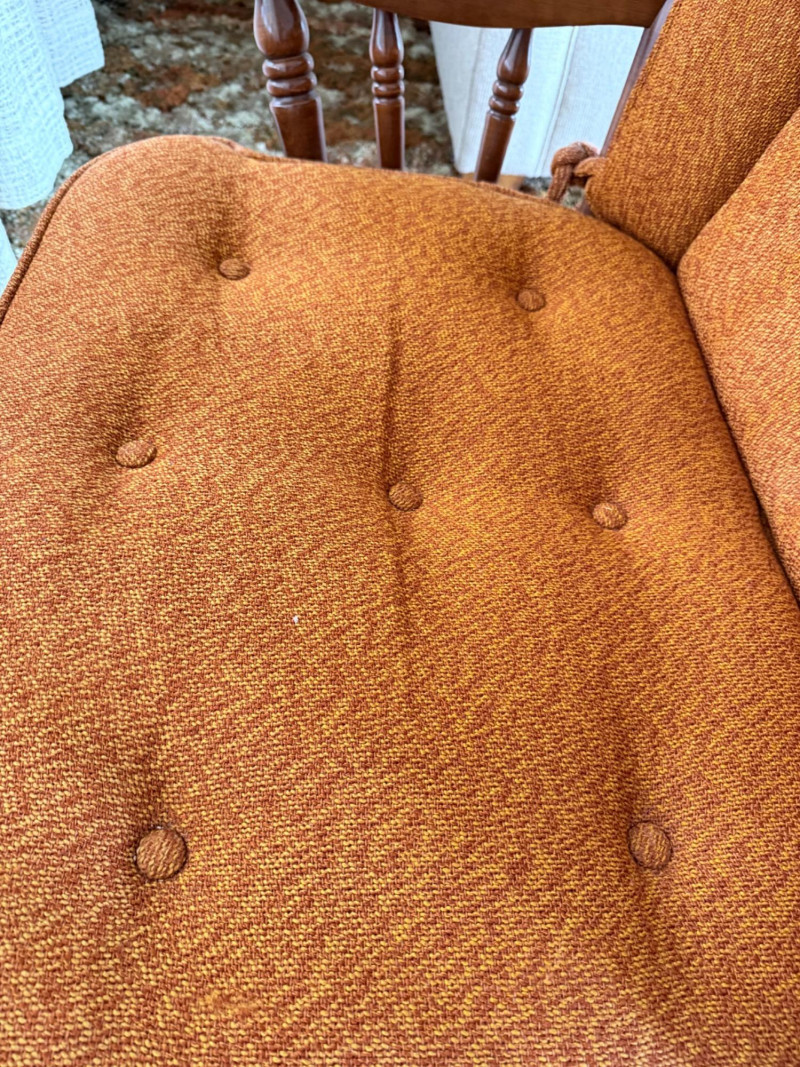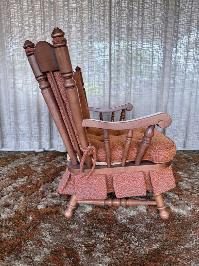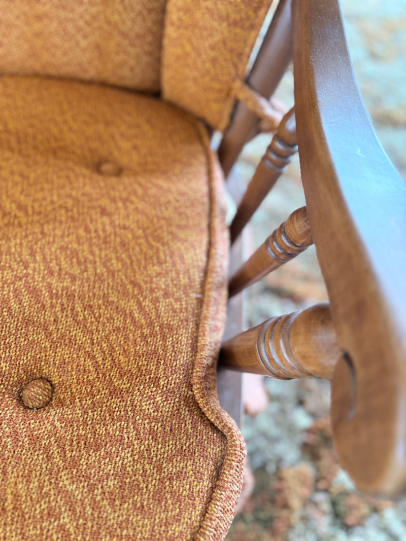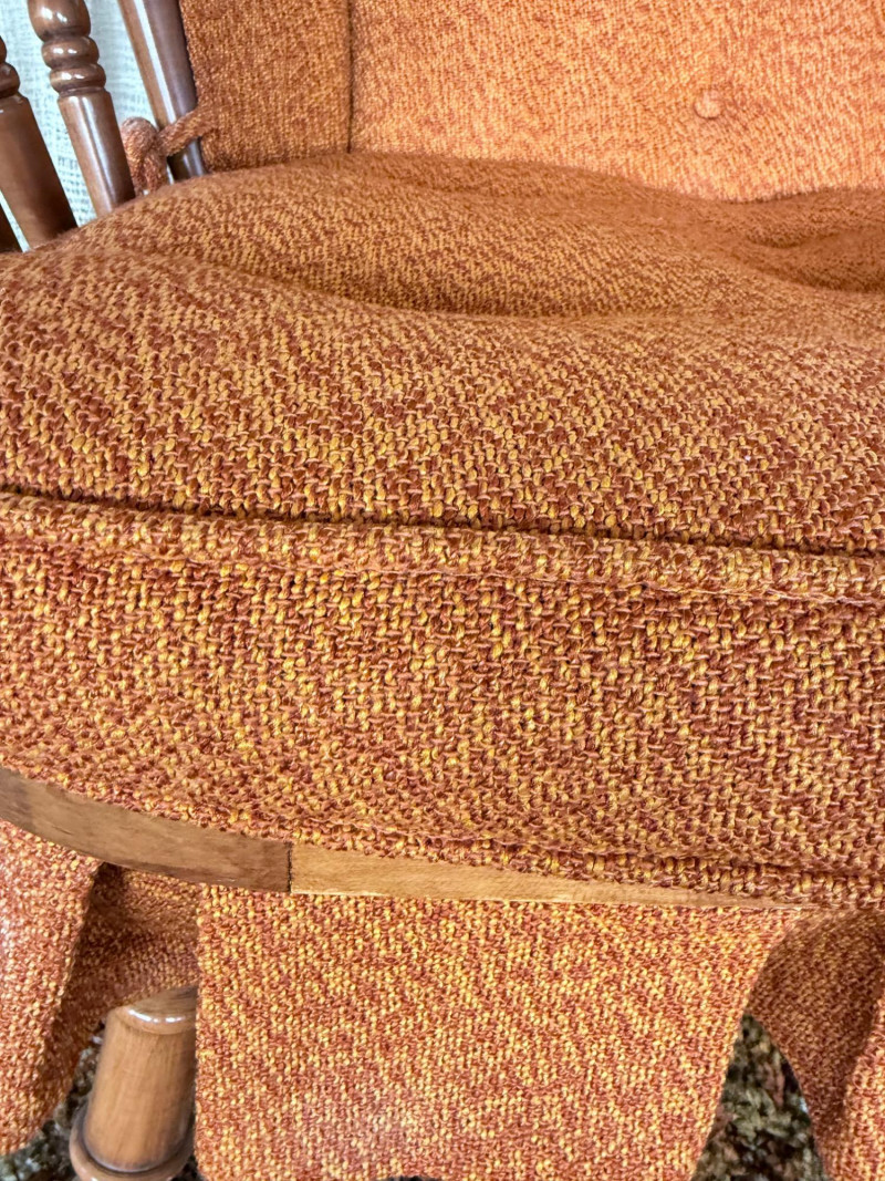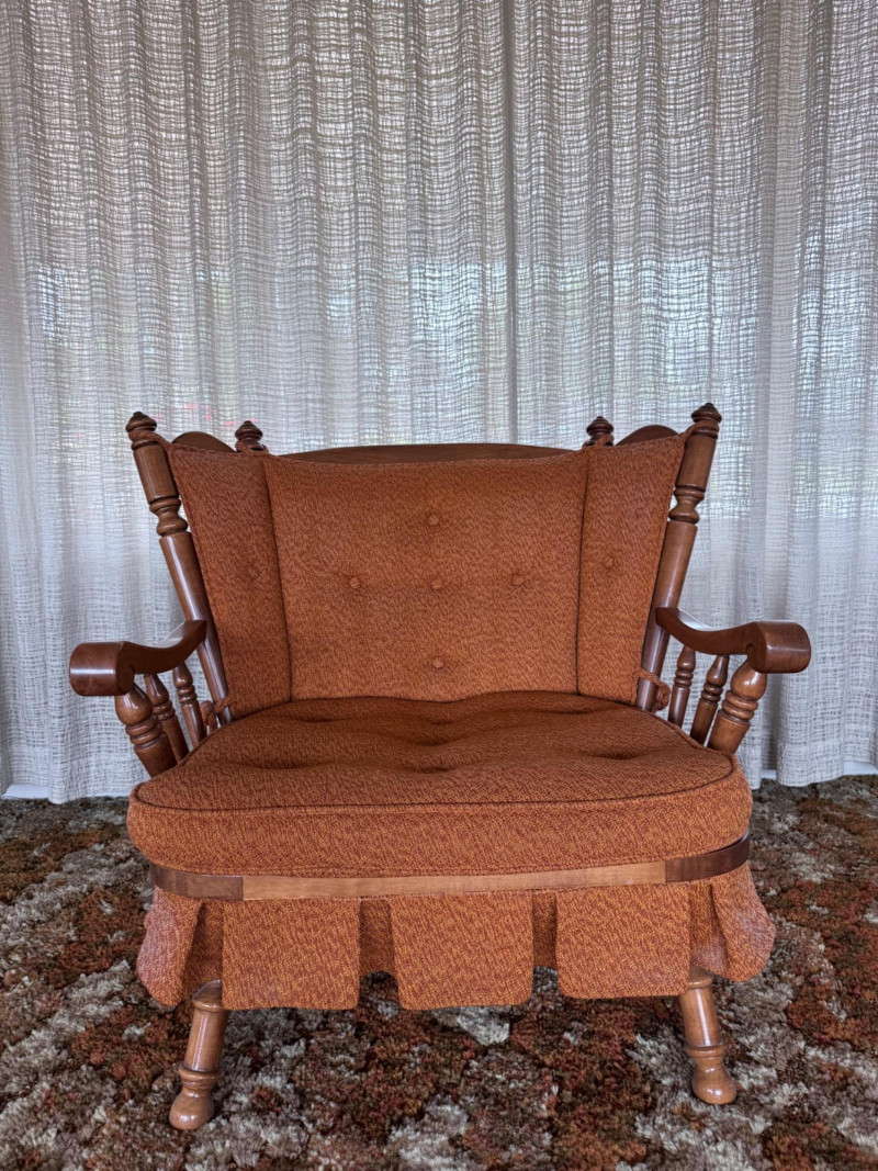 Vintage 1940s Upholstered Rocking Chair – Button-Tufted with Wood Spindles This charming 1940s-era rocking chair offers timeless comfort and classic American style, featuring a wide button-tufted seat and backrest in a retro burnt orange woven fabric. Crafted with solid wood arms and turned spindle supports, this piece is both functional and decorative. Details: Era: Circa 1940s Dimensions: Approx. 38" W x 23" D x 37" H Seat Height: 16" Features: Wide, cushioned seat with button tufting Wooden frame with turned spindles and curved armrests Decorative skirted fabric detail around base Smooth gliding/rocking motion Condition: vintage condition. Upholstery is intact with no major stains or tears. Wood shows minor surface wear consistent with age. A comfortable and stylish piece for a cozy reading nook, nursery, or vintage-inspired living space.