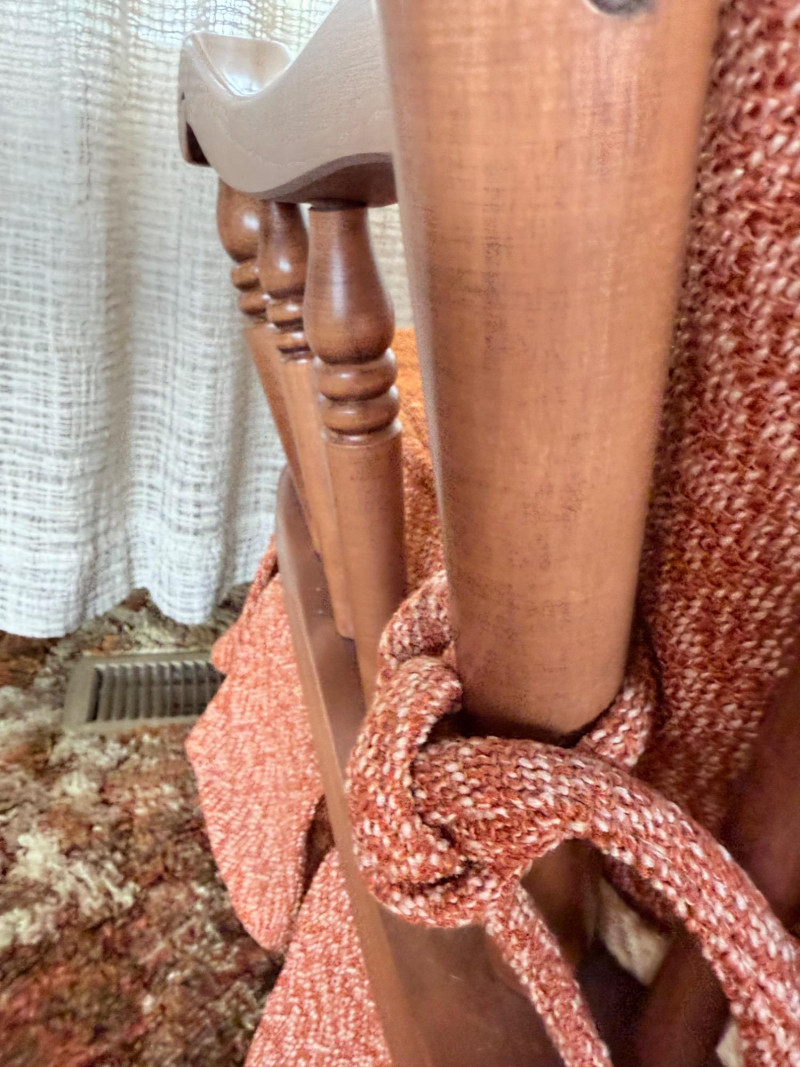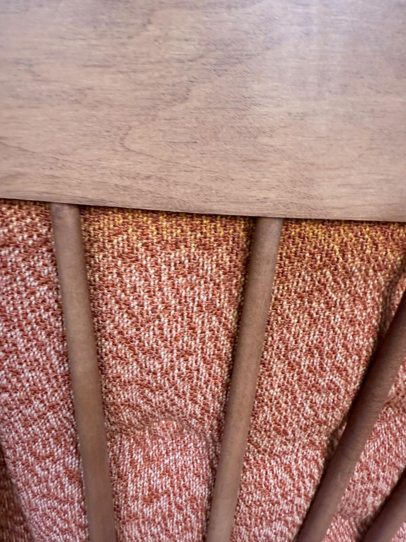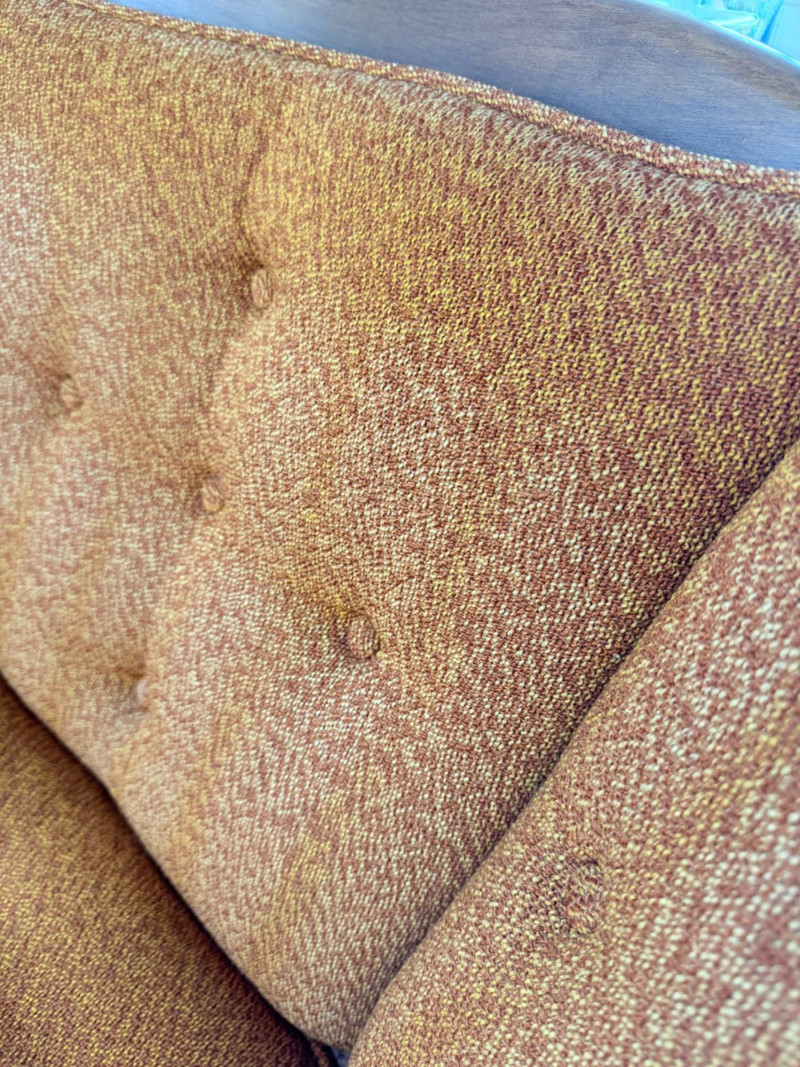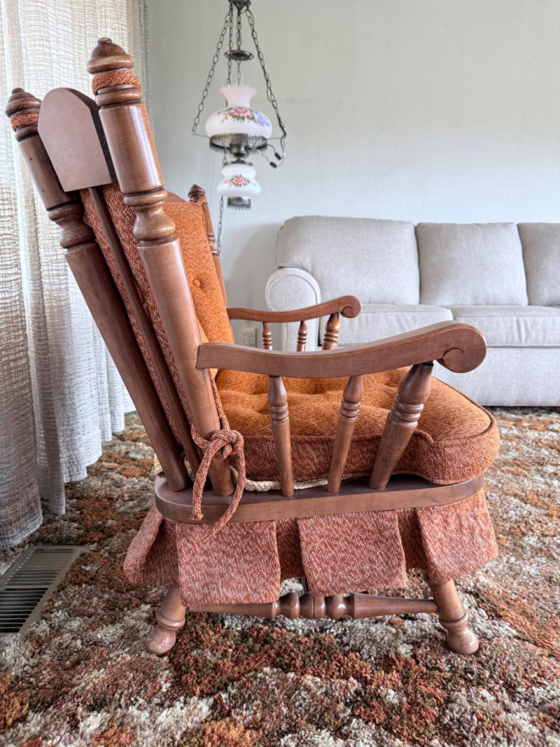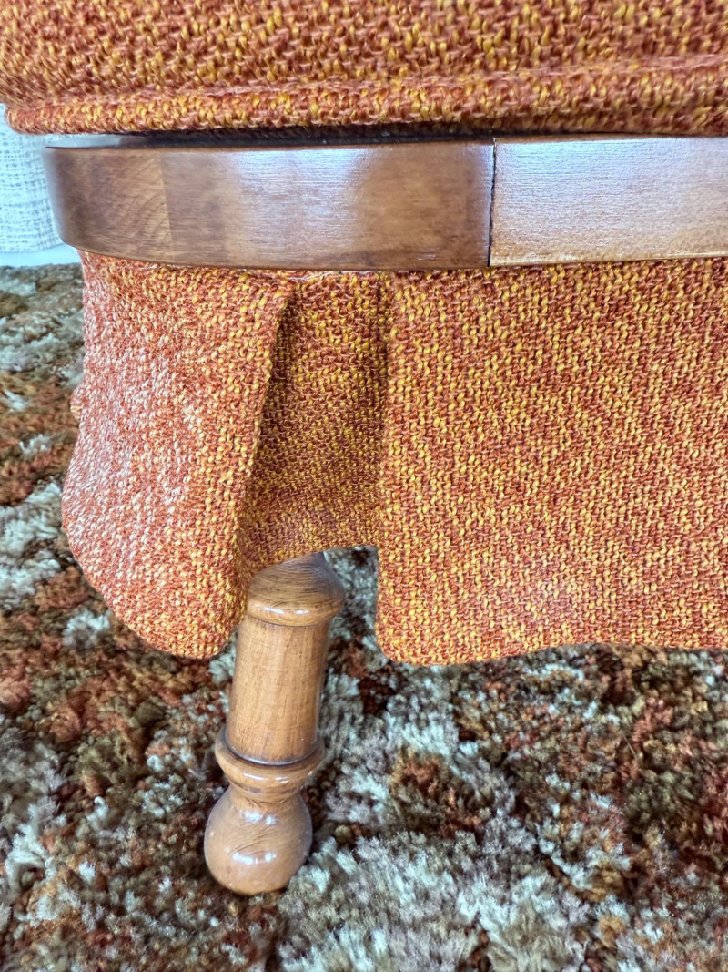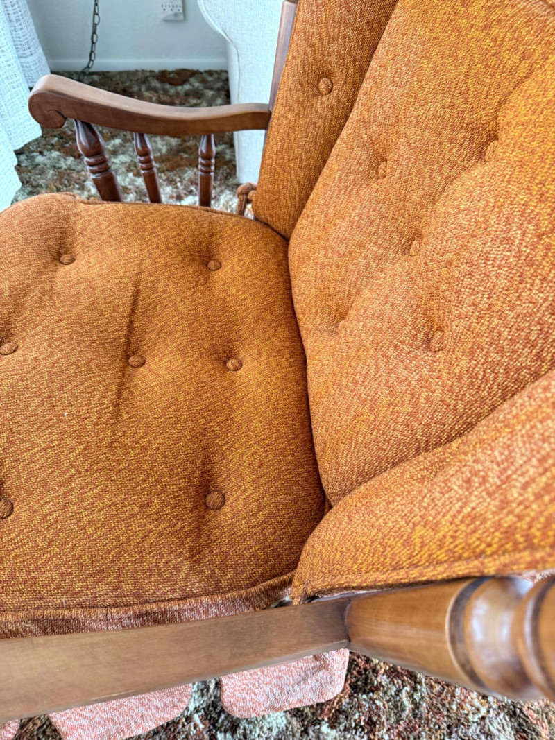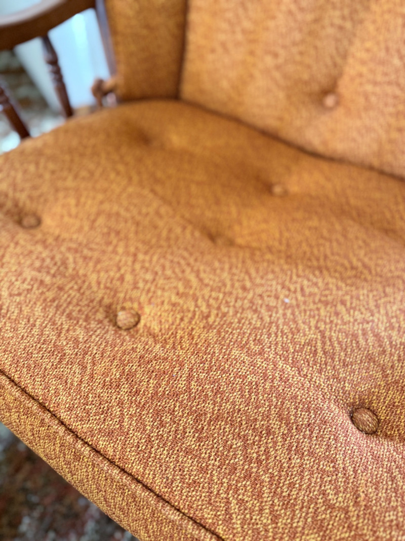 Vintage 1940s Upholstered Rocking Chair – Button-Tufted with Wood Spindles This charming 1940s-era rocking chair offers timeless comfort and classic American style, featuring a wide button-tufted seat and backrest in a retro burnt orange woven fabric. Crafted with solid wood arms and turned spindle supports, this piece is both functional and decorative. Details: Era: Circa 1940s Dimensions: Approx. 38" W x 23" D x 37" H Seat Height: 16" Features: Wide, cushioned seat with button tufting Wooden frame with turned spindles and curved armrests Decorative skirted fabric detail around base Smooth gliding/rocking motion Condition: vintage condition. Upholstery is intact with no major stains or tears. Wood shows minor surface wear consistent with age. A comfortable and stylish piece for a cozy reading nook, nursery, or vintage-inspired living space.
