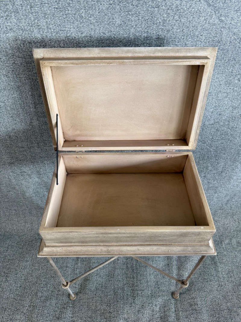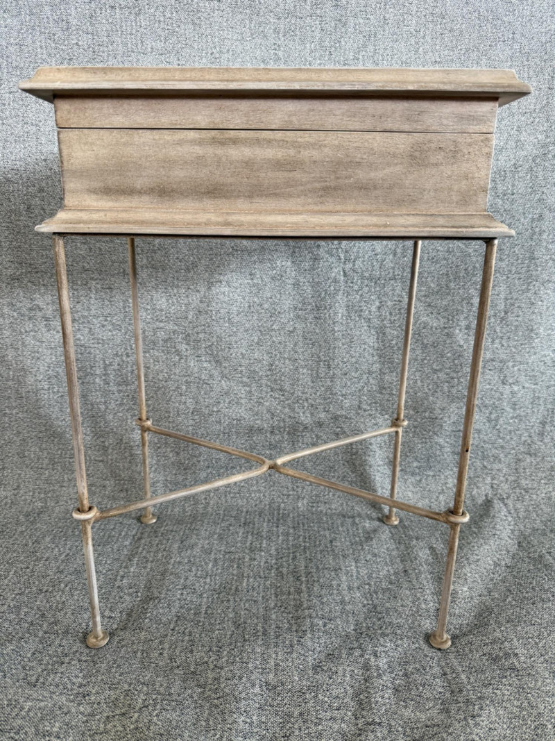 Wooden side table with a hinged lid and interior storage compartment. The top features a mosaic inlay of a classical profile in neutral tones. Finished in a weathered wood look and supported by a slender metal base with crossbars for added stability. Measures approximately 12" W x 18" D x 24.5" H.