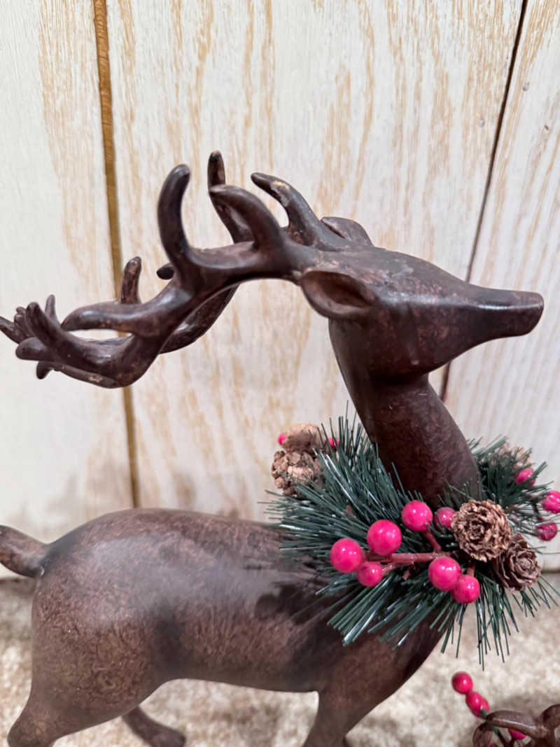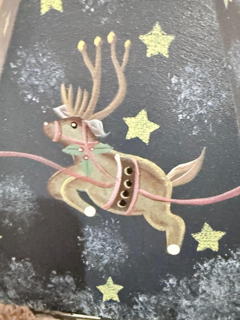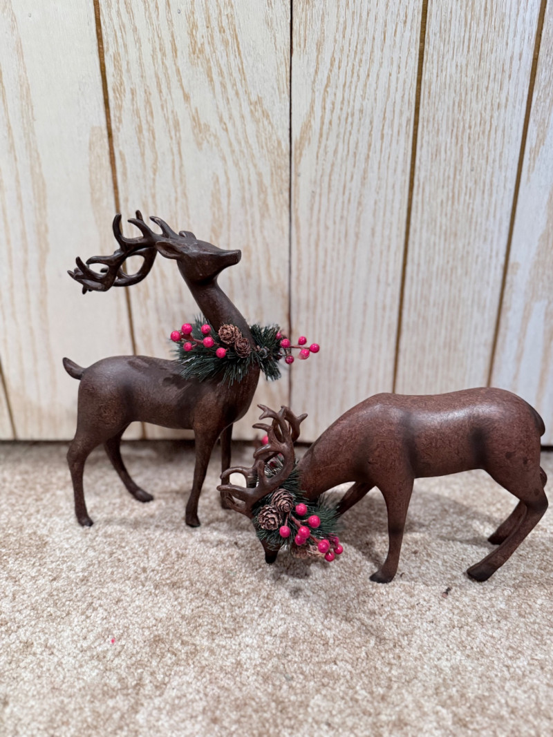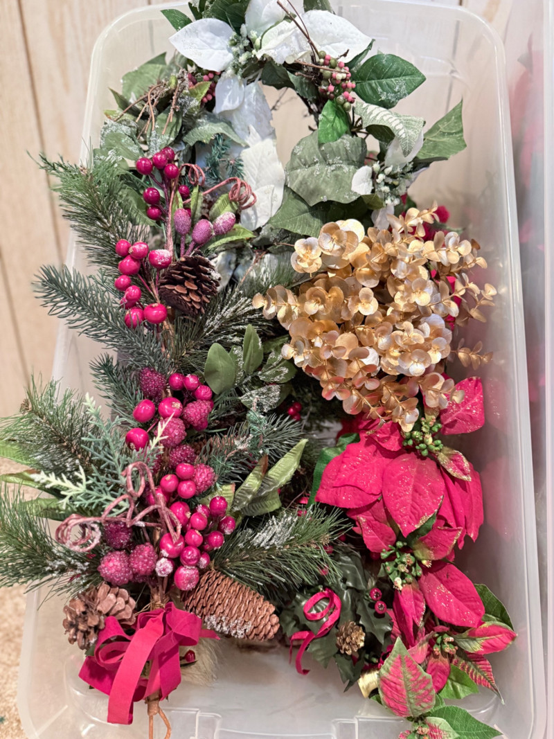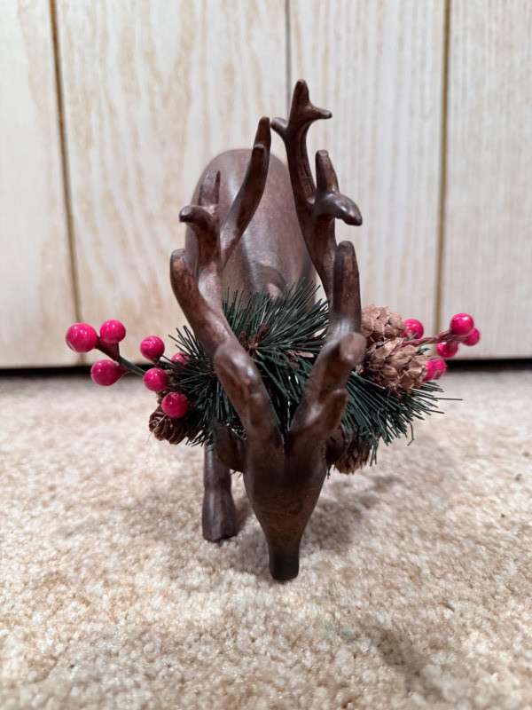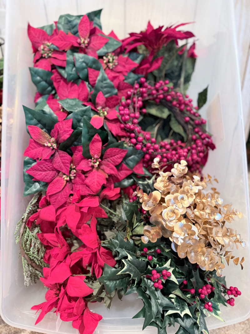 Large Lot of Christmas Holiday Décor – Includes Tubs of Misc Decor Get into the festive spirit with this colorful collection of Christmas décor, ideal for holiday decorating indoors or out. This lot includes a wide variety of artificial florals, figurines, and accent pieces, thoughtfully packed into two full storage tubs. Included items: Two plastic tubs filled with faux floral arrangements, pine accents, holly, berries, and poinsettia decorations (1) Large 20" holiday wreath with velvet poinsettias, gold accents, and a red ribbon (1) Wooden decorative house painted with reindeer and Santa motif (2) Gold-tone angel figurines (2) Plastic reindeer with festive wreath collars (approx. 14" tall) (3) Candle holders with glass inserts and twisted metal stands, includes 3 ivory ball candles Condition: Good used condition with minor wear; decorations appear well cared for. Tubs included for easy transport and storage. A charming collection for decking the halls or enhancing your holiday display!