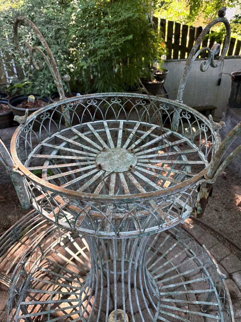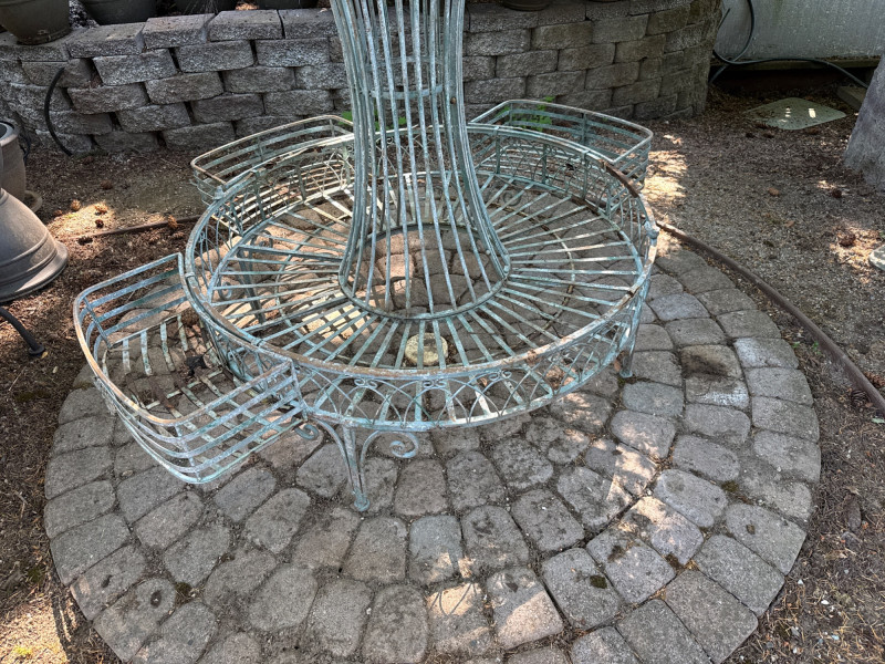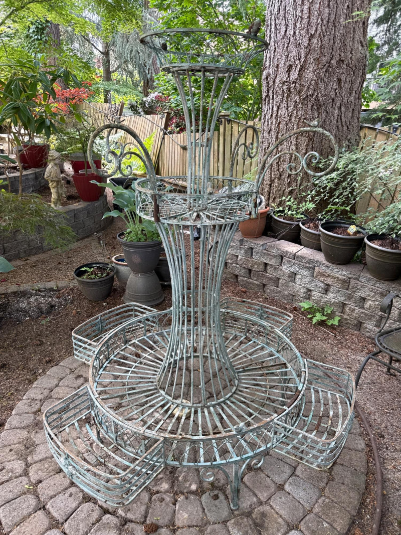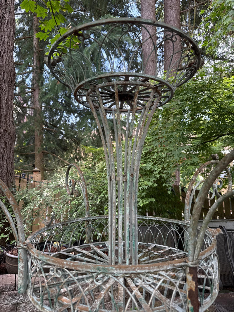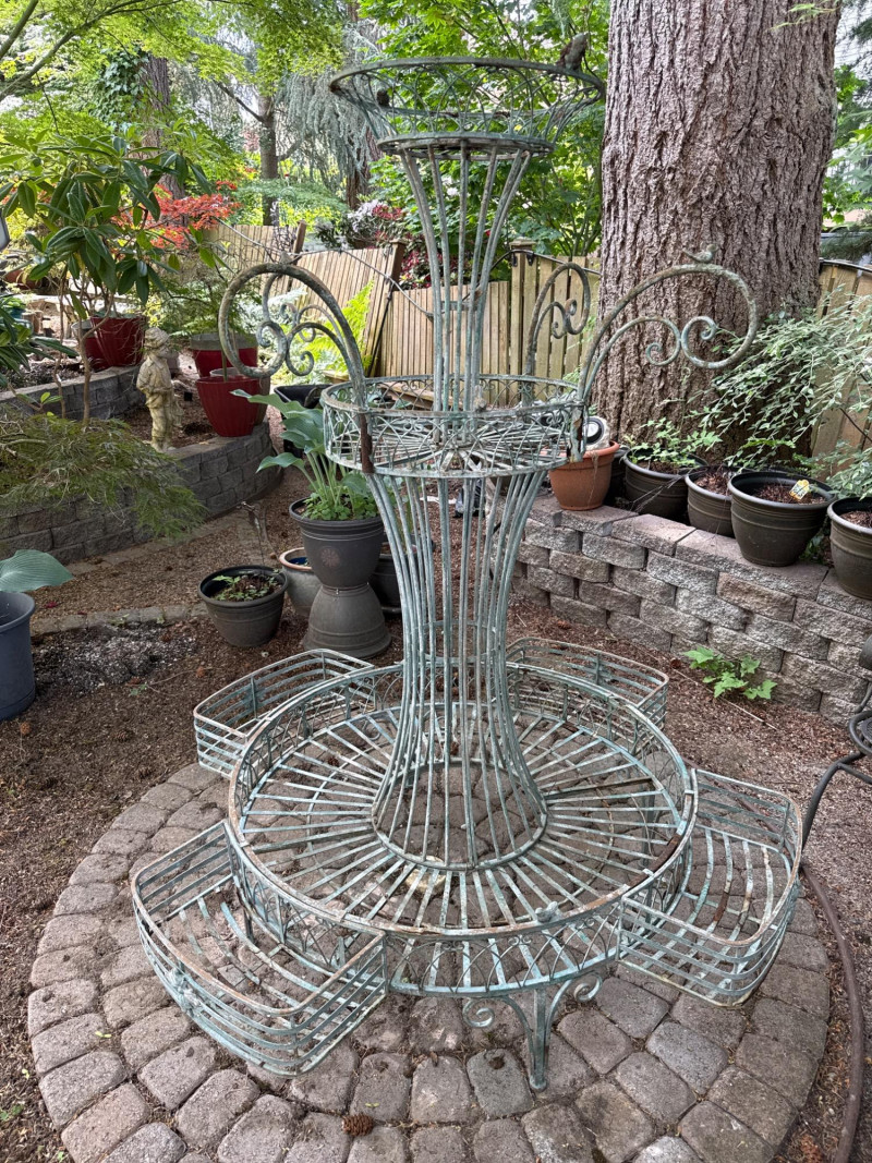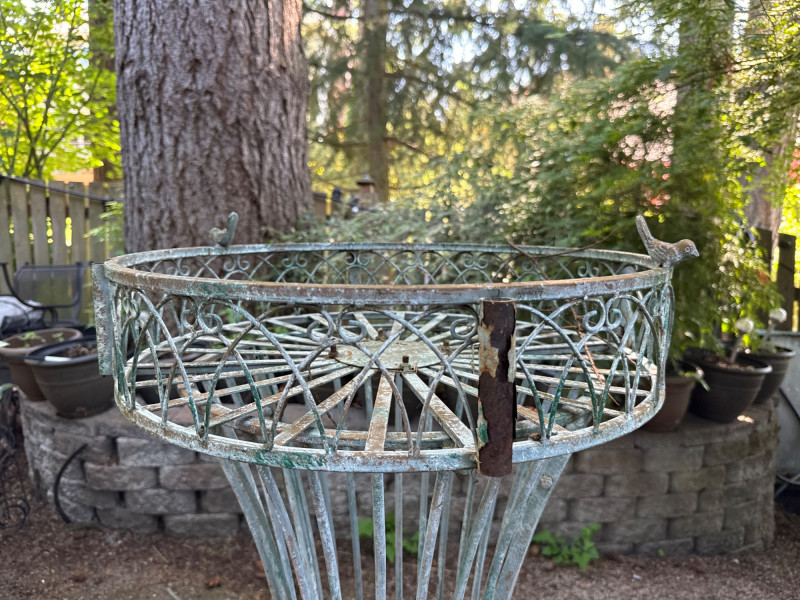 Note: Plants not included. Bring tools and solvent for disassembly. Vintage metal planter and garden display. Several movable pieces. Has some rust and peeling paint Small flower, bird detail throughout