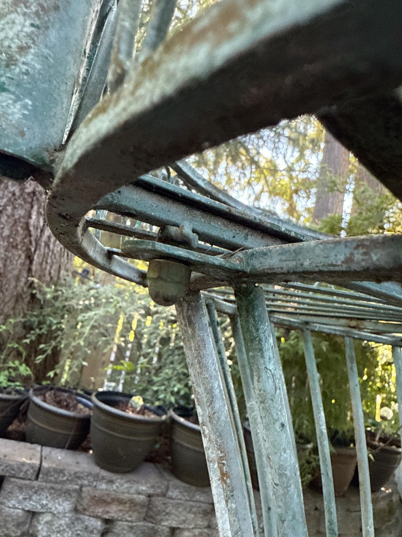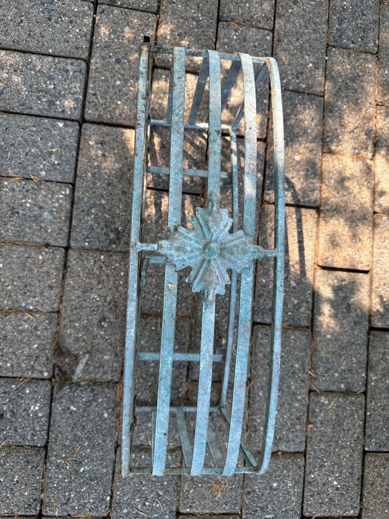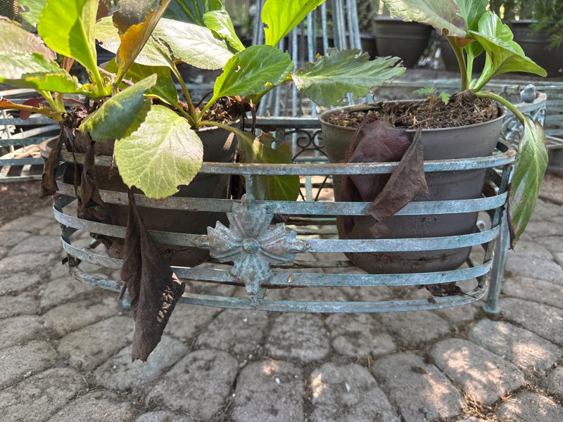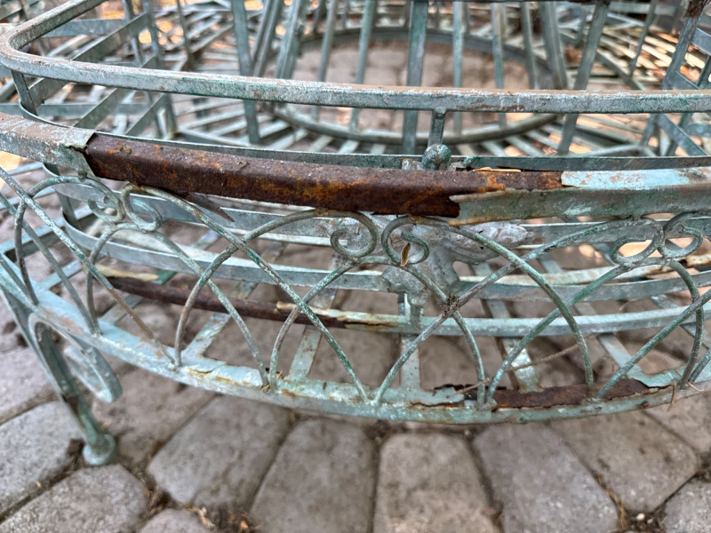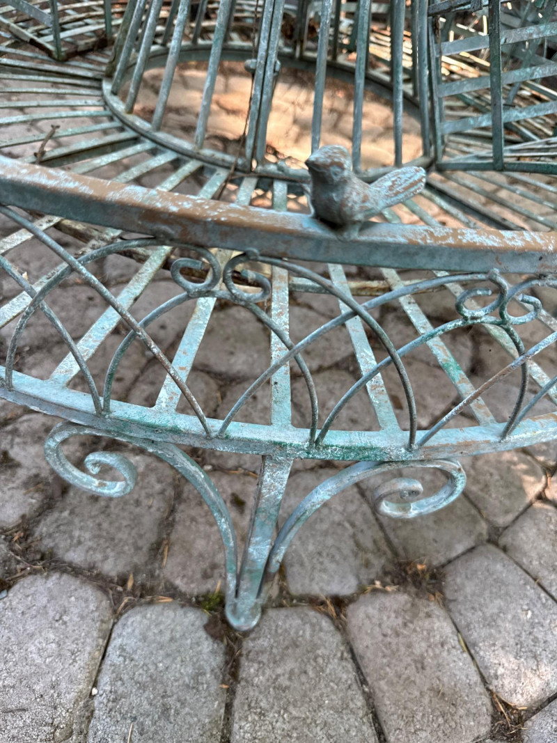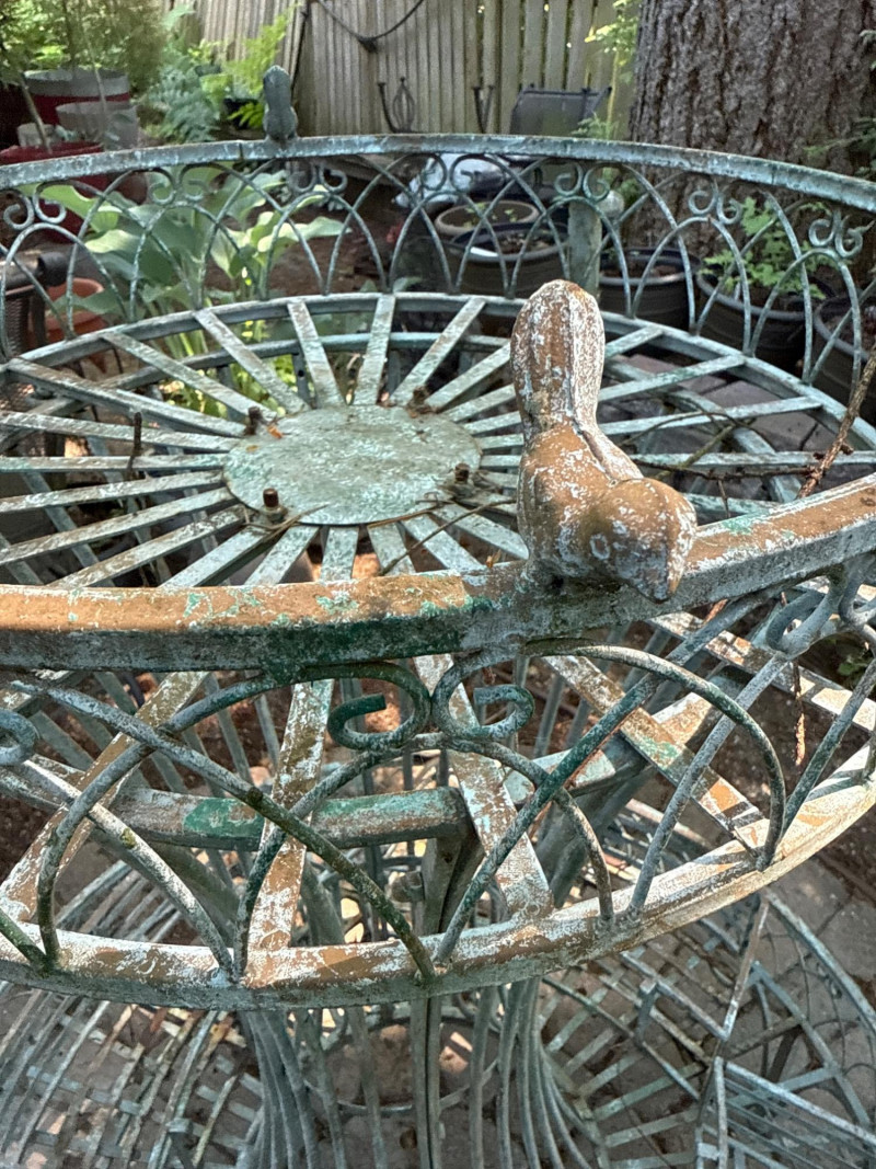 Note: Plants not included. Bring tools and solvent for disassembly. Vintage metal planter and garden display. Several movable pieces. Has some rust and peeling paint Small flower, bird detail throughout