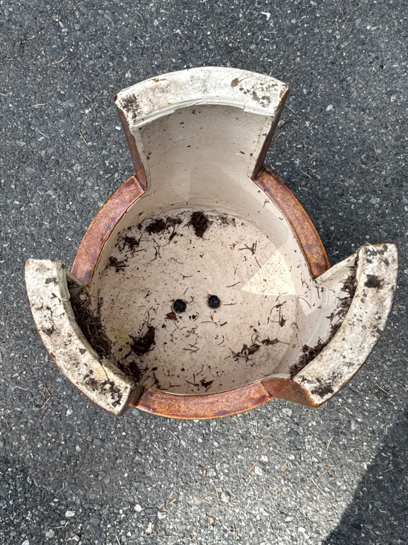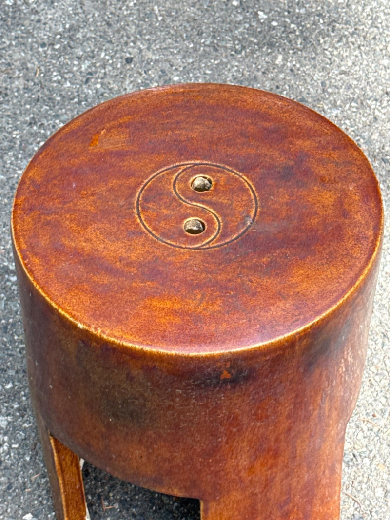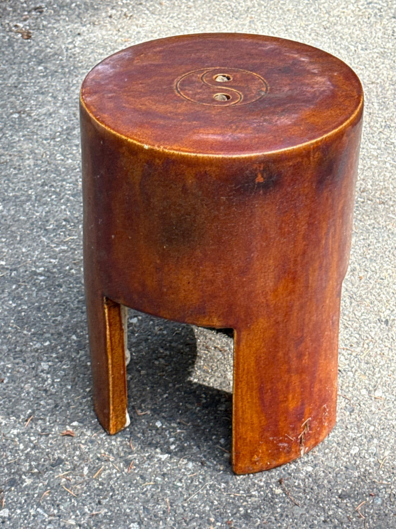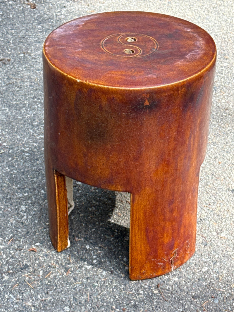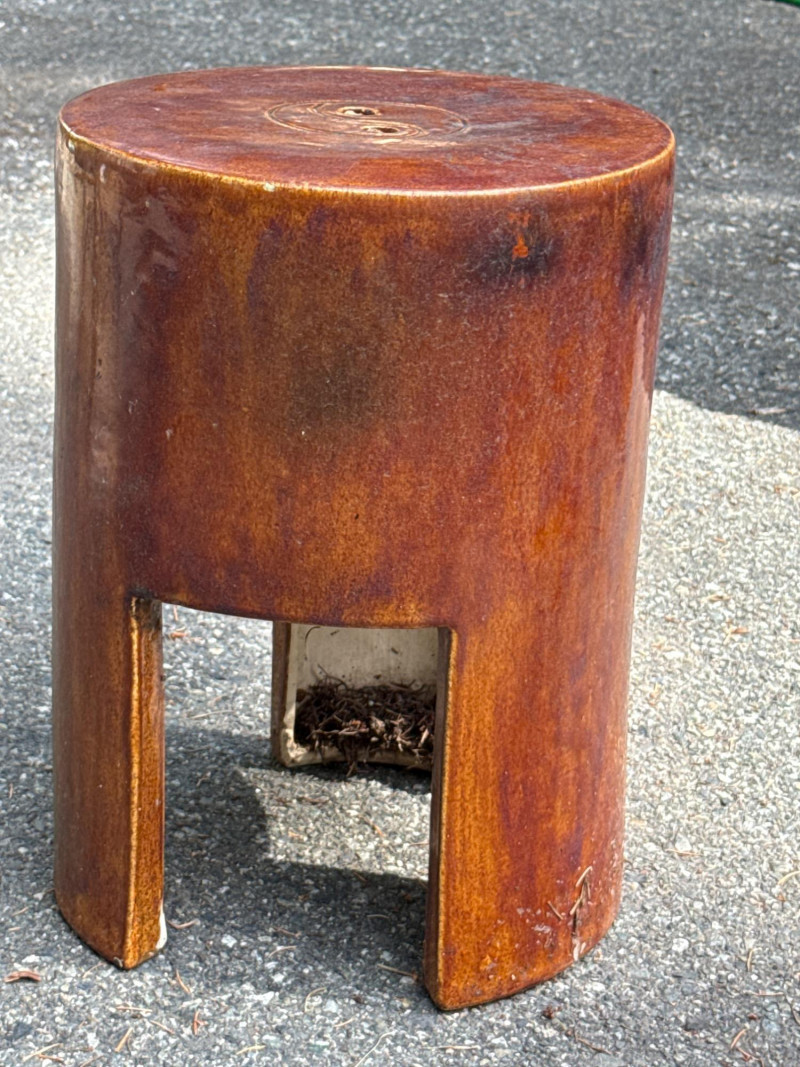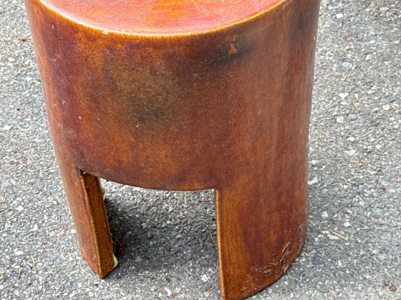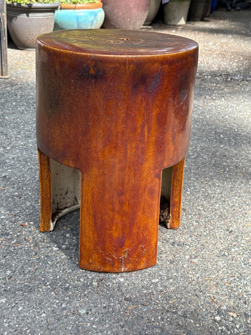 Heavy ceramic stool/plant stand Three legs and two holes Can be inverted for another unique design Brown glaze with great color
