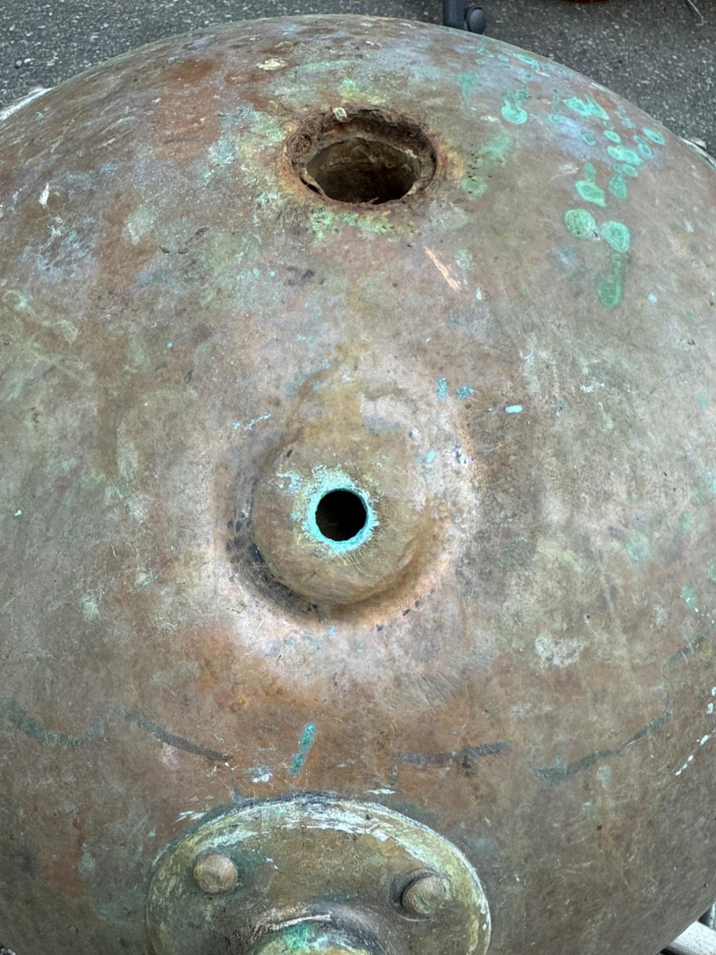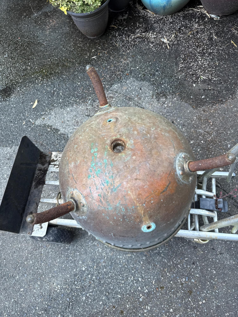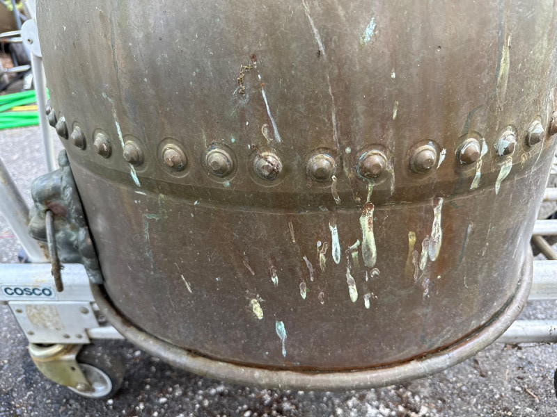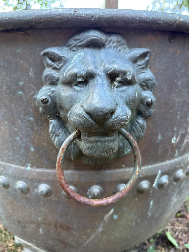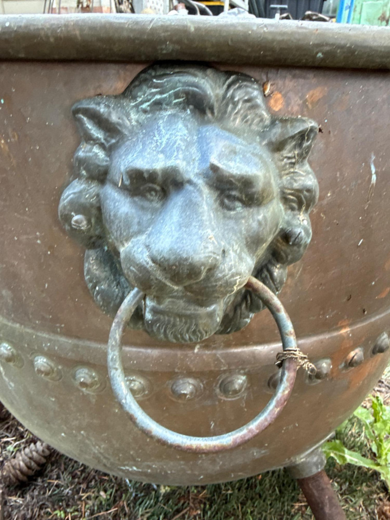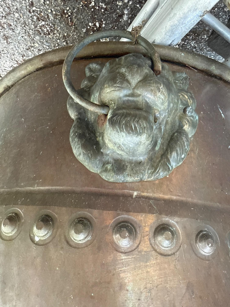 Very Large Copper pot with brass detail. Lion head handles. Could use cleaning, but in very solid condition Several holes from manufacturer. Purpose unknown EXTREMELY HEAVY. Bring help to load. This is a two-person lift