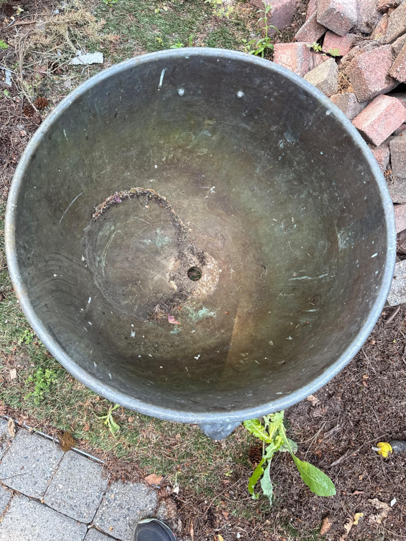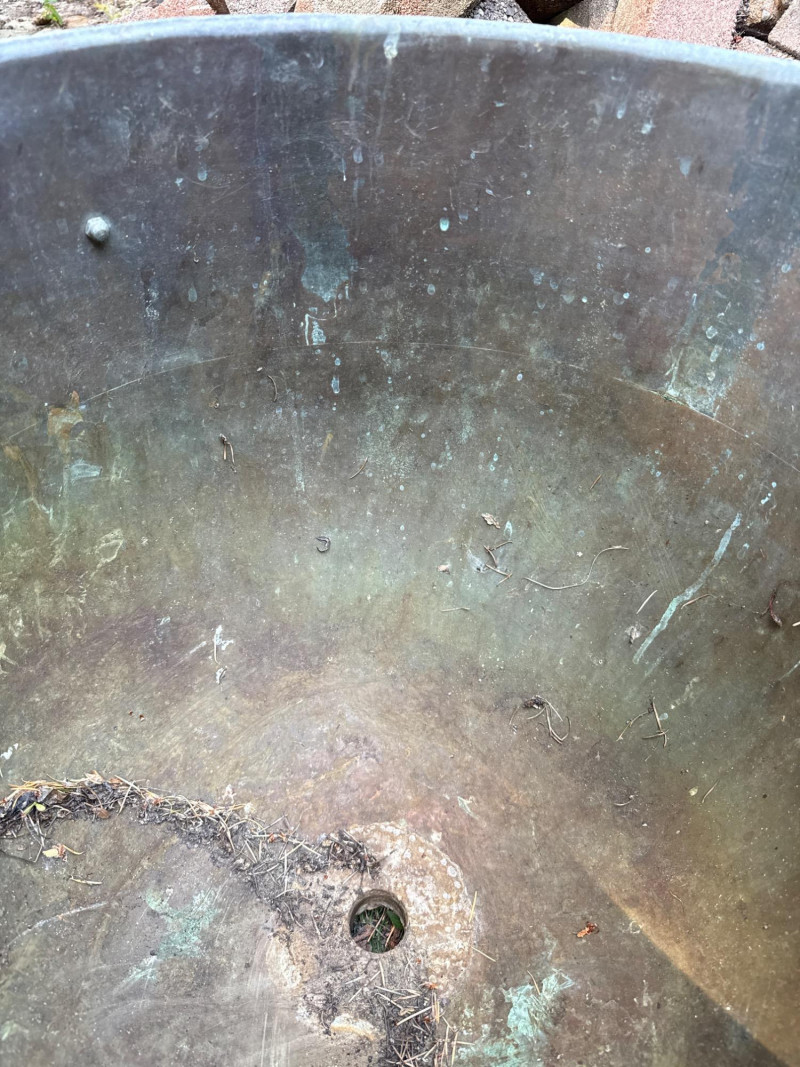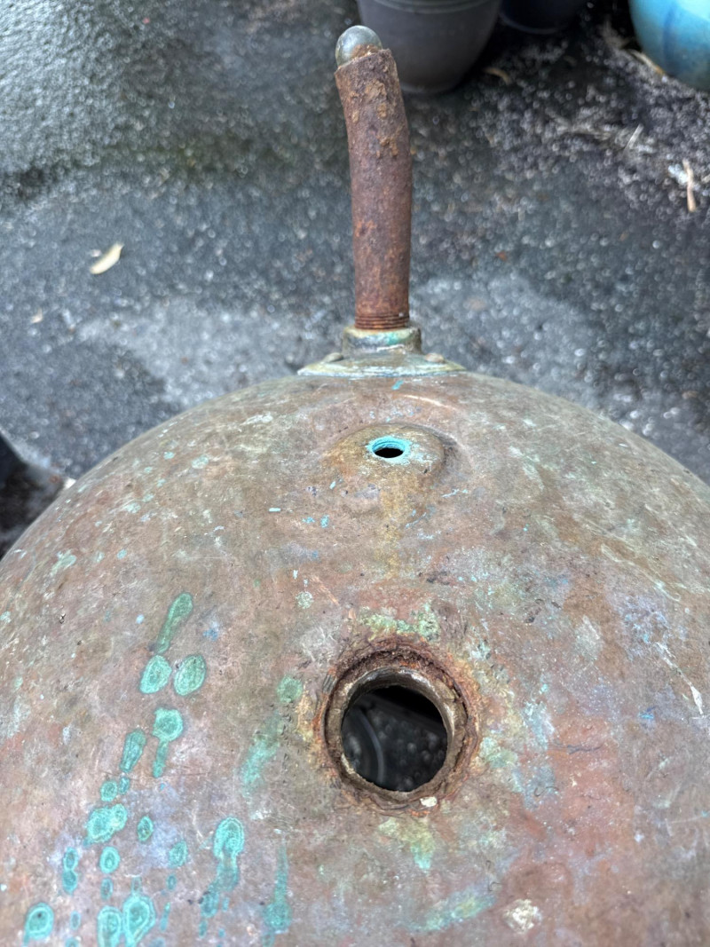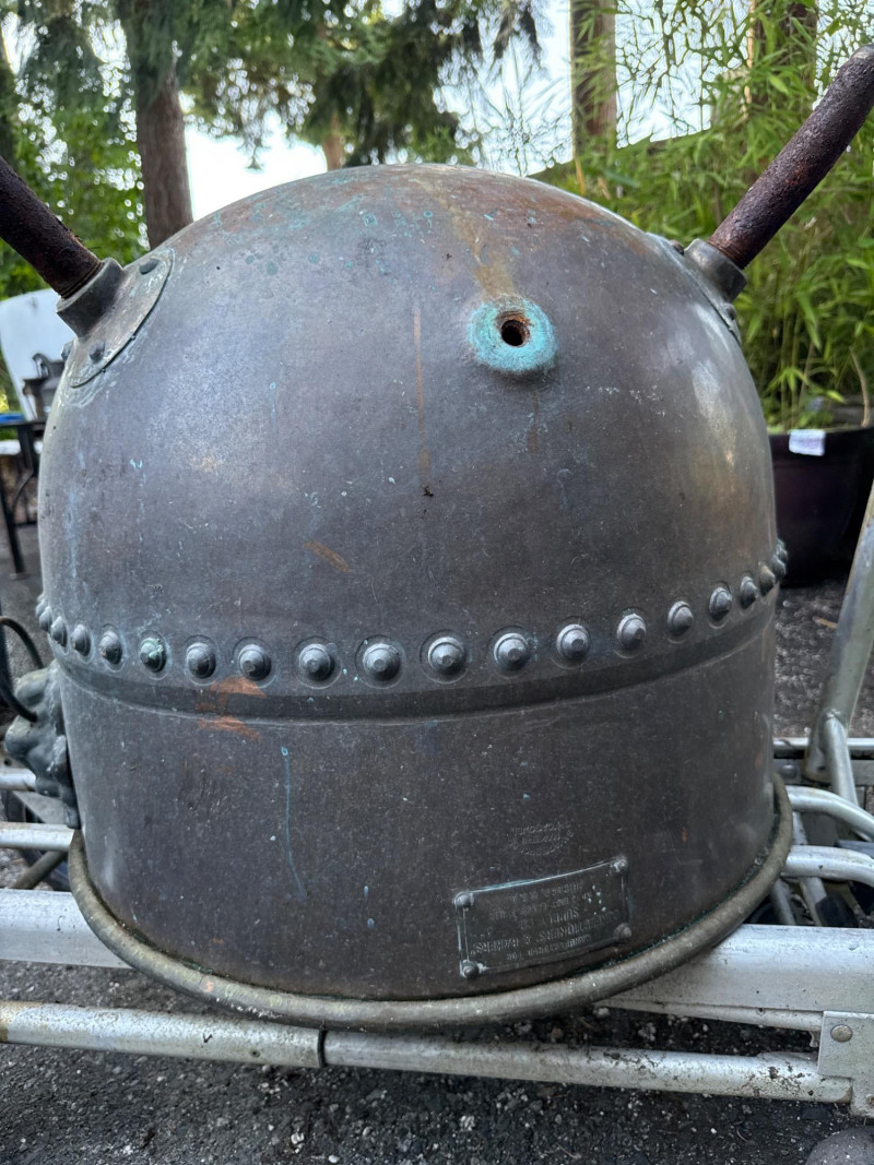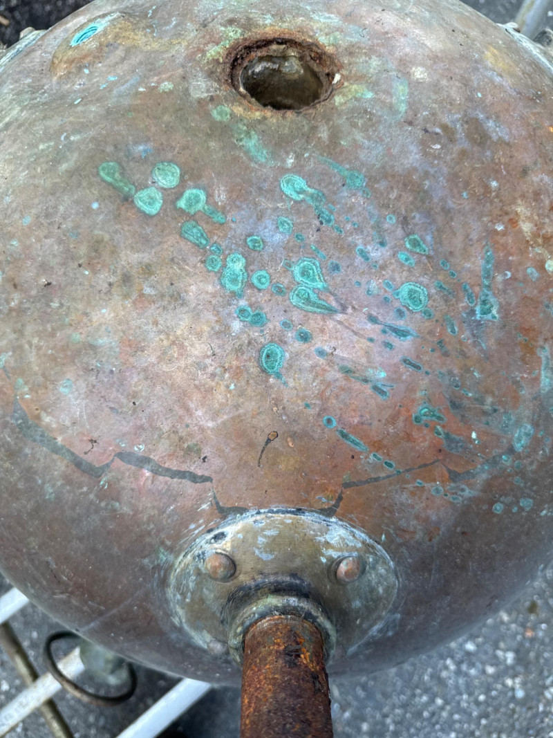 Very Large Copper pot with brass detail. Lion head handles. Could use cleaning, but in very solid condition Several holes from manufacturer. Purpose unknown EXTREMELY HEAVY. Bring help to load. This is a two-person lift