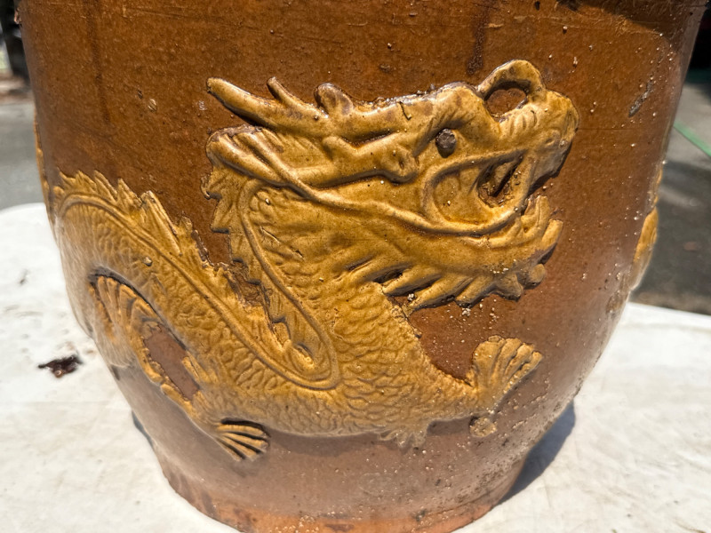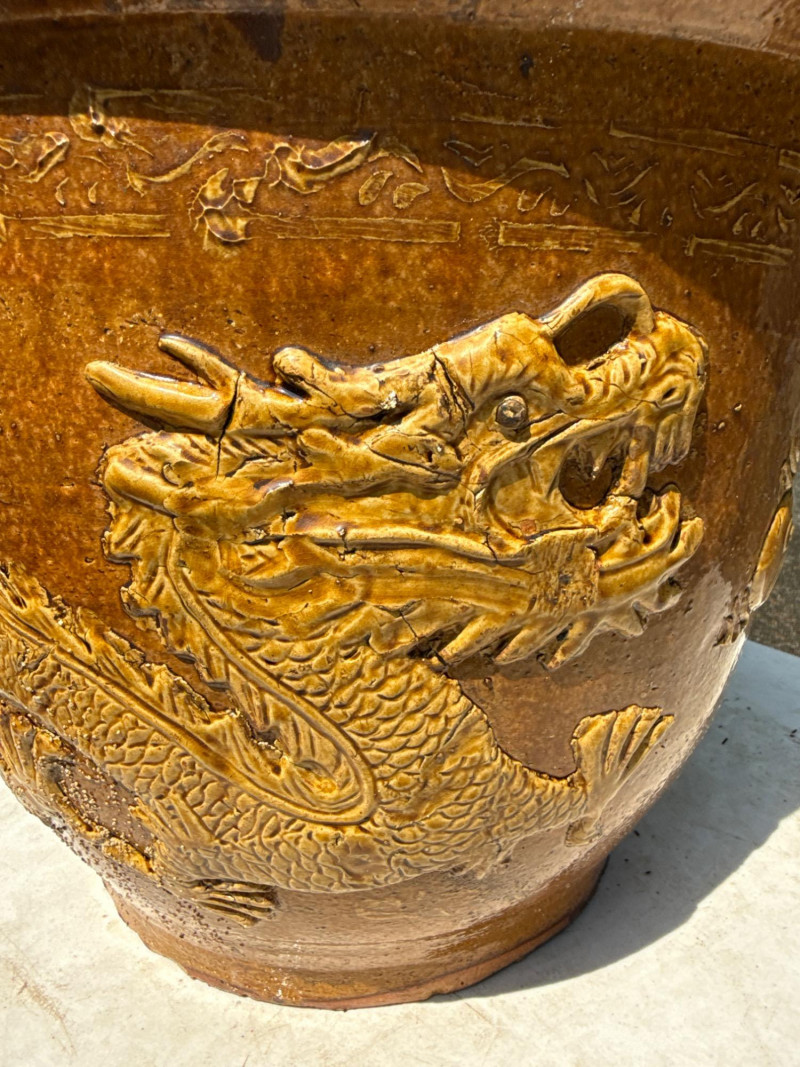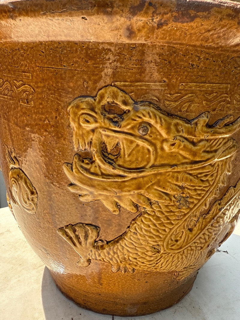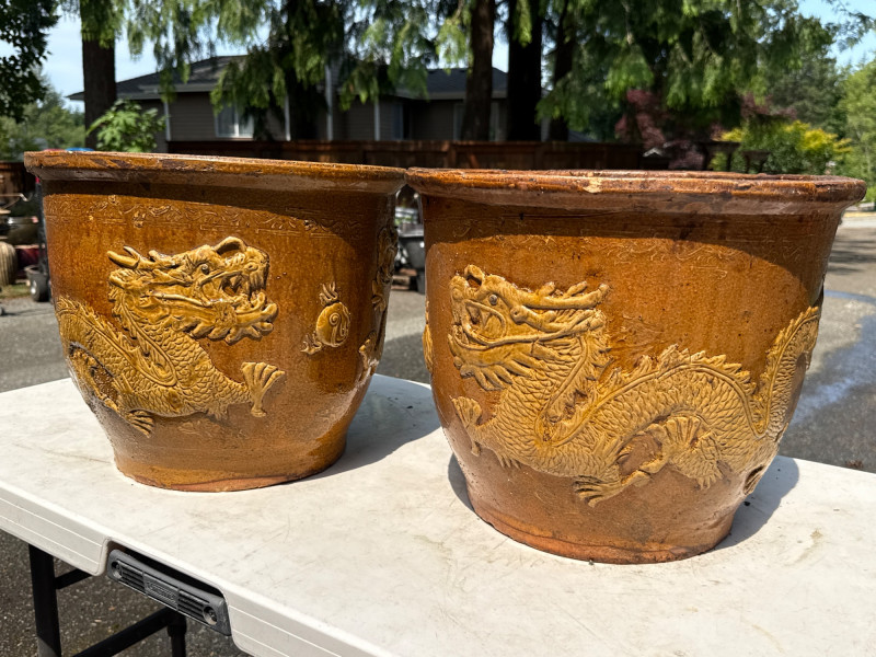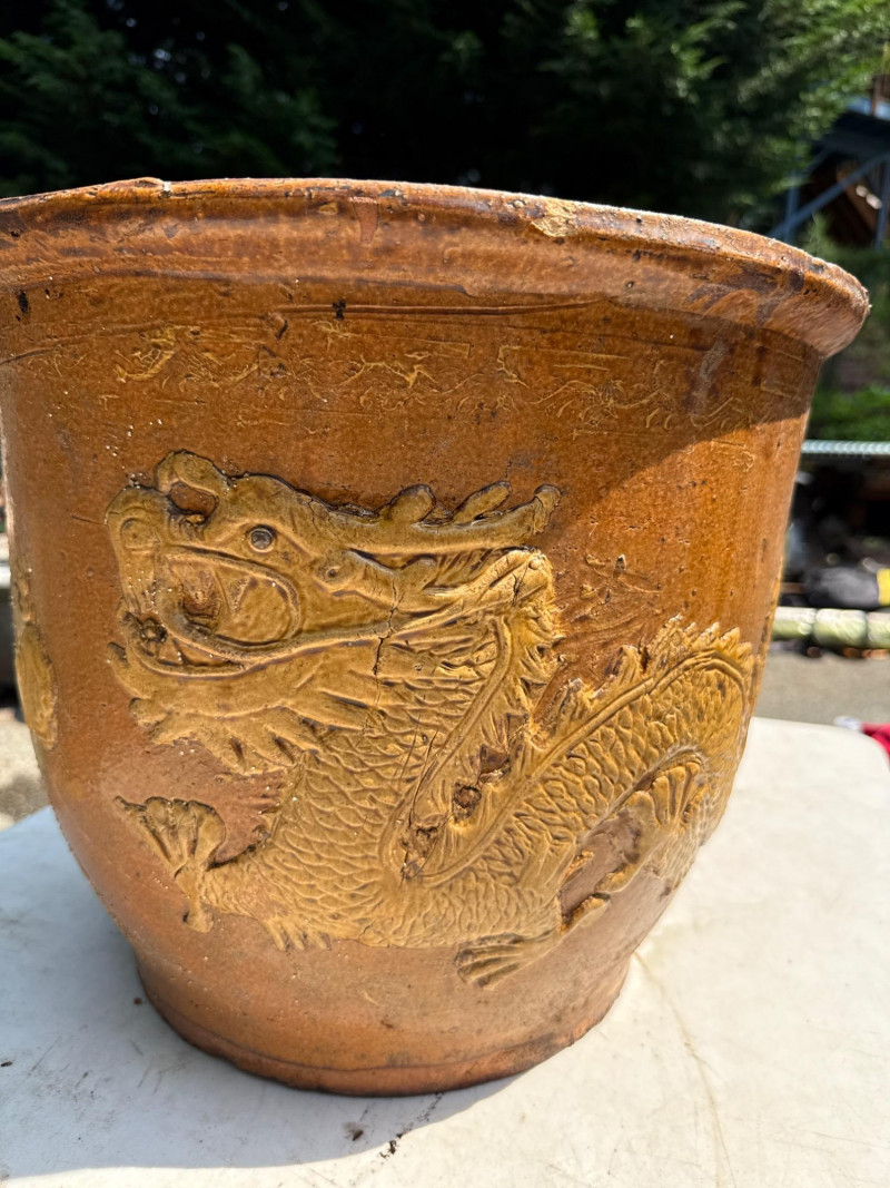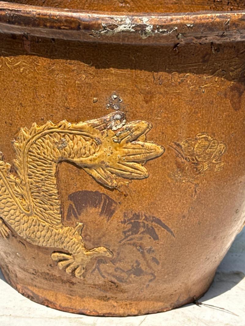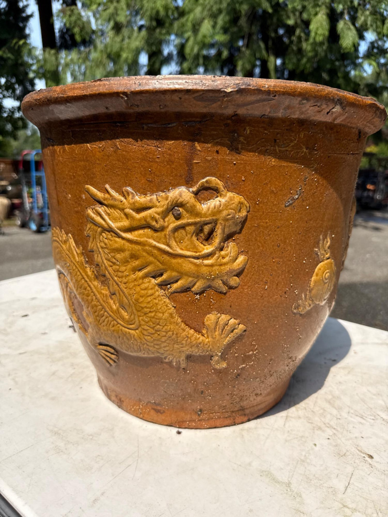 Two vintage plant pots with gold and brown color. Raised relief dragon carving. One of the dragons has some wear. Could use a cleaning