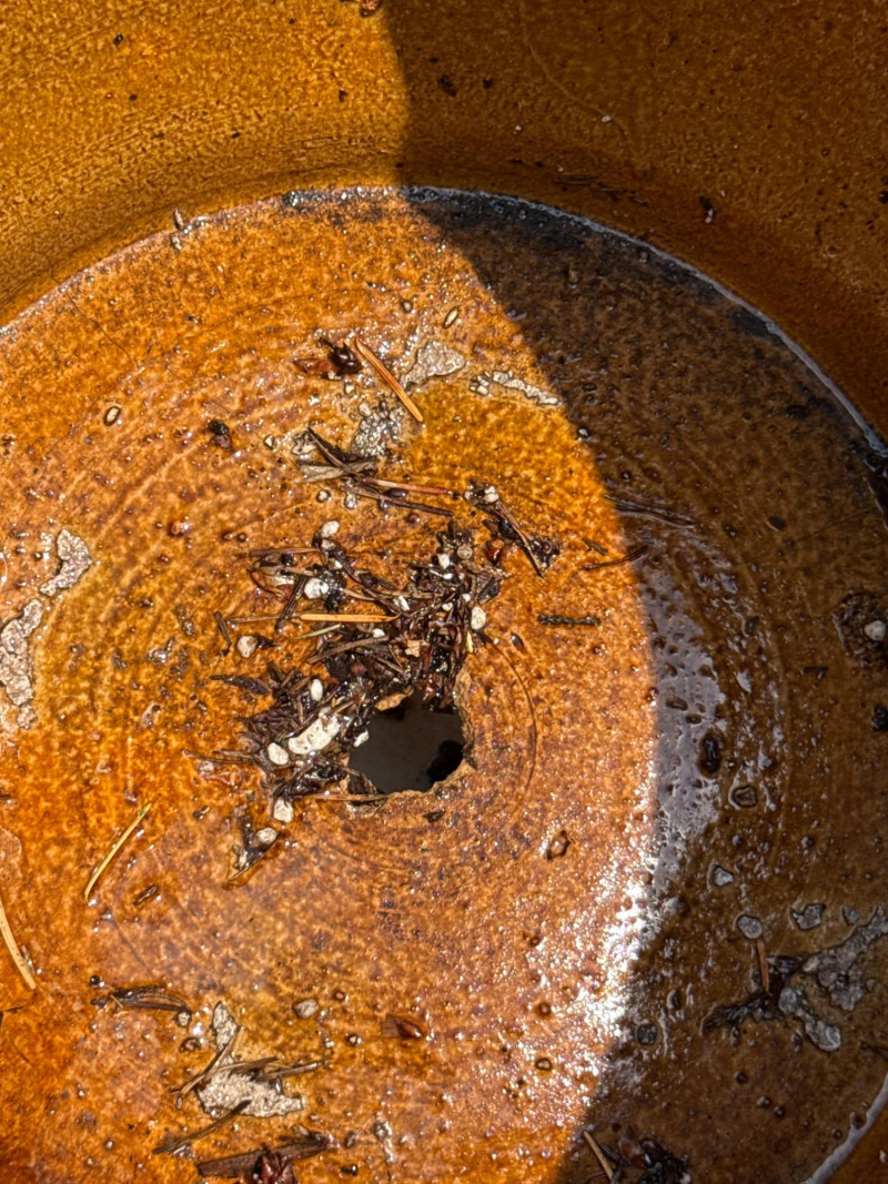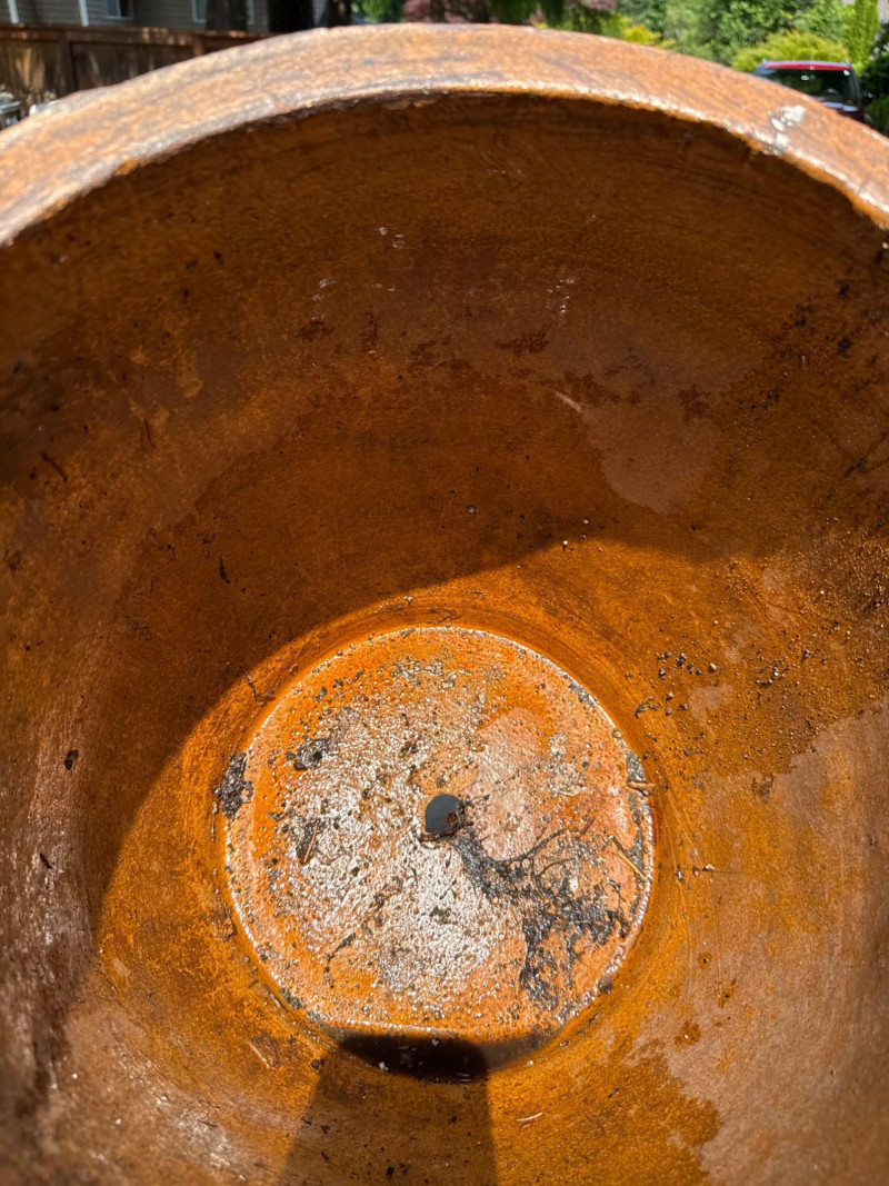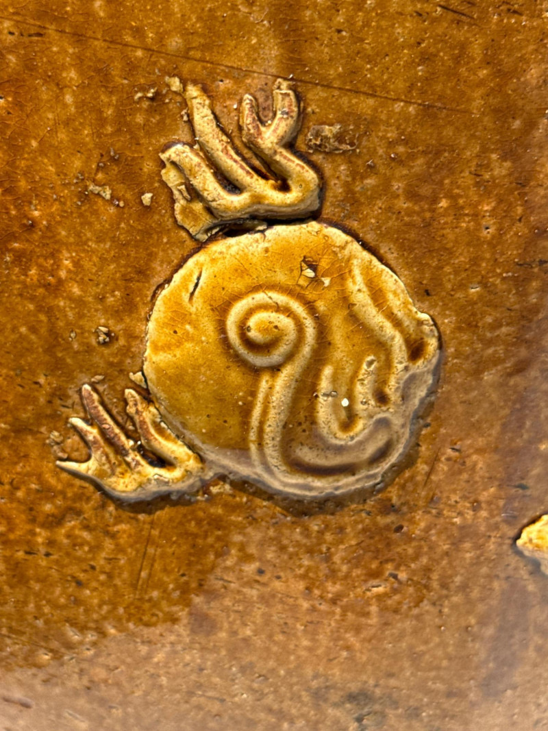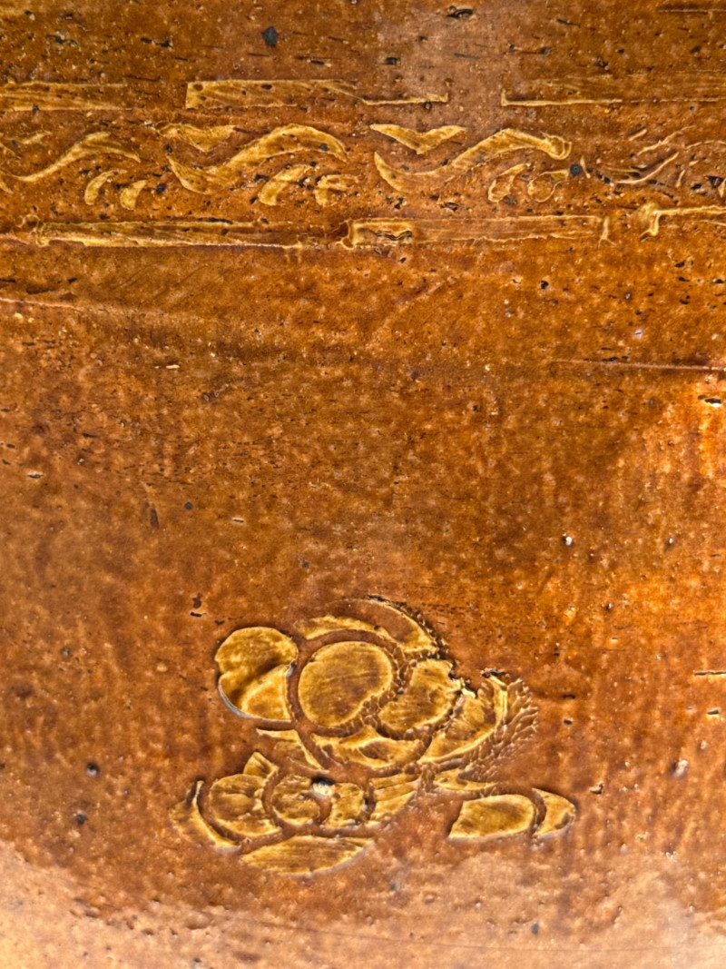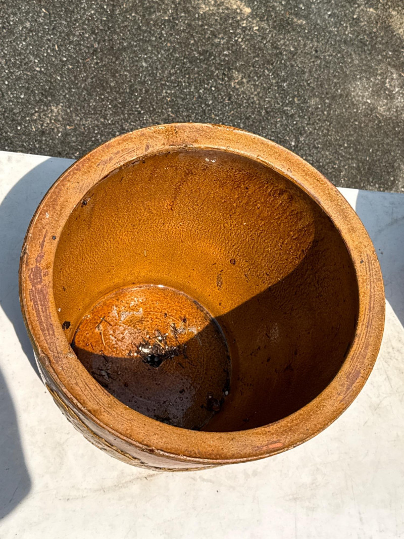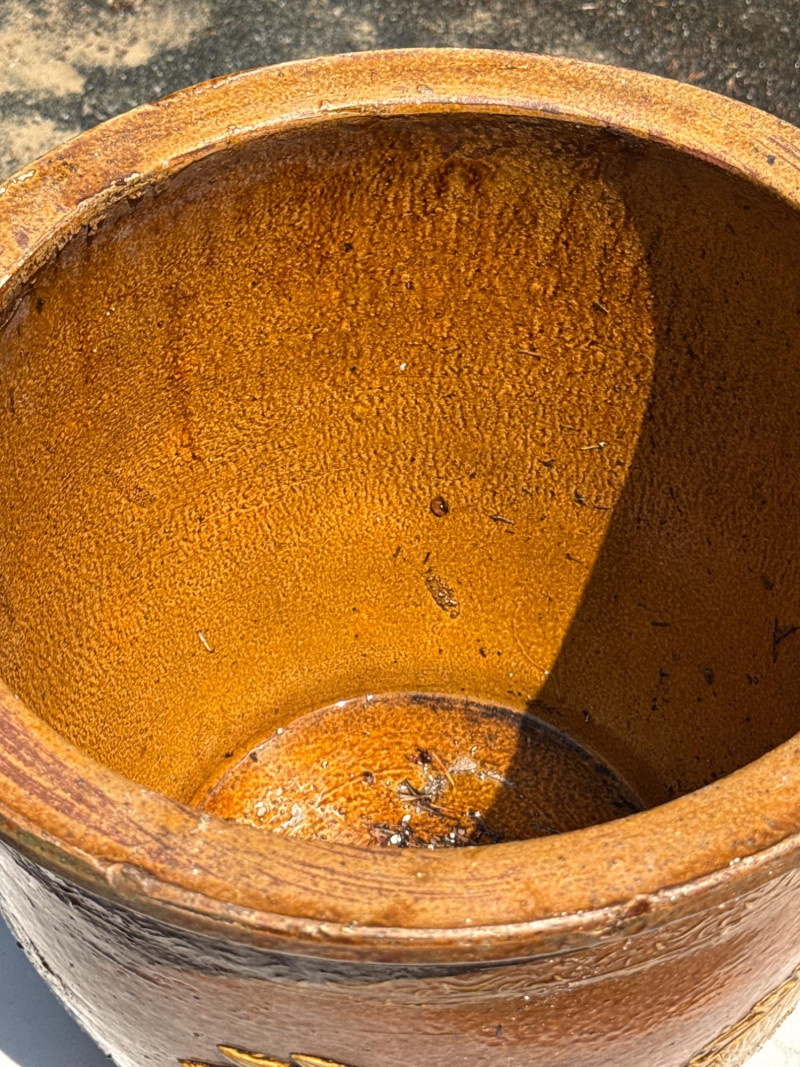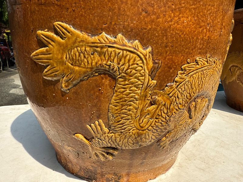 Two vintage plant pots with gold and brown color. Raised relief dragon carving. One of the dragons has some wear. Could use a cleaning