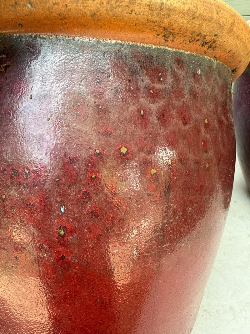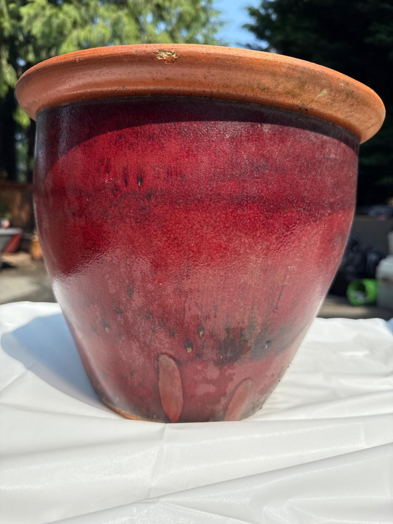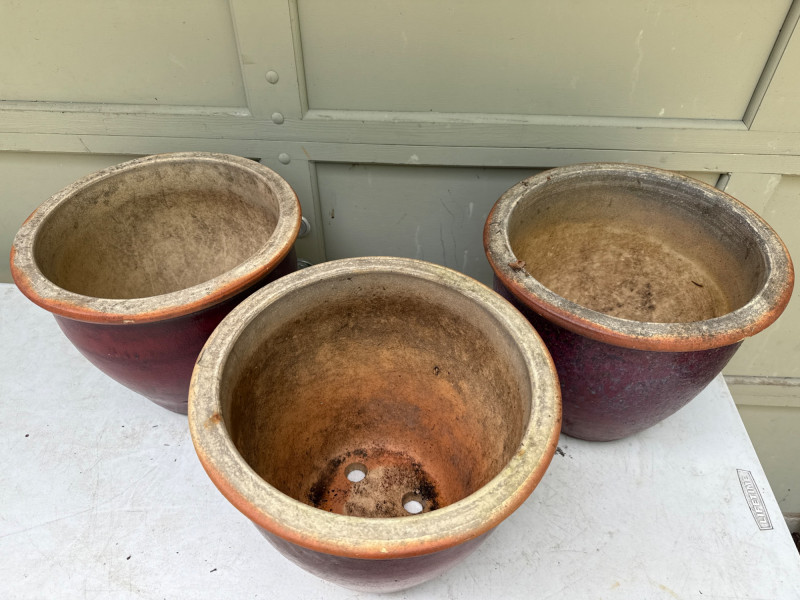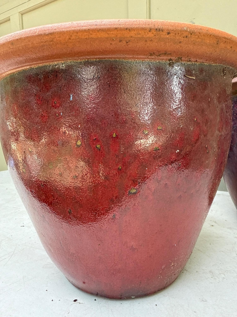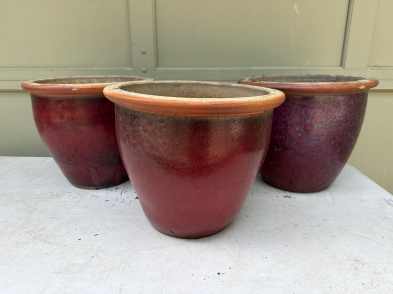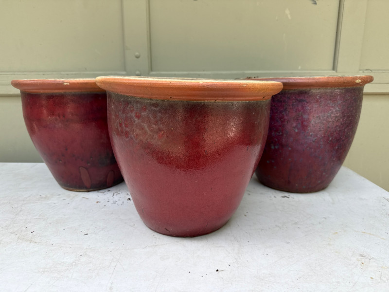 Red glazed ceramic plant pots. Three pots in good condition. Variety of color variations. Rims are not glazed Largest is 10.5in Tall and 12in wide